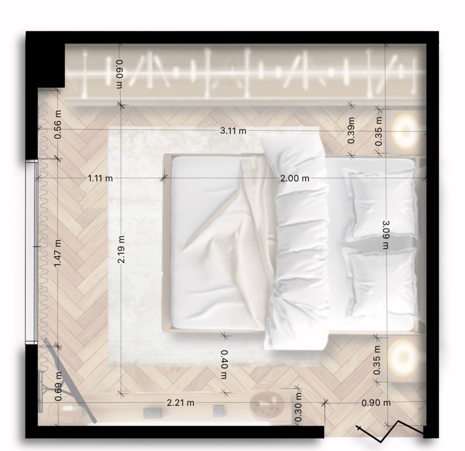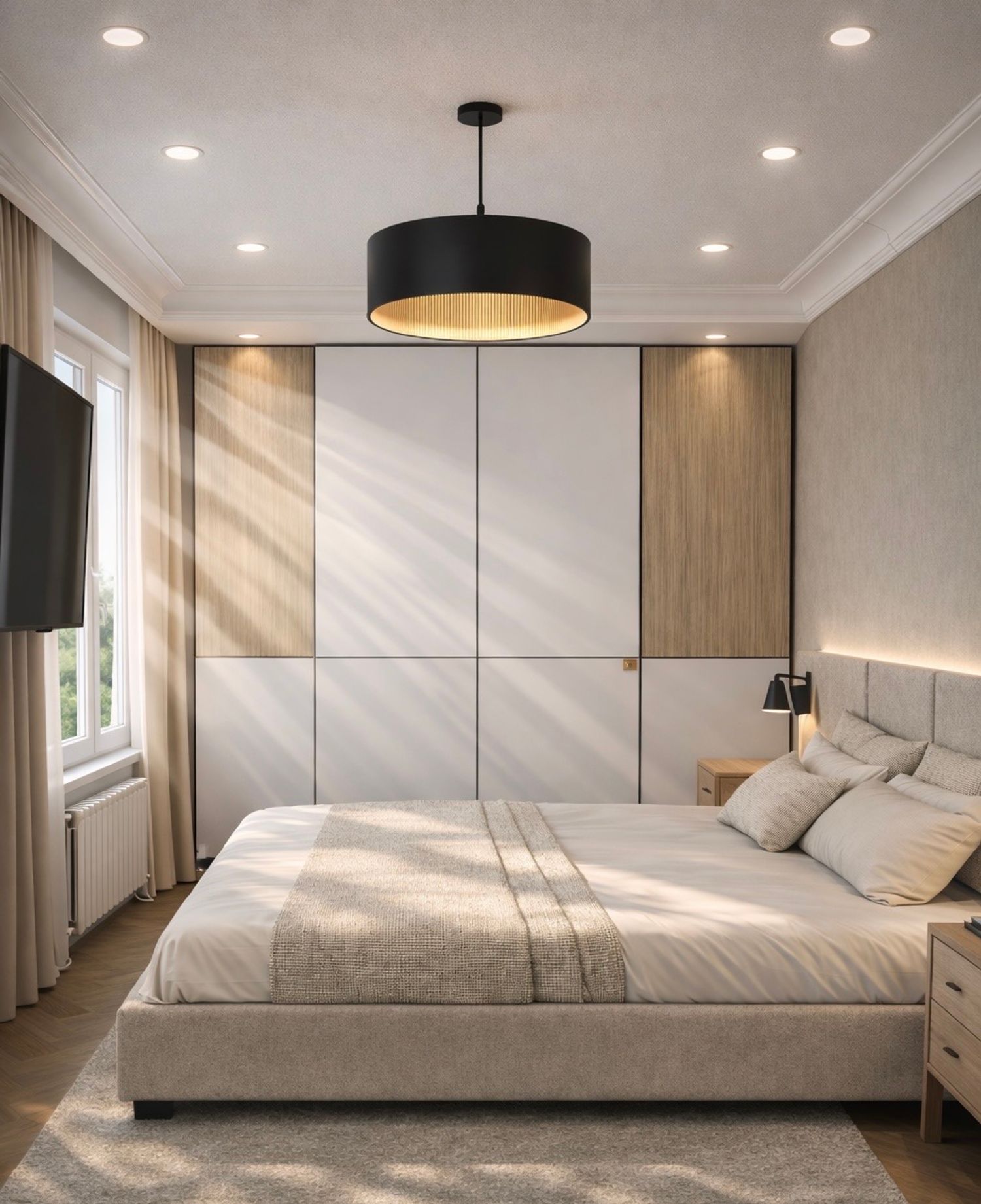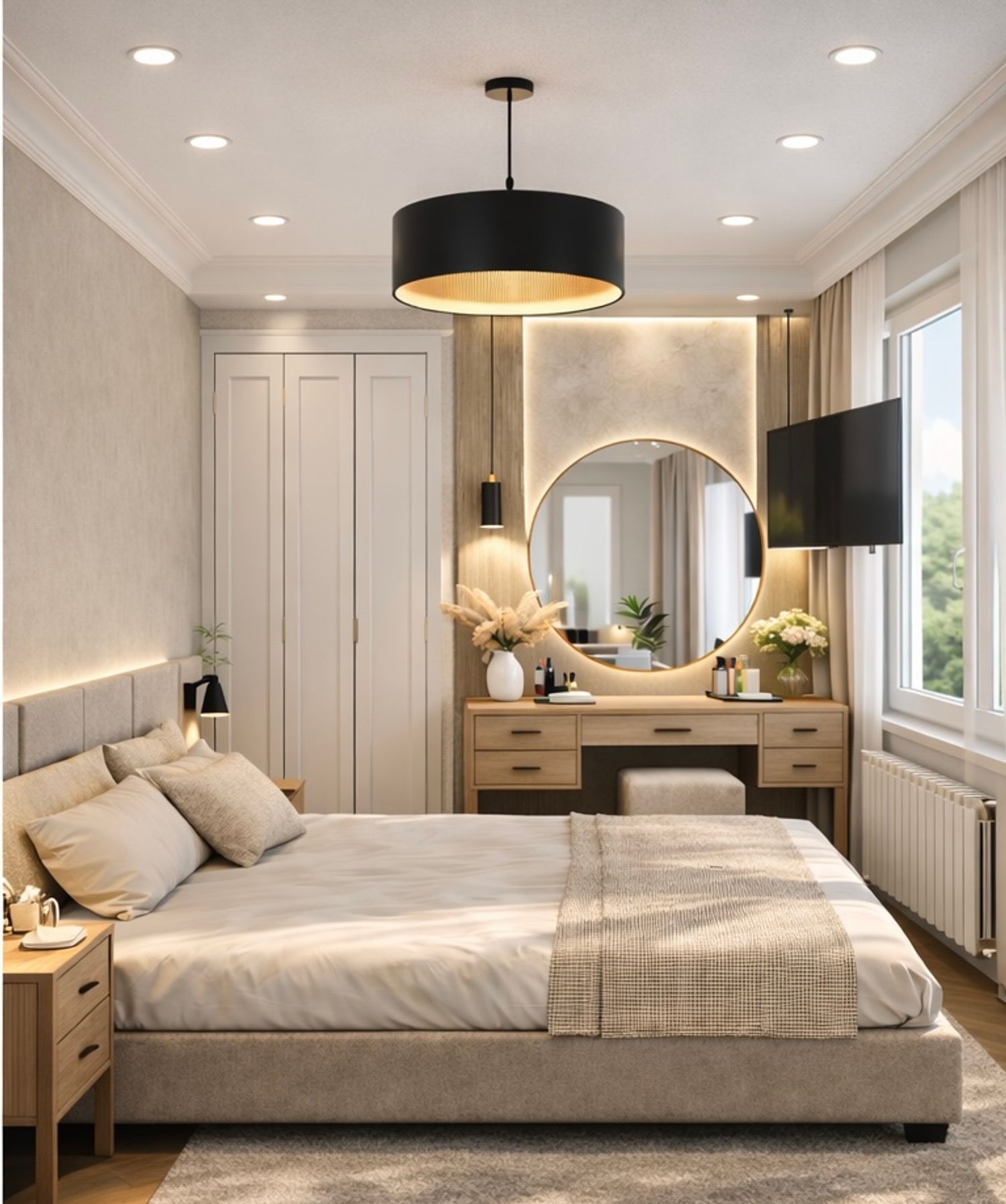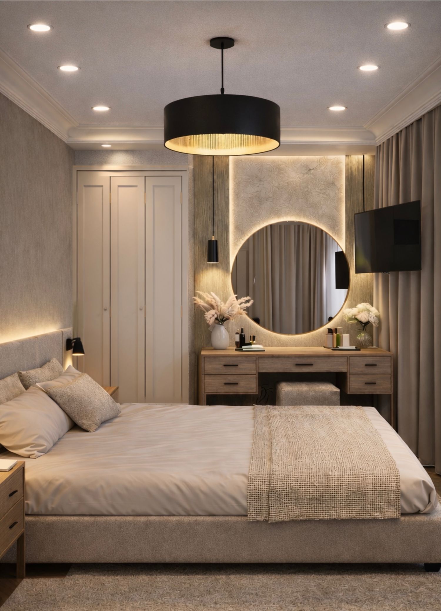 I also carefully integrated the TV and the vanity area in a smart and space-efficient way, allowing the room to remain functional while maintaining a clean and harmonious layout.