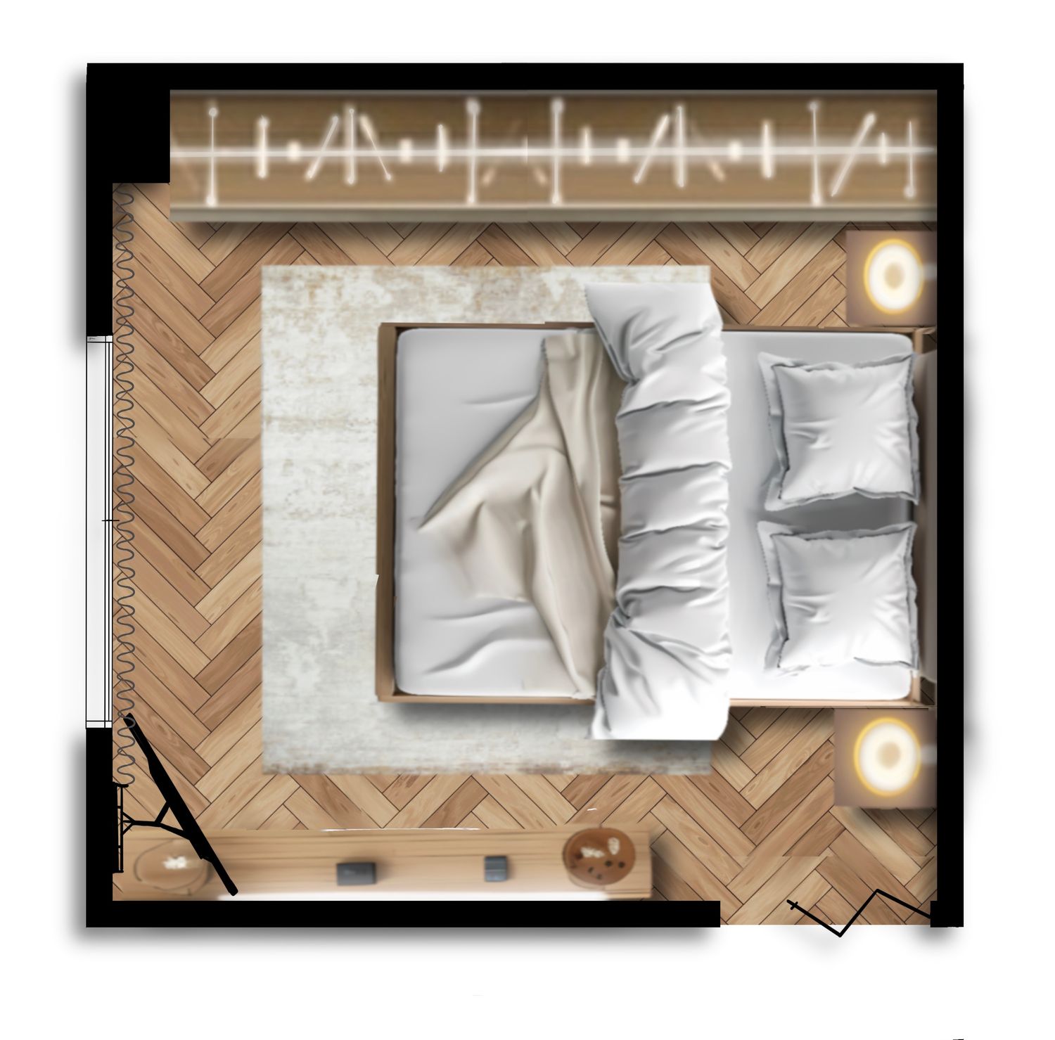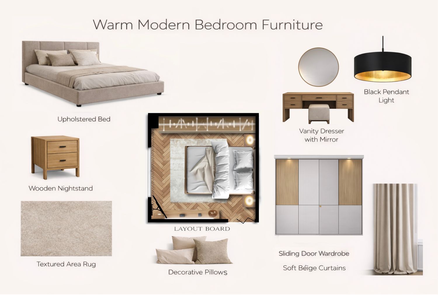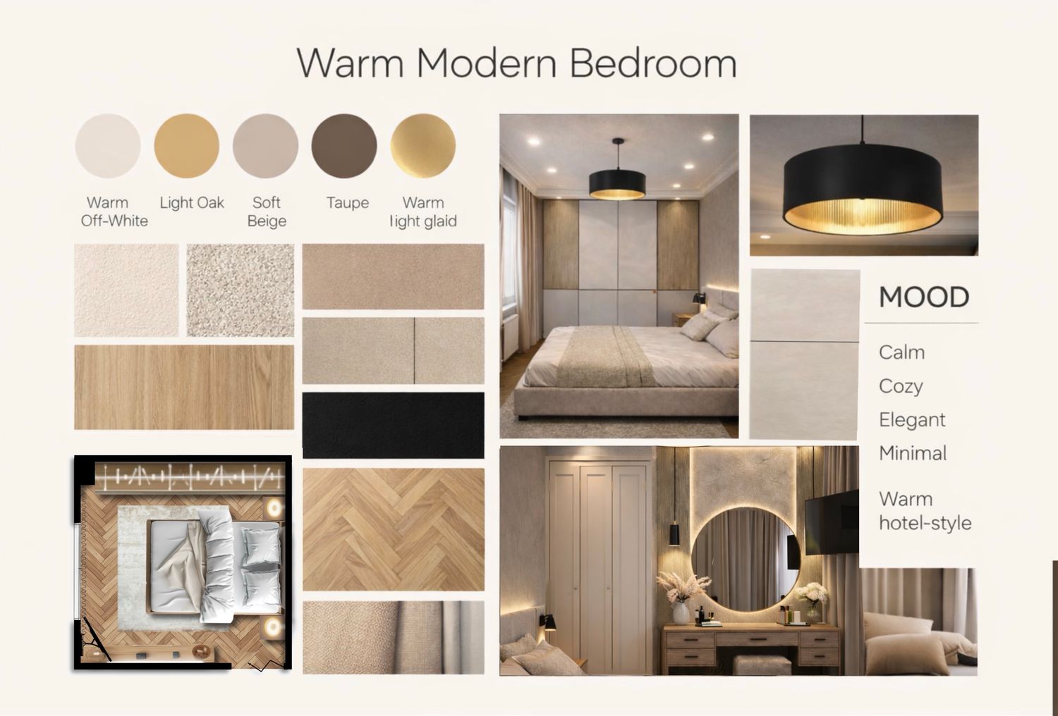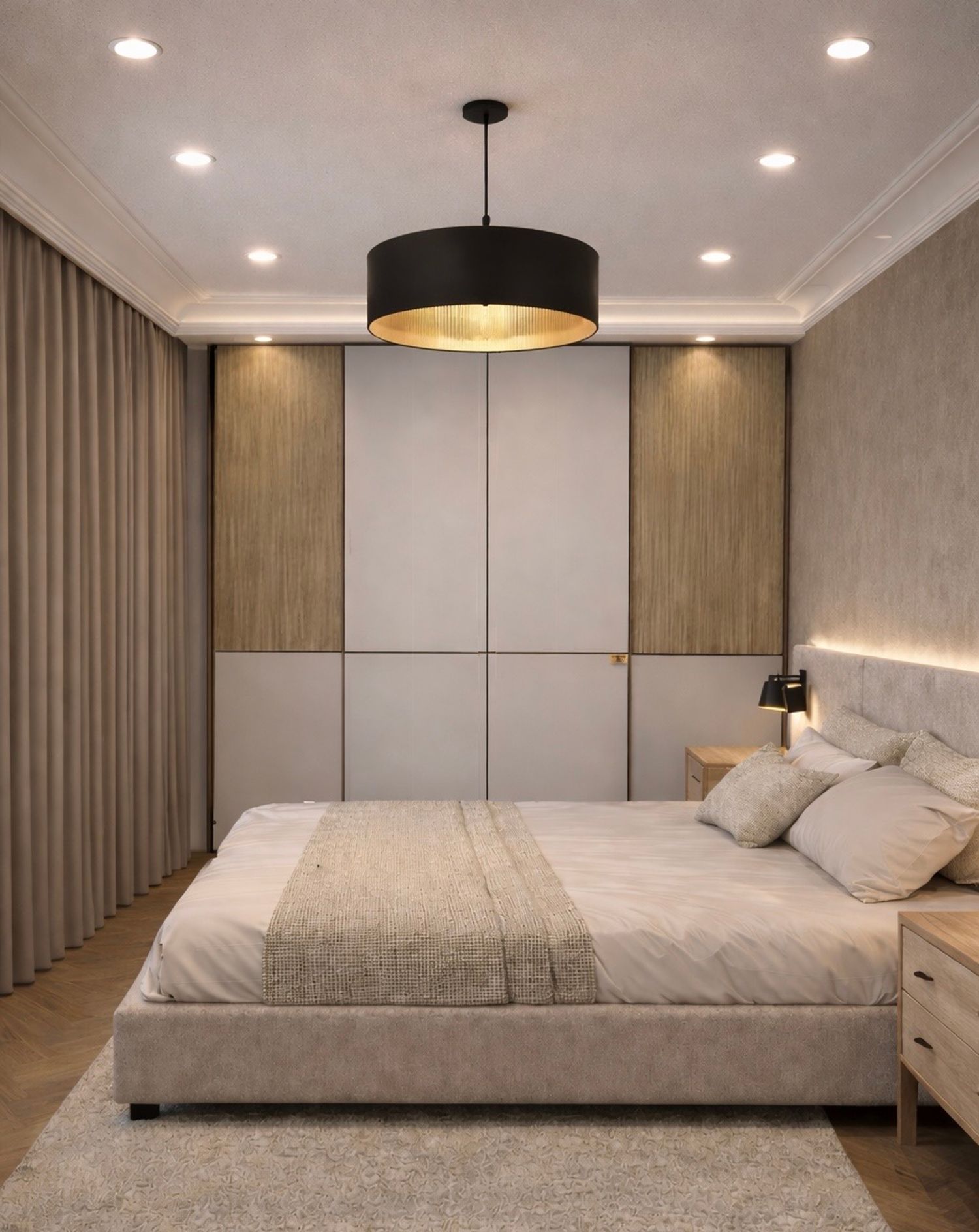For this bedroom design, I aimed to create a warm modern atmosphere that feels calm, elegant, and comfortable for everyday living.