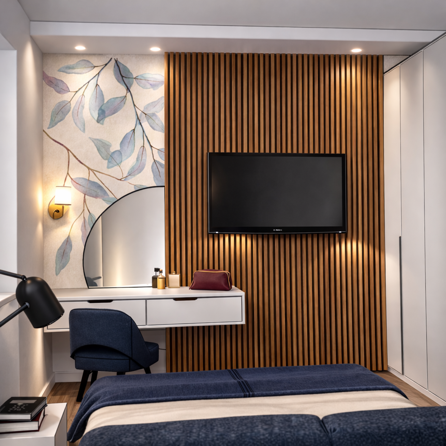 Di fronte al letto è stata ricavata una zona vanity composta da cassetti sospesi. Sopra il piano si appoggia uno specchio rotondo dalle linee morbide che contrasta con le geometrie rigorose dell’arredo. Lo sfondo è valorizzato da una carta da parati botanica dai toni delicati, che introduce una nota naturale e decorativa, rendendo l’angolo più intimo e personale.