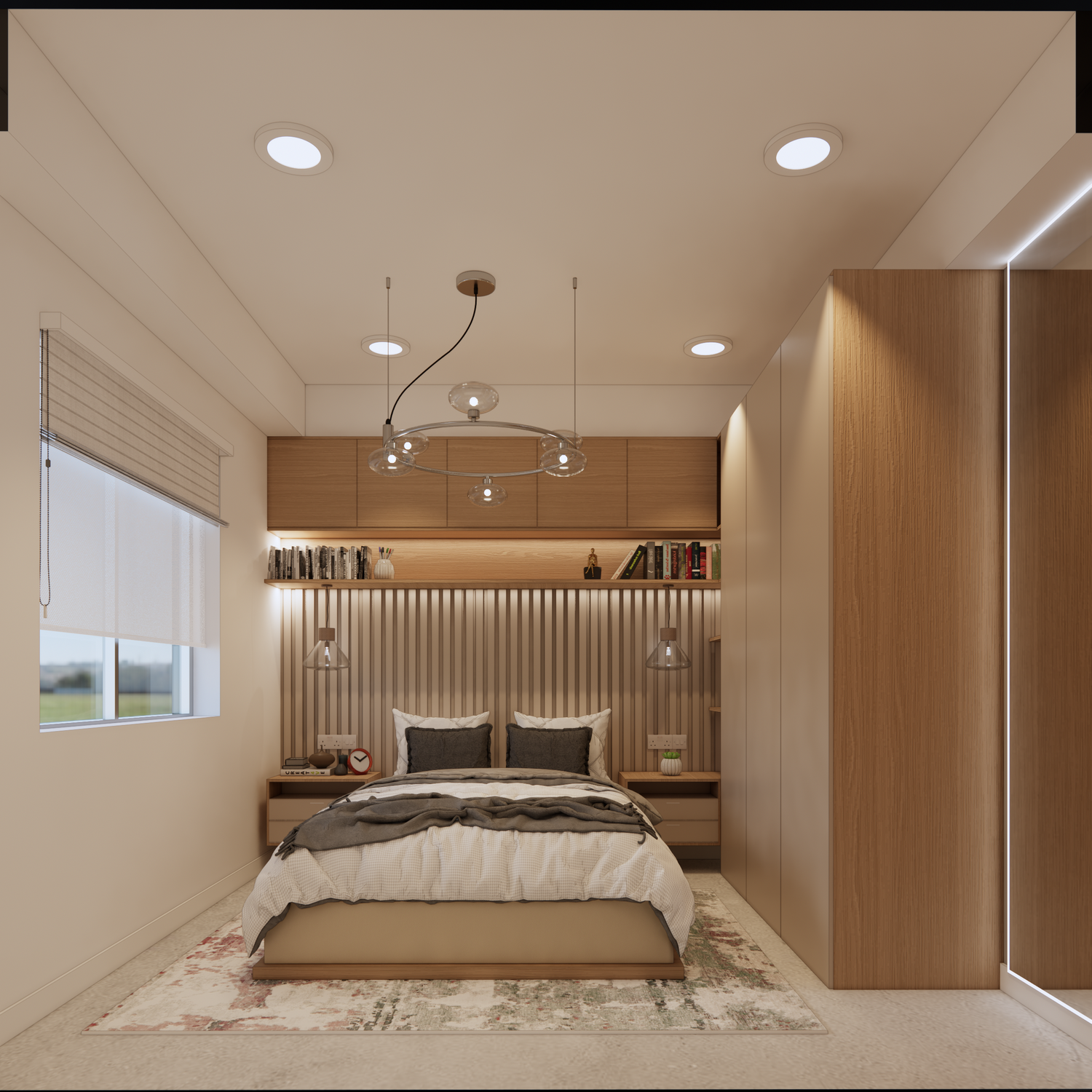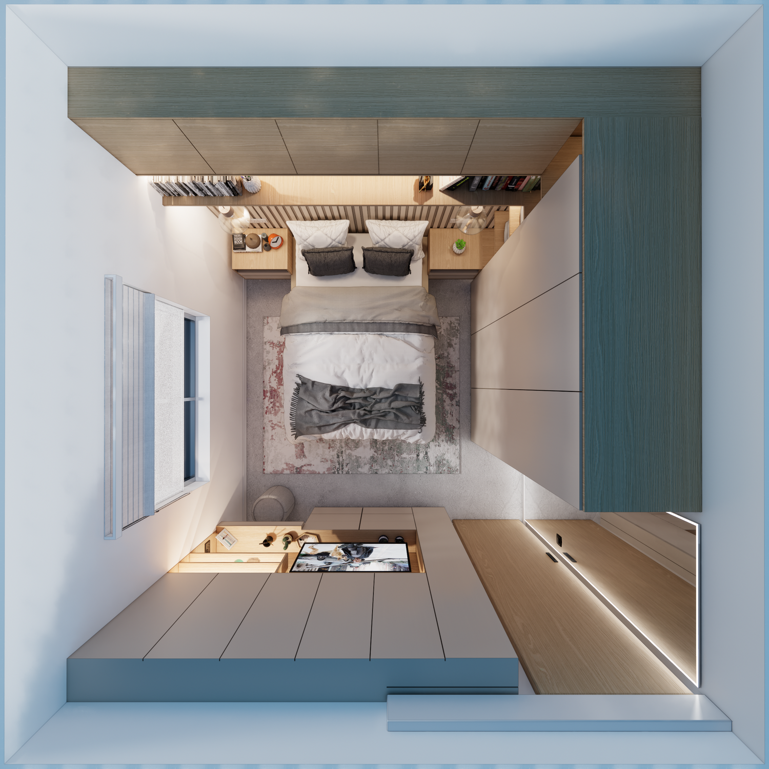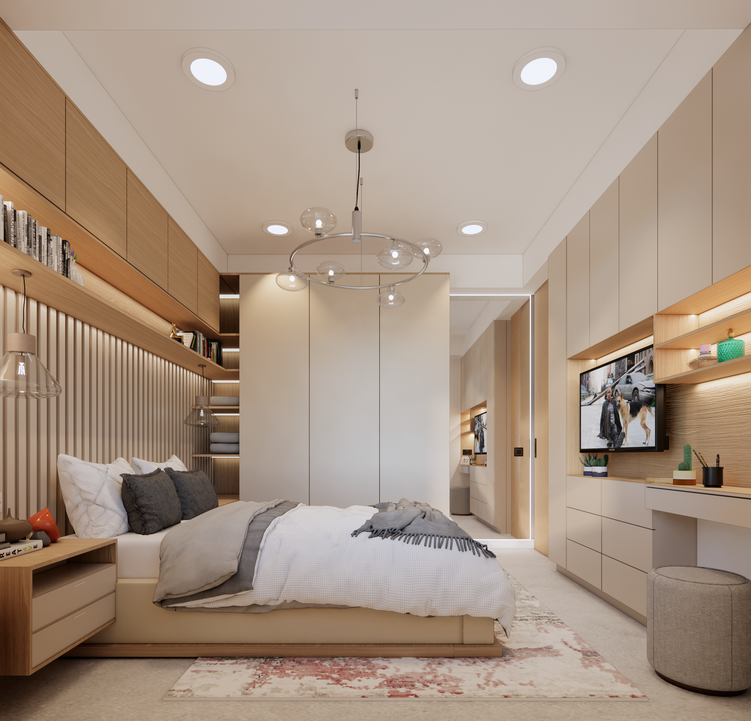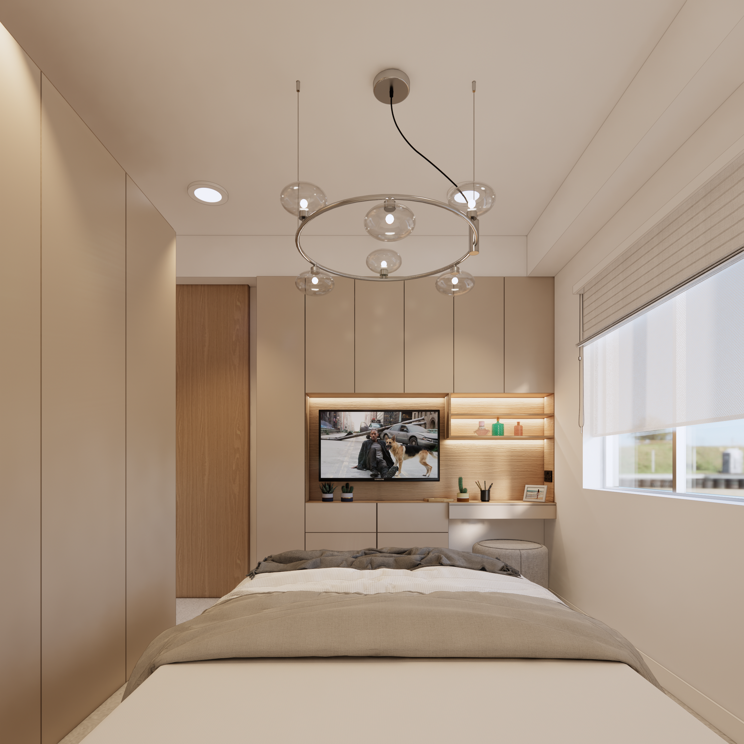 For the entrance door, we used a sliding pocket door that slides in a created wooden cavity behind the TV unit. The cavity is 80mm wide while the door is 70cm thick. This make its easier to access the room without using a swing or foldable door.