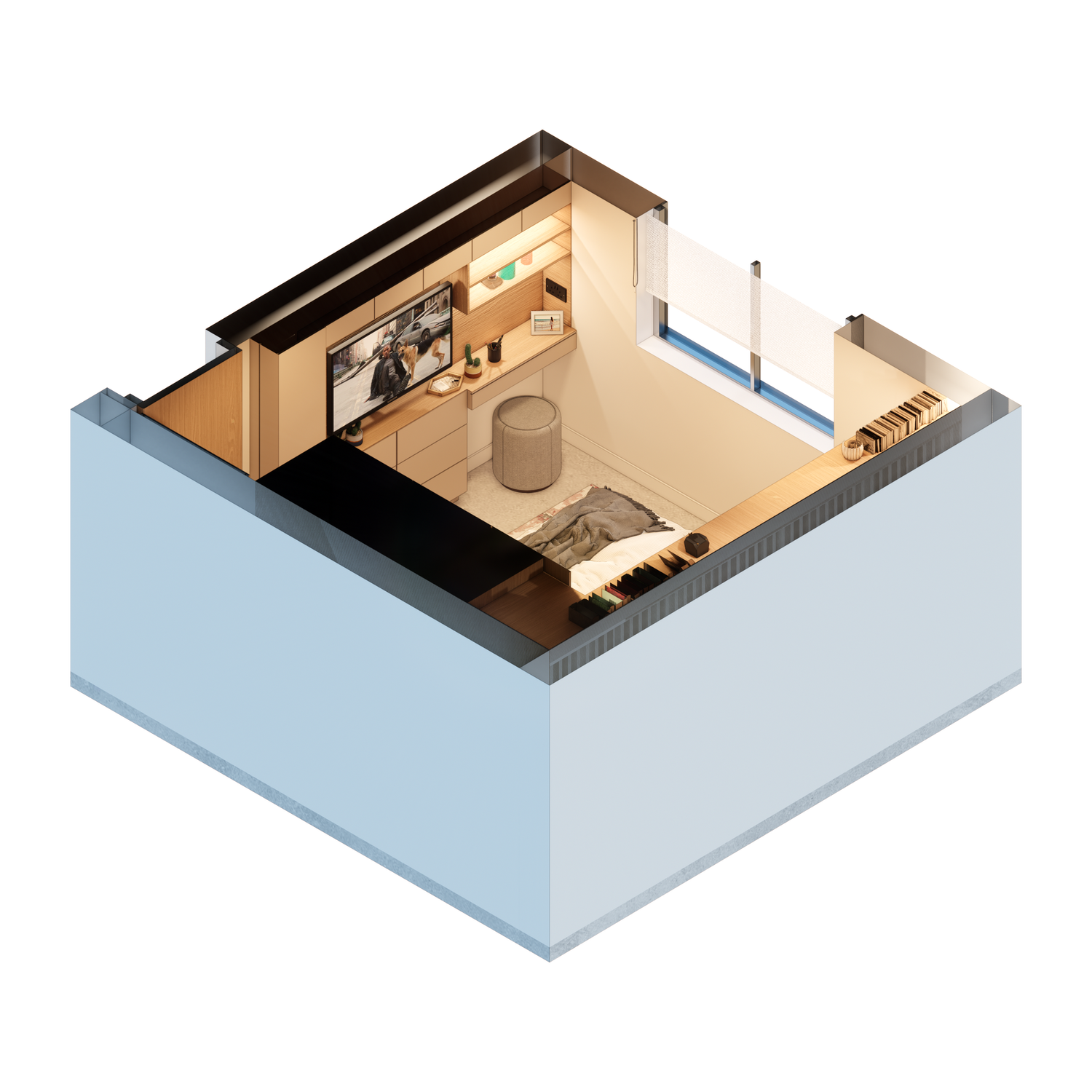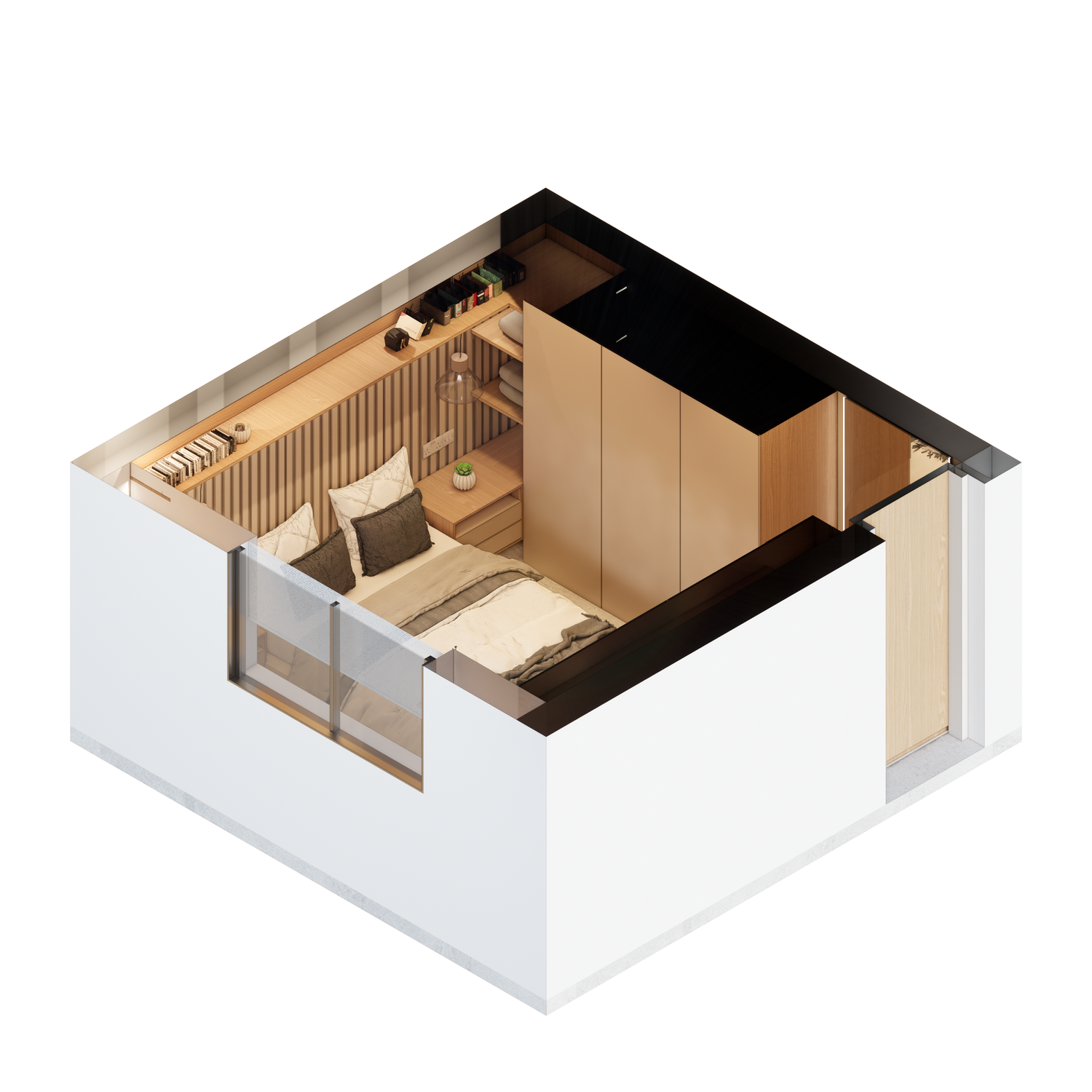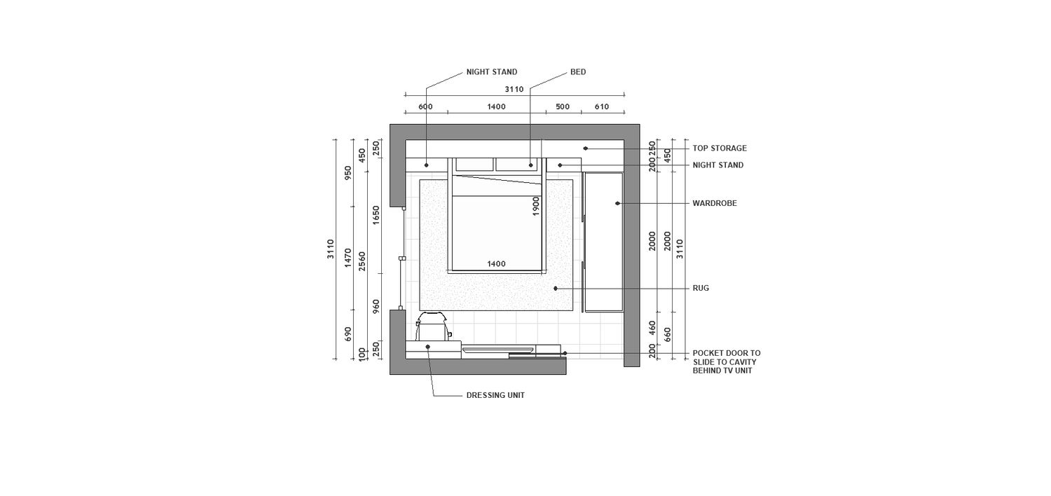 We used a wardrobe size 2m by 0.6m, bed size 1.4 by 1.9m, dresser 0.78m with enough closef and open storage above and beside the bed and on the tv unit.