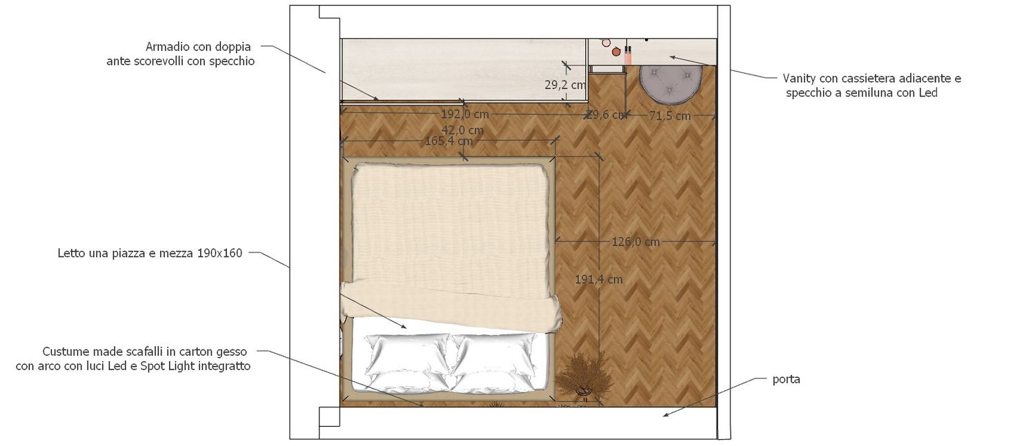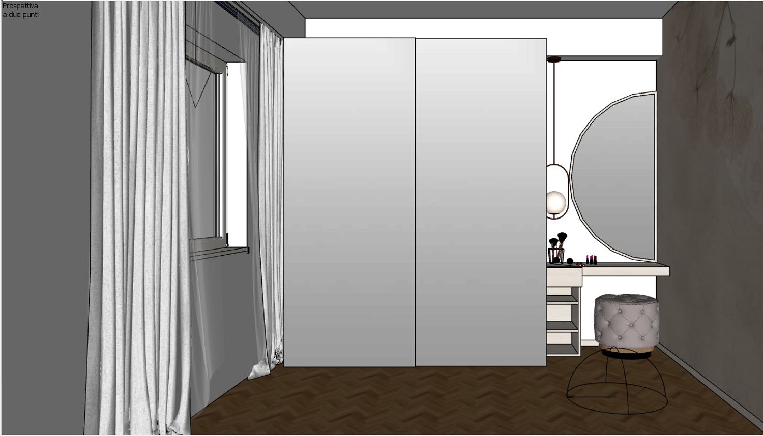 Particular attention has been given to the wardrobe design, conceived to provide generous storage capacity while maintaining a clean and discreet visual presence. Its position allows the space to be organized in a functional way without overwhelming the room.