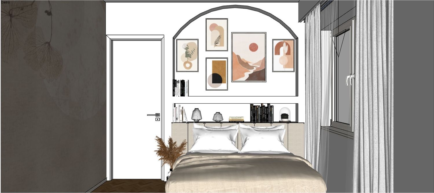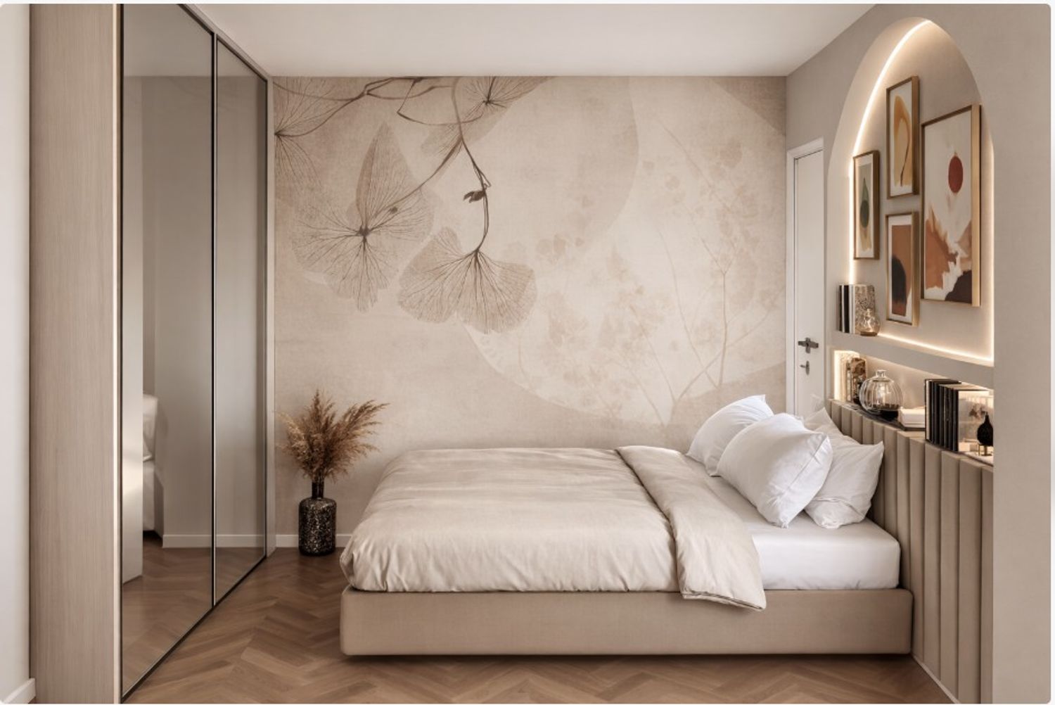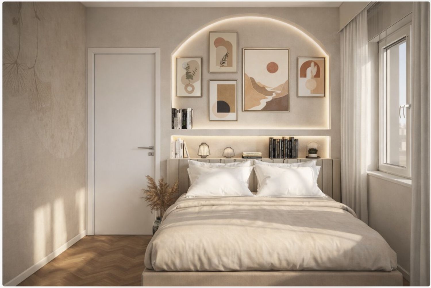 The bed wall becomes the visual focal point of the room thanks to an architectural solution featuring an arch and a storage niche that frames the sleeping area and adds depth to the space. This element allows the integration of shelves and decorative objects, creating an elegant and light focal point.
