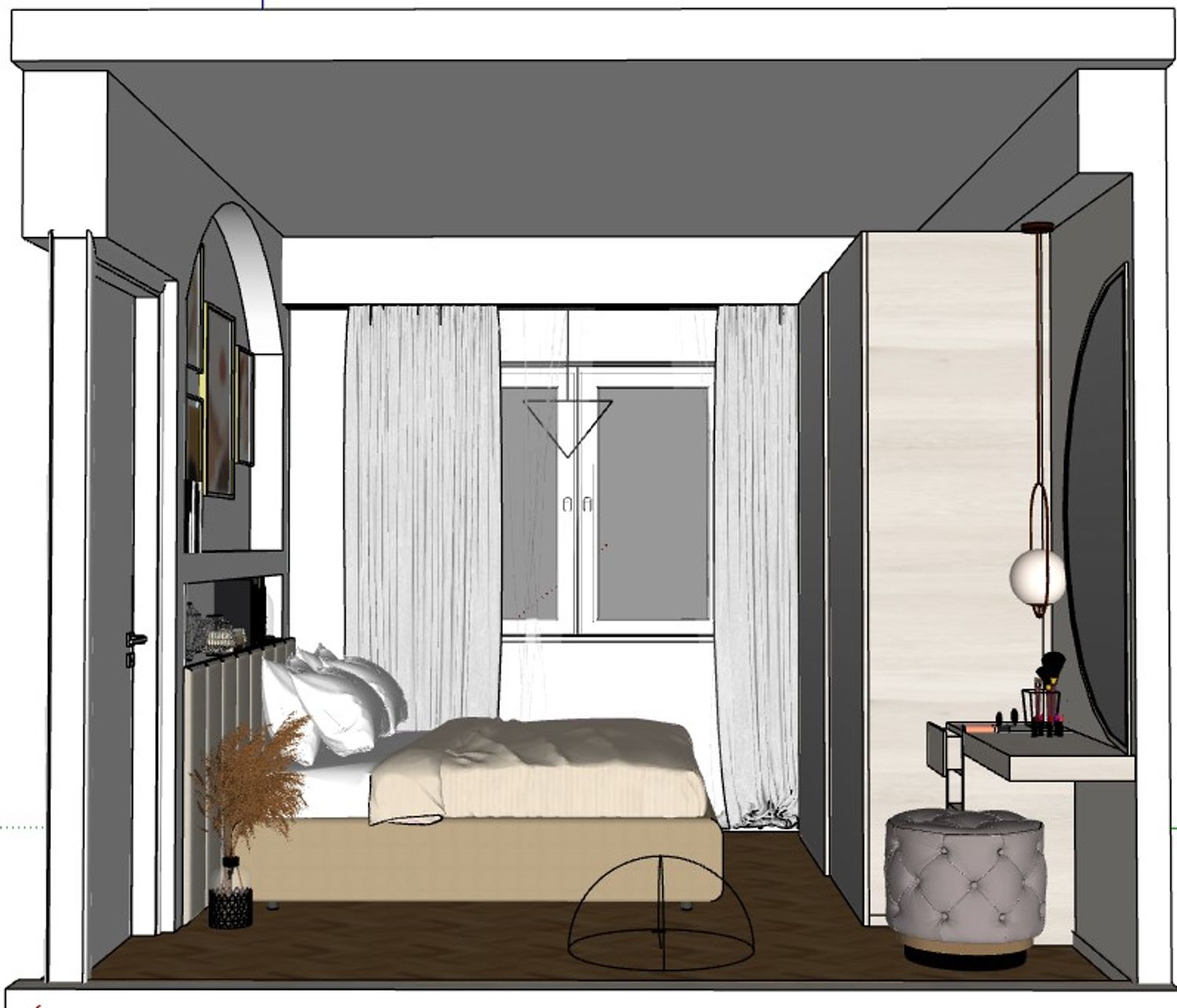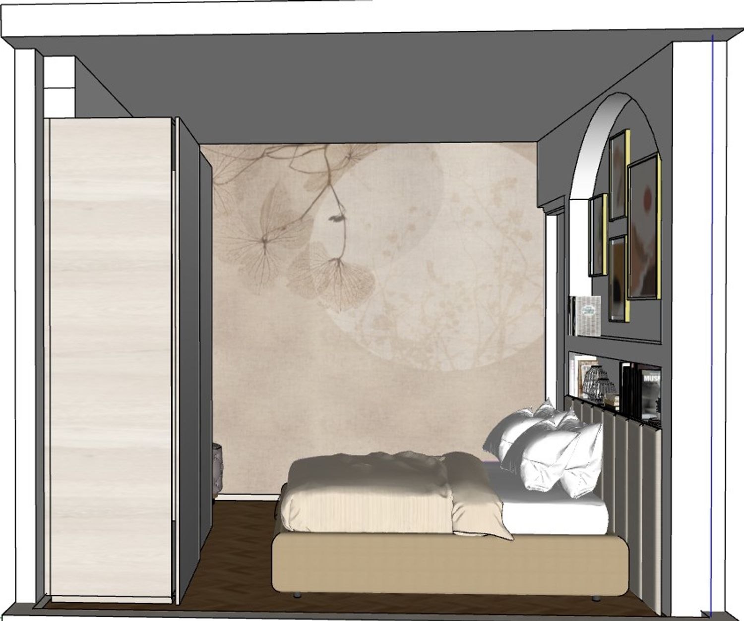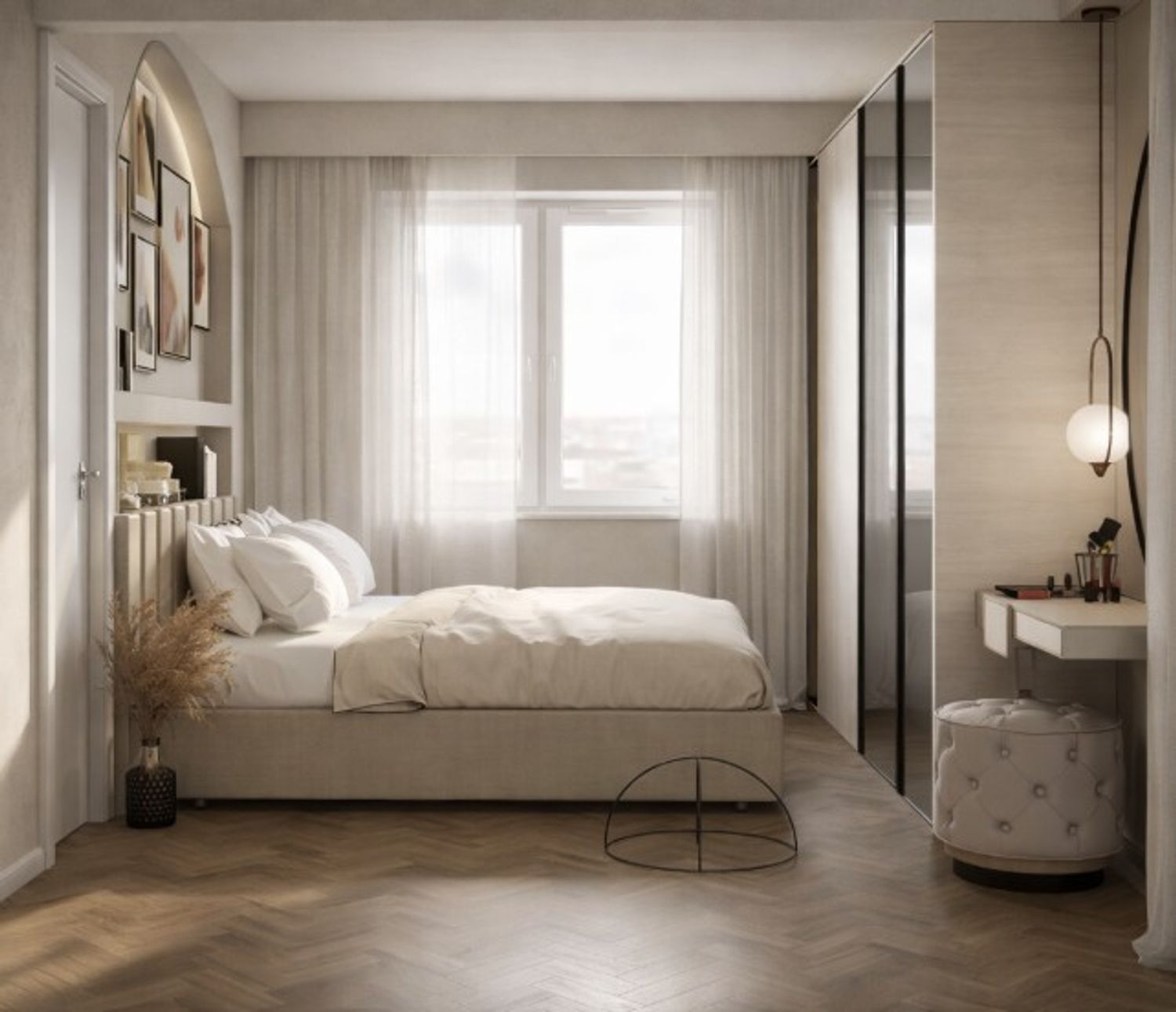 The bed wall becomes the visual focal point of the room thanks to an architectural solution featuring an arch and a storage niche that frames the sleeping area and adds depth to the space. This element allows the integration of shelves and decorative objects, creating an elegant and light focal point.