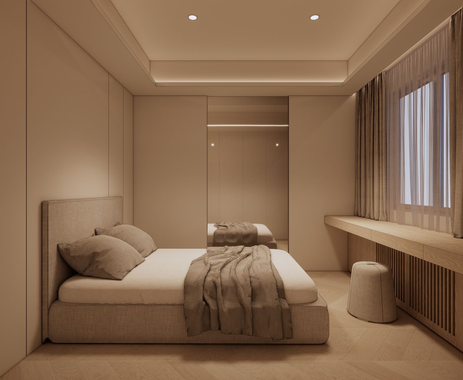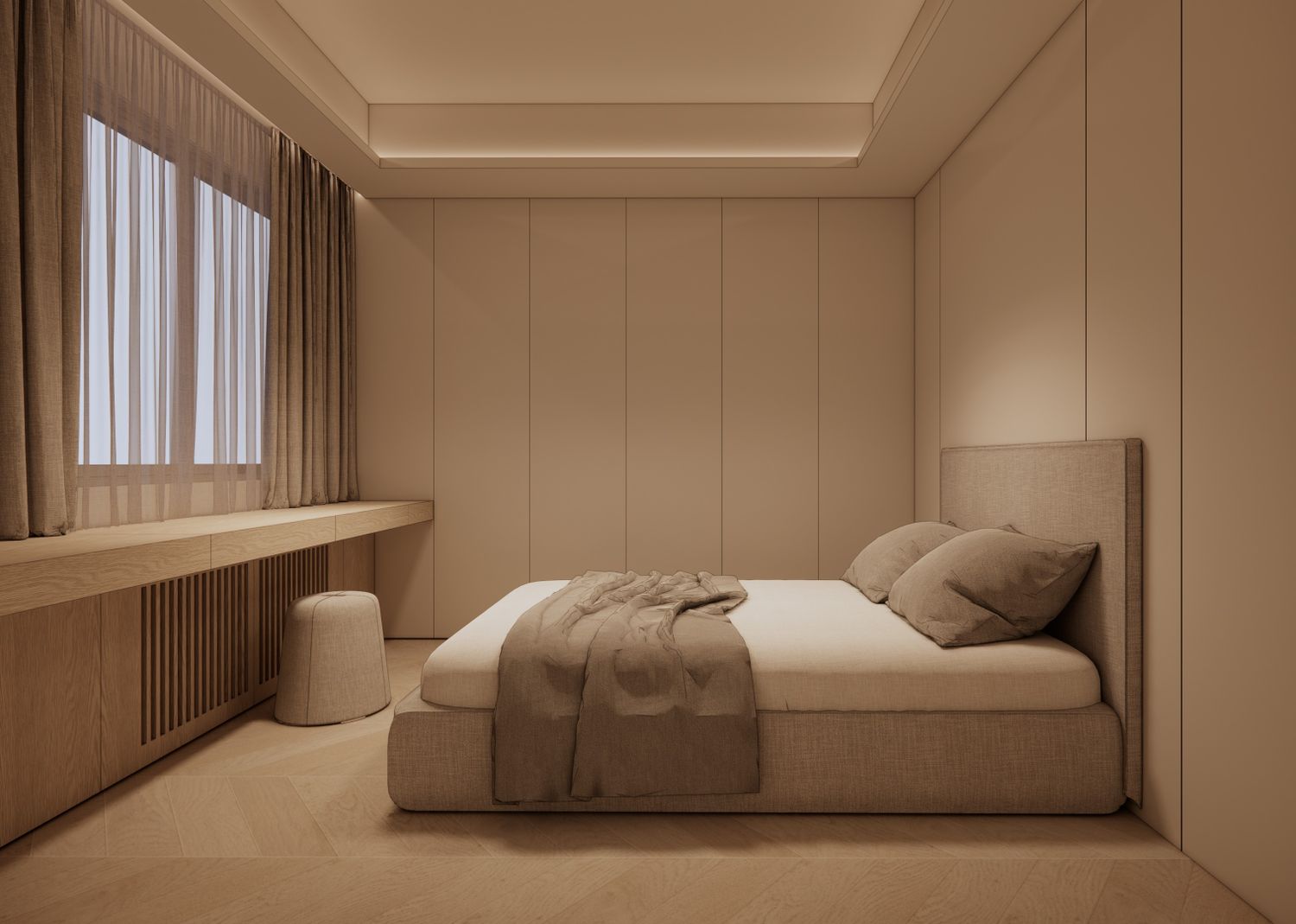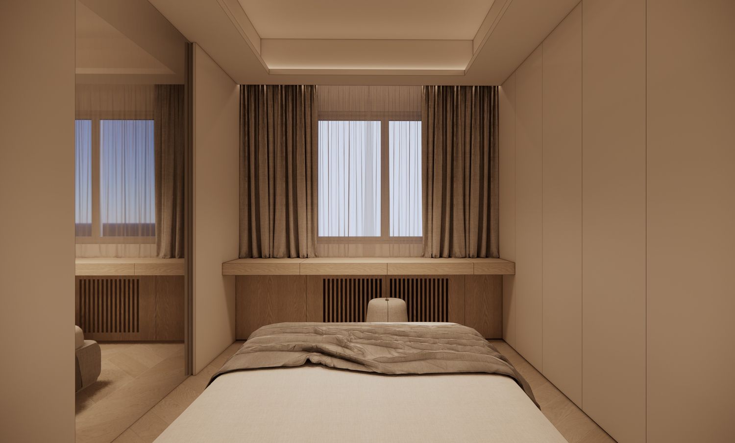 Seamless Smart Console (Functional Integration): The core of the room's spatial efficiency is the bespoke, elongated built-in console beneath the window. A hidden drawer system is engineered to conceal entertainment (a hidden TV) and a dedicated grooming area (an integrated makeup table). When not in use, these utilities disappear entirely, restoring the purity of the interior architecture.