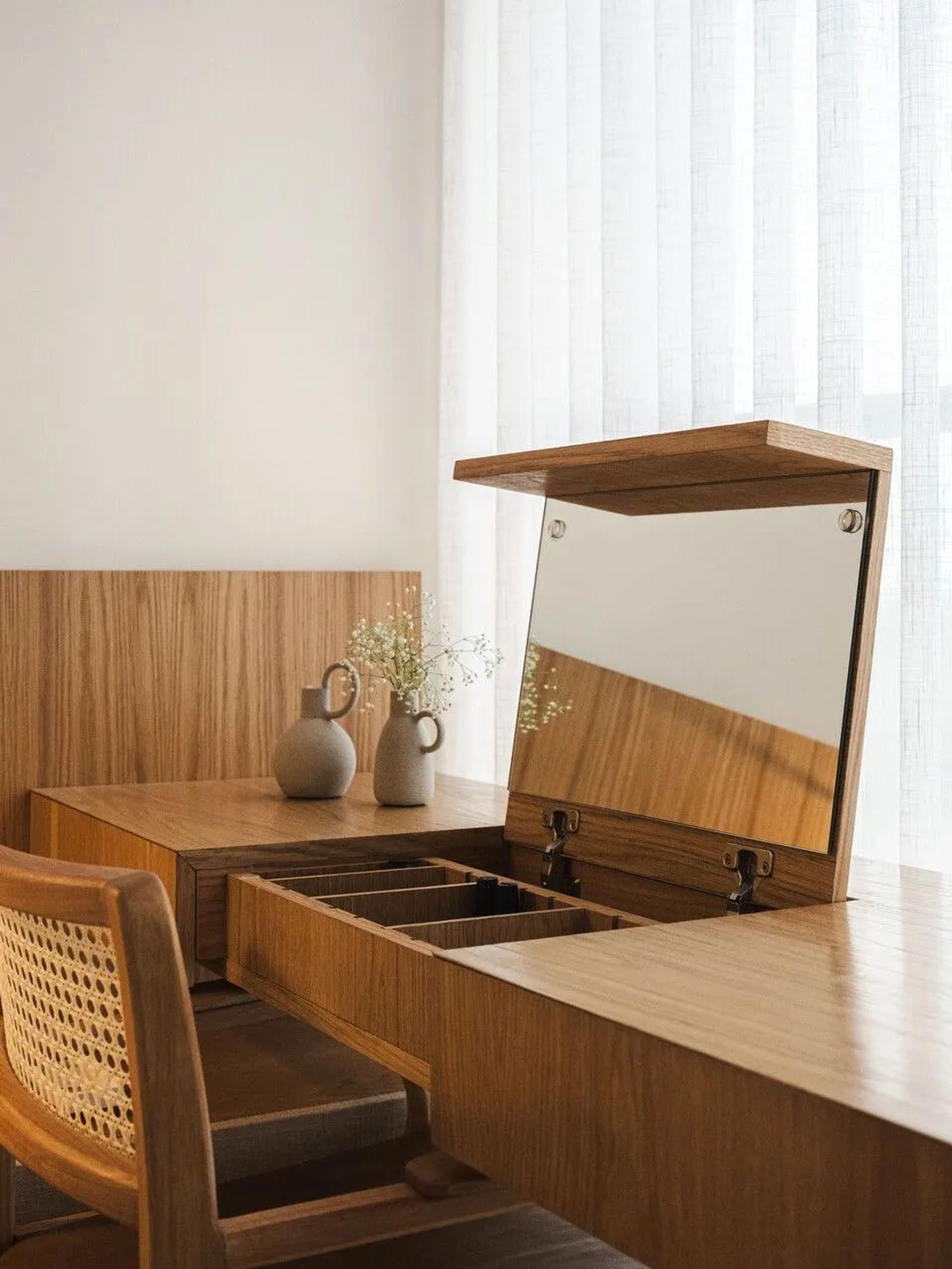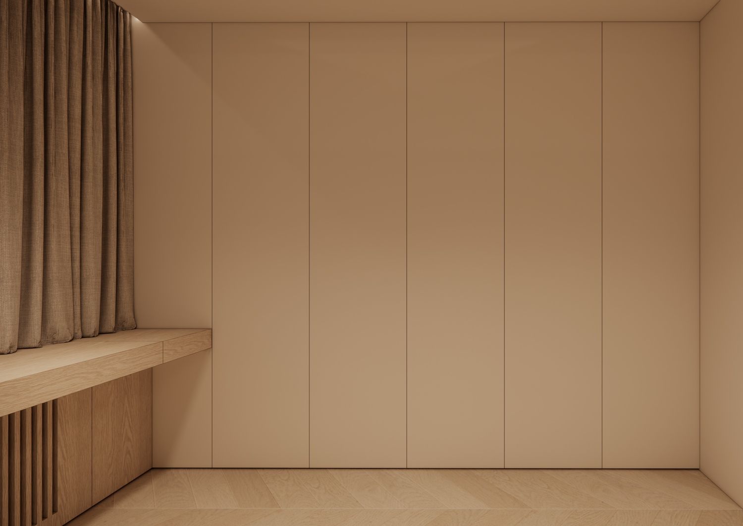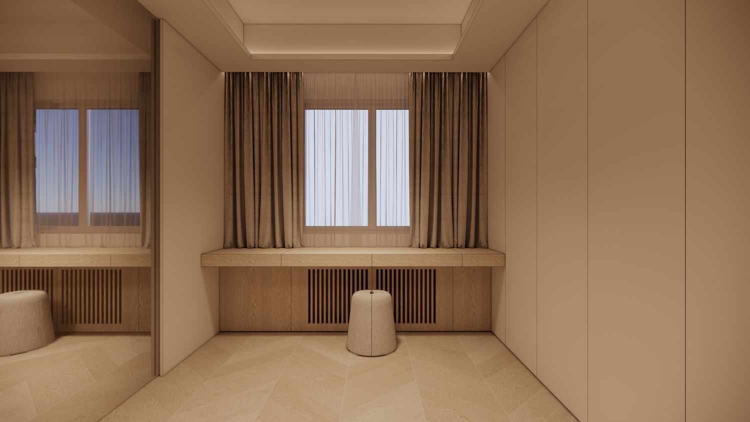 Seamless Smart Console (Functional Integration): The core of the room's spatial efficiency is the bespoke, elongated built-in console beneath the window. A hidden drawer system is engineered to conceal entertainment (a hidden TV) and a dedicated grooming area (an integrated makeup table). When not in use, these utilities disappear entirely, restoring the purity of the interior architecture.