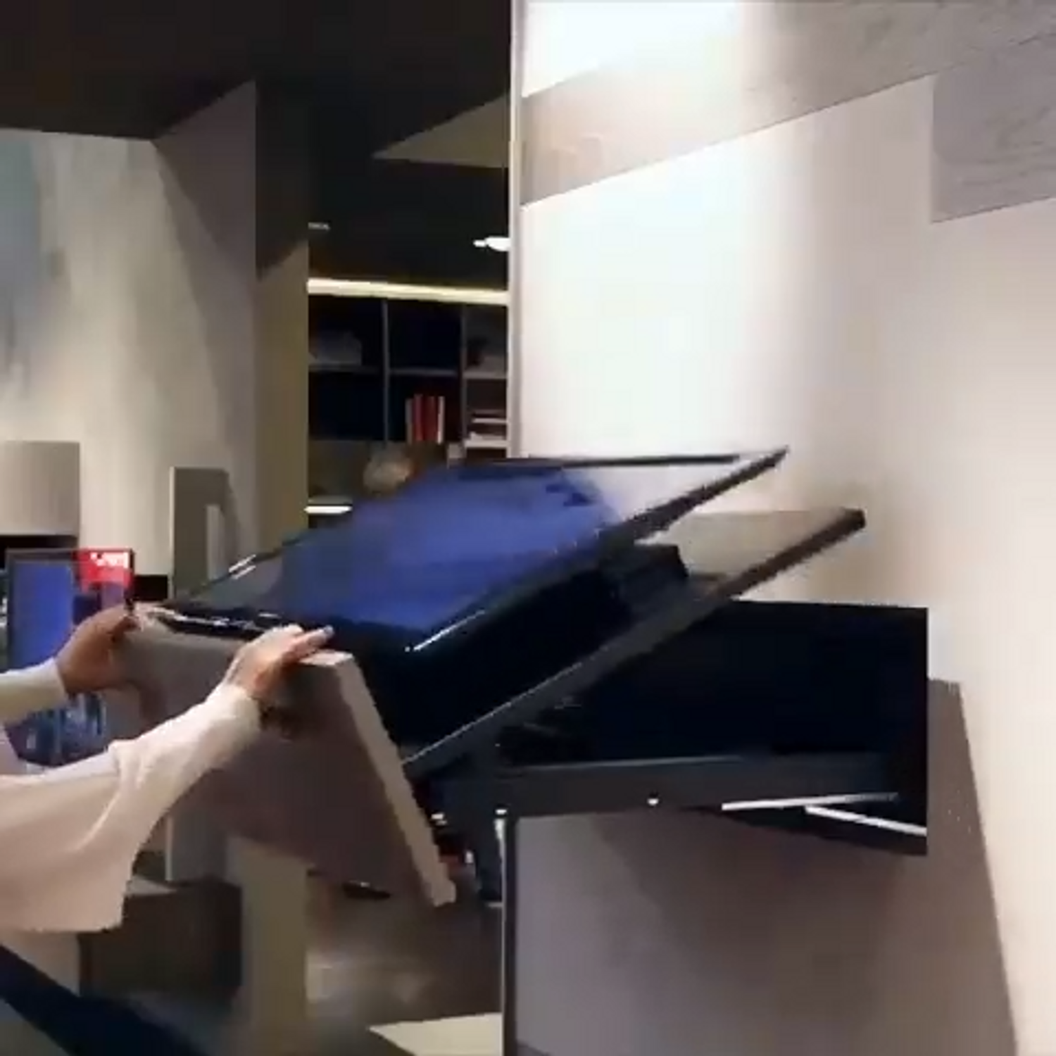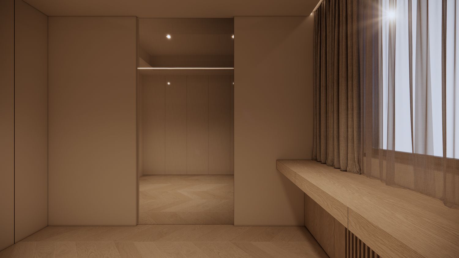 Zero-Clearance Circulation (Footprint Optimization): The primary entrance utilizes a sliding ghost door system with concealed tracks. This innovation entirely eliminates the dead space typically required by a conventional swing door's radius. It maximizes the circulation path while preserving the monolithic, seamless visual integrity of the wall panels.