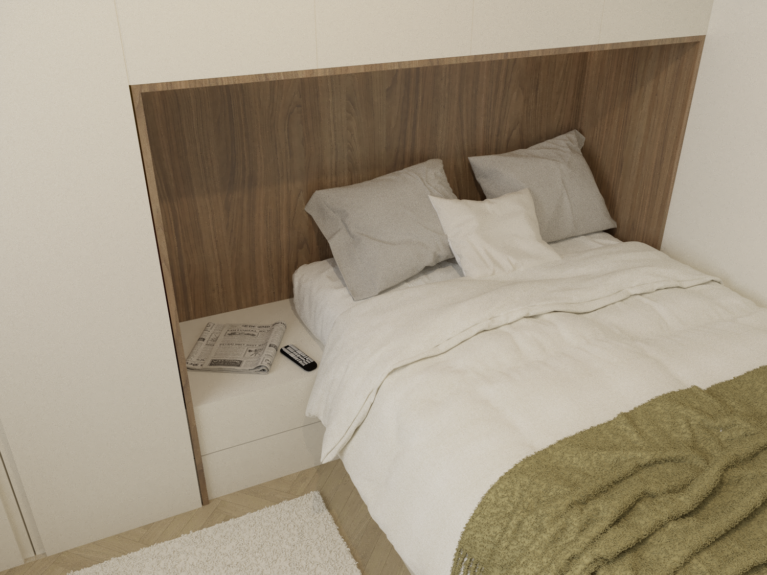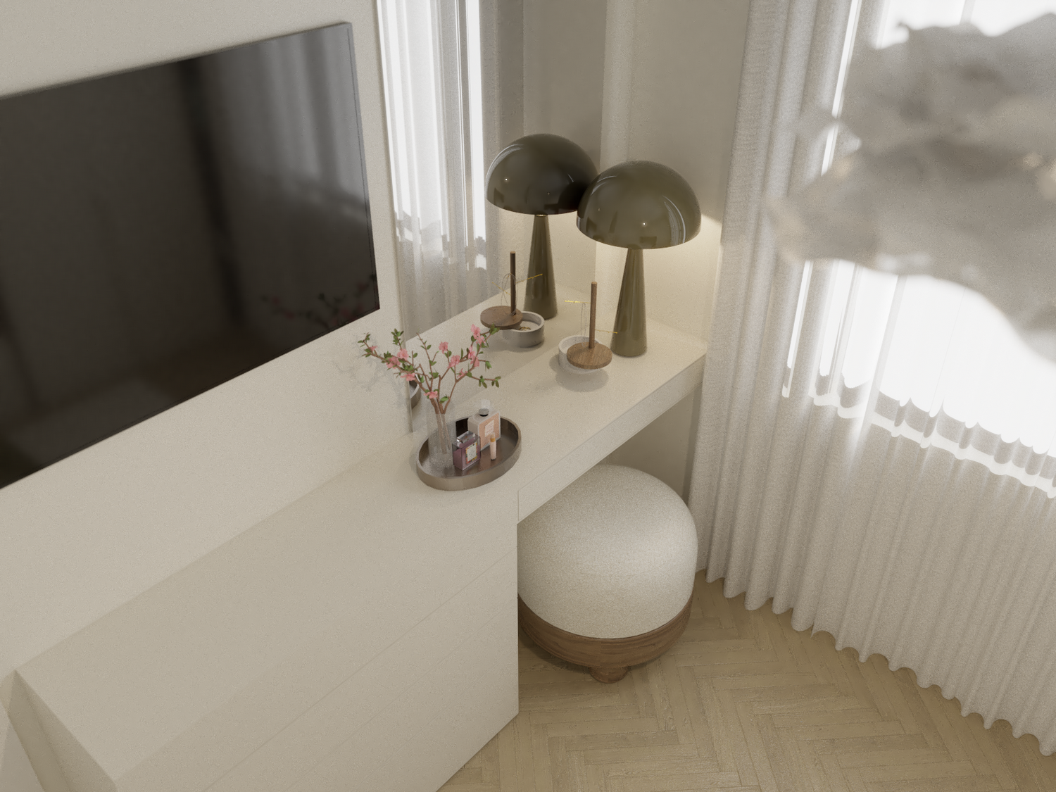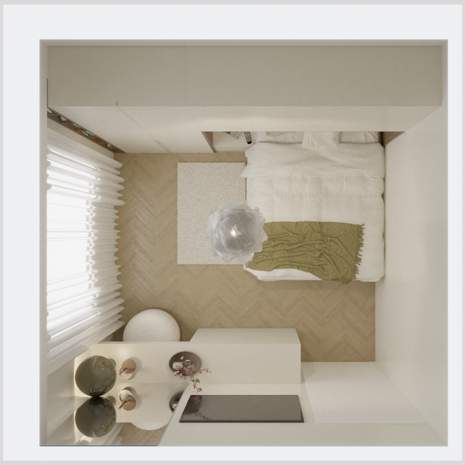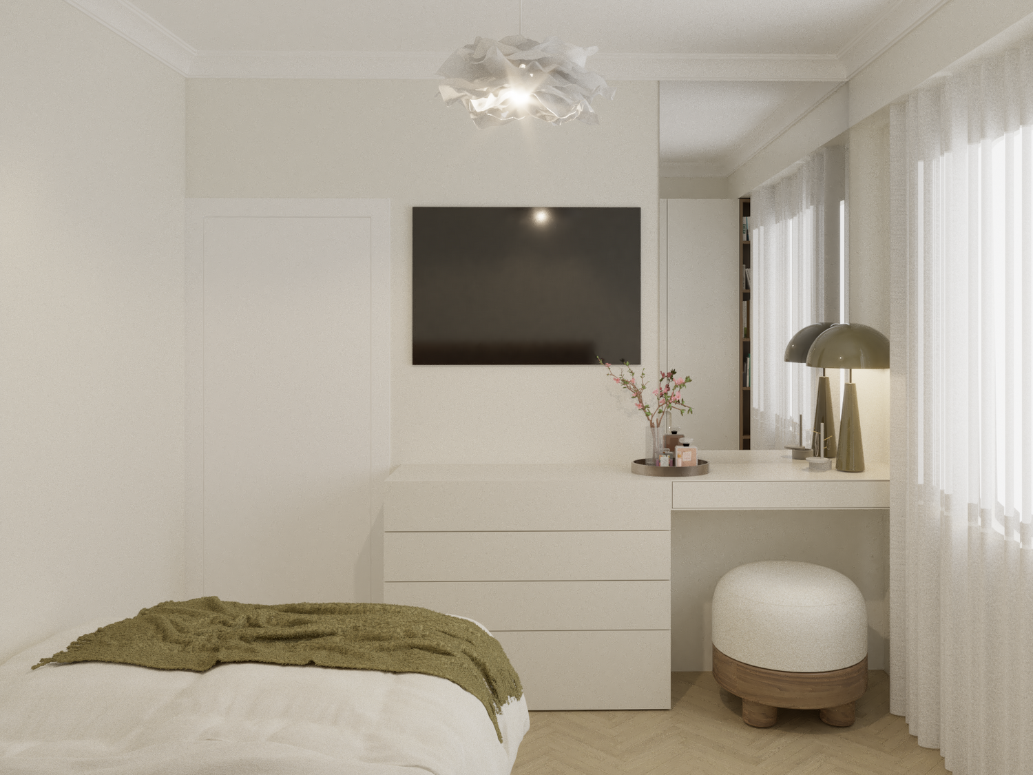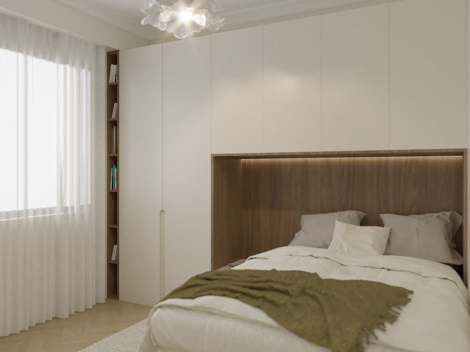 Sfruttare al massimo lo spazio disponibile, senza però rinunciare a confort ed eleganza. Il progetto sfrutta al massimo lo spazio disponibile all'interno della camera da letto, che presenta un ampio armadio, che continua sui pensili, dando vita ad un accogliente letto a ponte, con boiserie in legno con illuminazione, comoda cassettiera, e, terminale, una piccola libreria, che definisce lo spazio e sfrutta anche la piccola nicchia risultante dalla presenza del pilastro. Ad accompagnare il passaggio dal lato opposto della camera, un binario a soffitto, valorizza e crea una quinta scenografica ed elegante lungo la parete in cui si trova la grande finestra, fino ad arrivare alla parete in cui troviamo una comoda zona beauty, con specchio a tutta altezza, che amplia lo spazio riflettendo la finestra, e di conseguenza ne amplifica la luminosità. La scrivania con cassetto integrato, è fiancheggiata da una comoda cassettiera. La disposizione della camera in questo modo lascia spazio alla luce, ma non sacrifica il contenimento. Il letto alla francese, da 140cm, con contenitore, contribuisce ad aumentare il volume di contenimento, per uno spazio funzionale, fresco ed elegante.