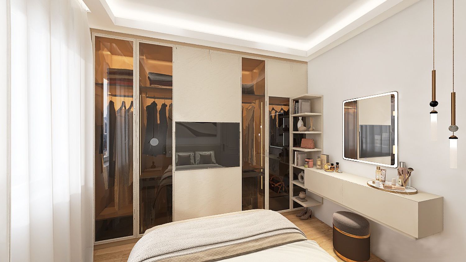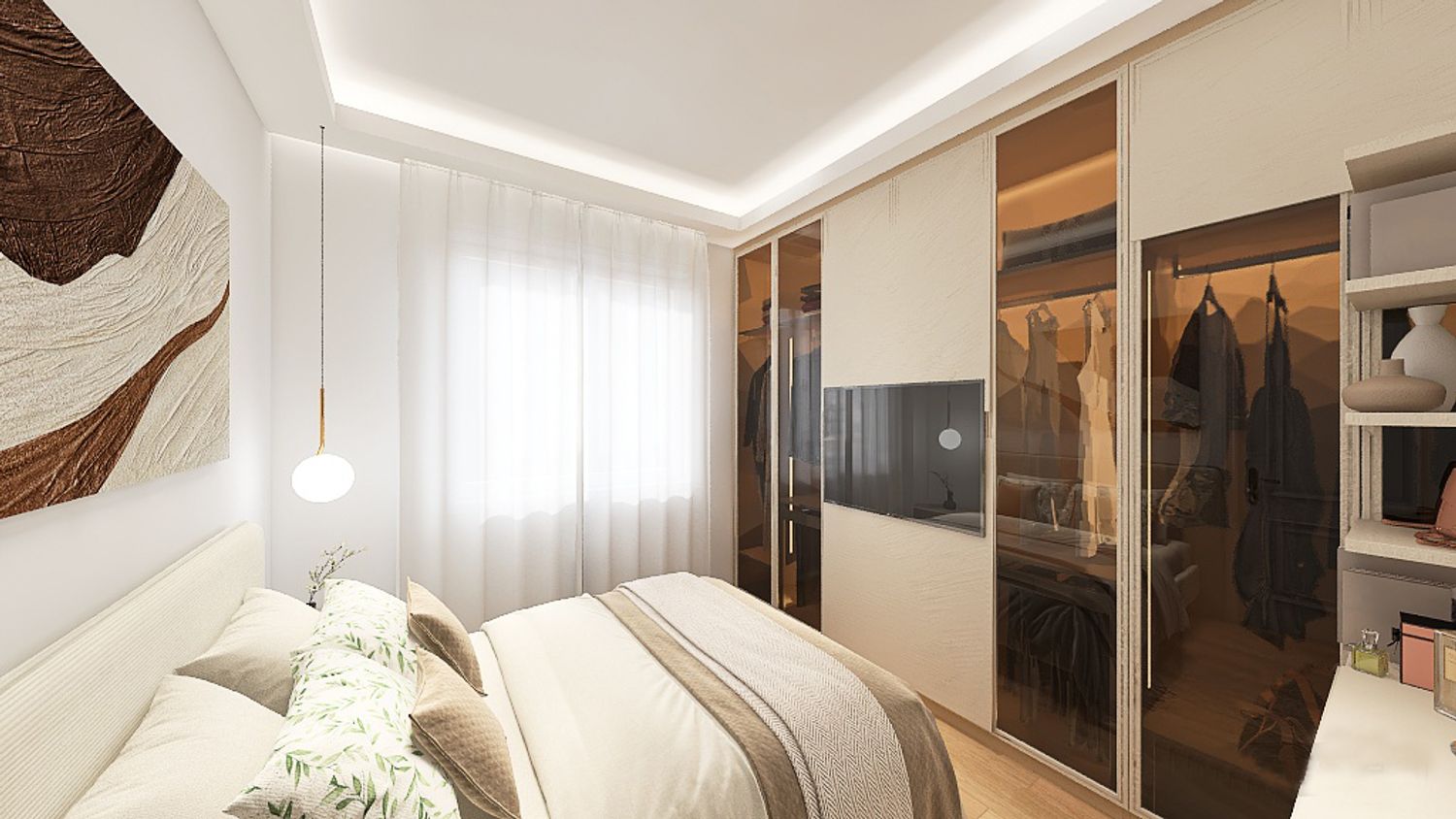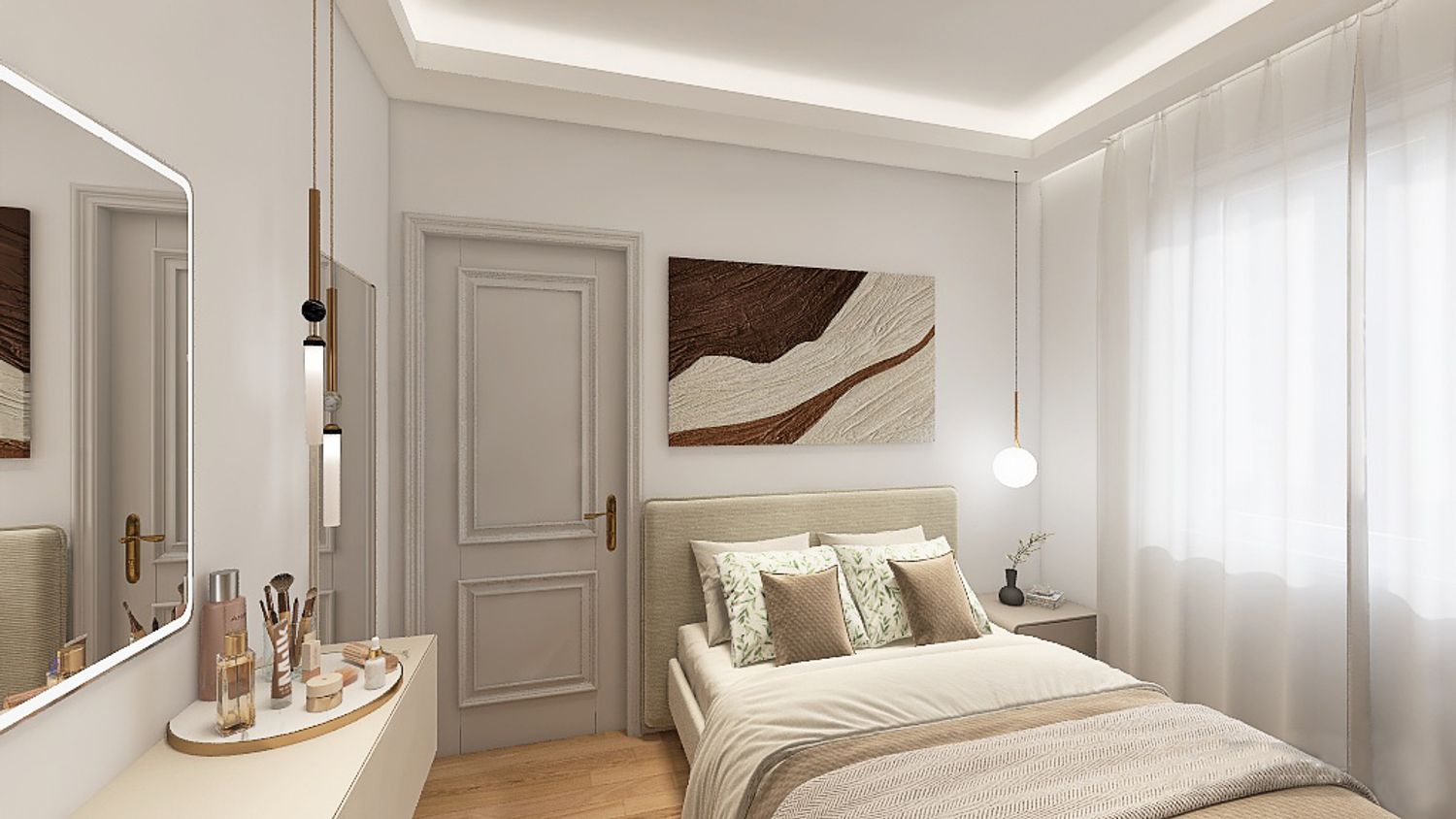 Progetto di una camera elegante, con un armadio a tutta altezza con parti con ante vetrate per dare maggiore profondità alla stanza. Per la tv si opta per un pannello scorrevole come anta dell'armadio che fa da appoggio per lo schermo. Un lato della stanza dedicato alla zona trucco con mensole per poggiare accessori e specchi. Il letto con testiera ed il proprio comodino. Per quanto riguarda l'illuminazione, delle velette servono sia per una illuminazione diffusa sia per coprire il bastone delle tende. Il tutto incornicia la stanza e ridà una geometria nascondendo le travi e pilastri a vista. Inoltre per una illuminazione più puntuale, due luci a sospensione sul comodino ed una doppia per zona trucco e specchio lungo.
