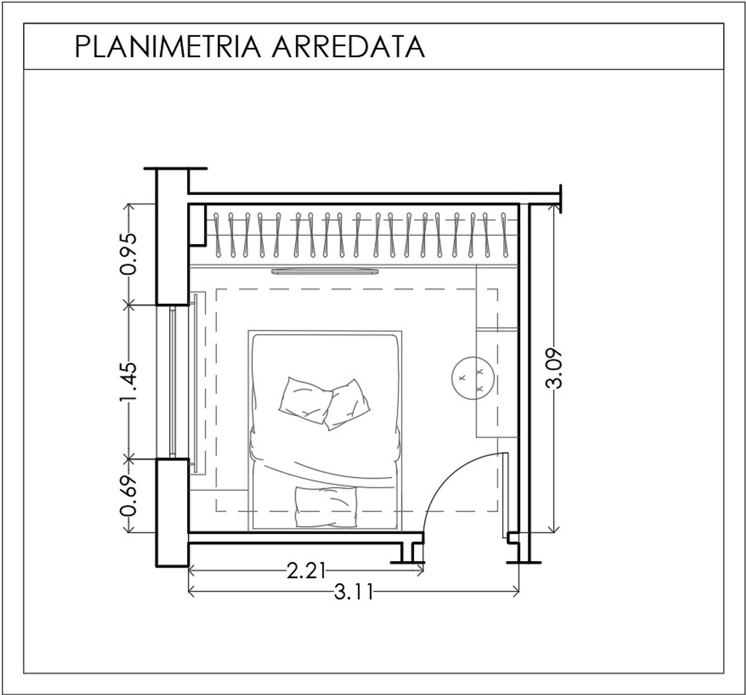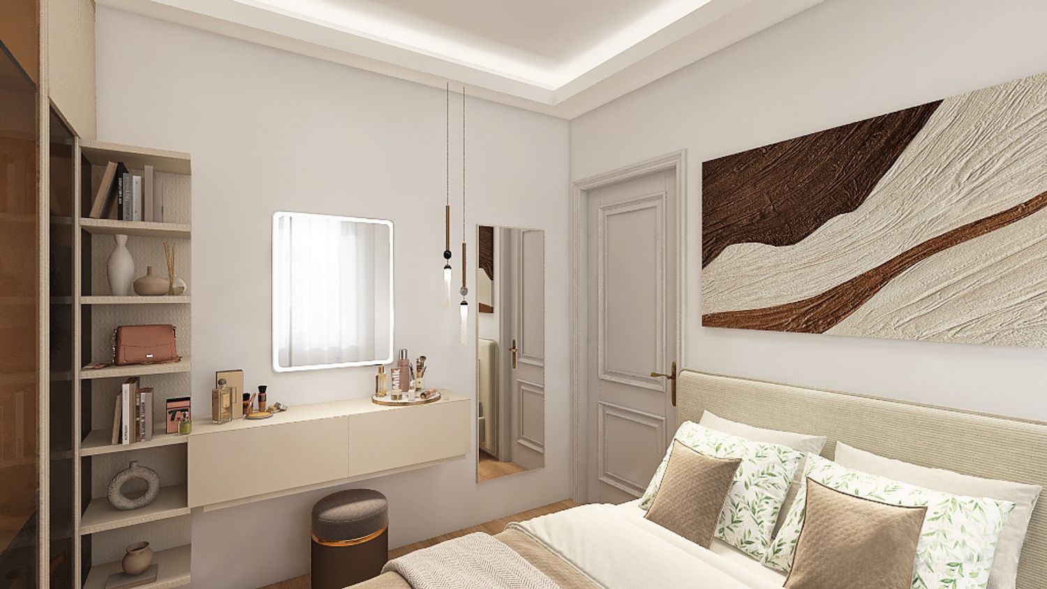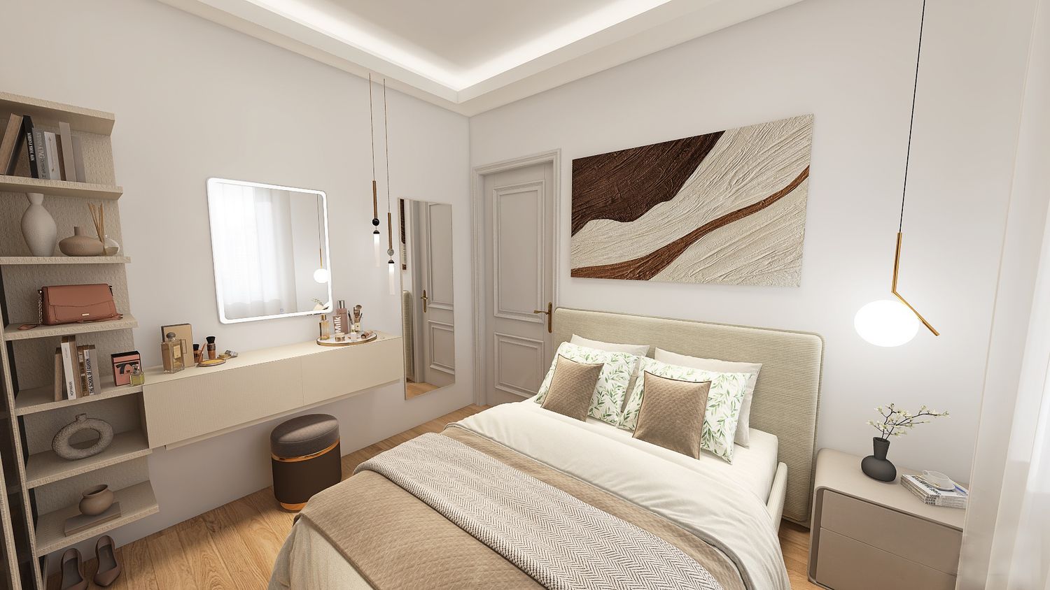 Progetto di una camera elegante, con un armadio a tutta altezza con parti con ante vetrate per dare maggiore profondità alla stanza. Per la tv si opta per un pannello scorrevole come anta dell'armadio che fa da appoggio per lo schermo. Un lato della stanza dedicato alla zona trucco con mensole per poggiare accessori e specchi. Il letto con testiera ed il proprio comodino. Per quanto riguarda l'illuminazione, delle velette servono sia per una illuminazione diffusa sia per coprire il bastone delle tende. Il tutto incornicia la stanza e ridà una geometria nascondendo le travi e pilastri a vista. Inoltre per una illuminazione più puntuale, due luci a sospensione sul comodino ed una doppia per zona trucco e specchio lungo.