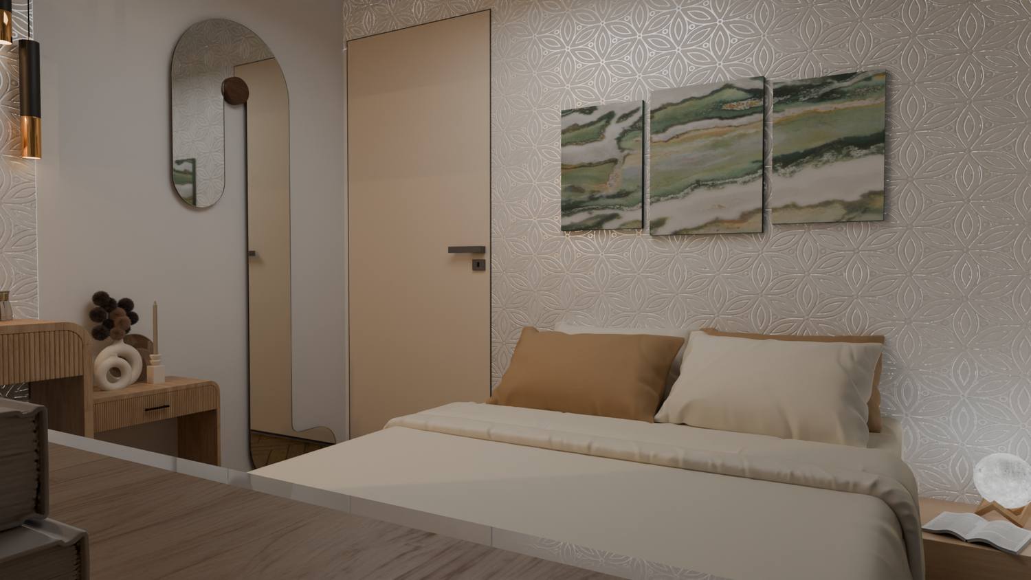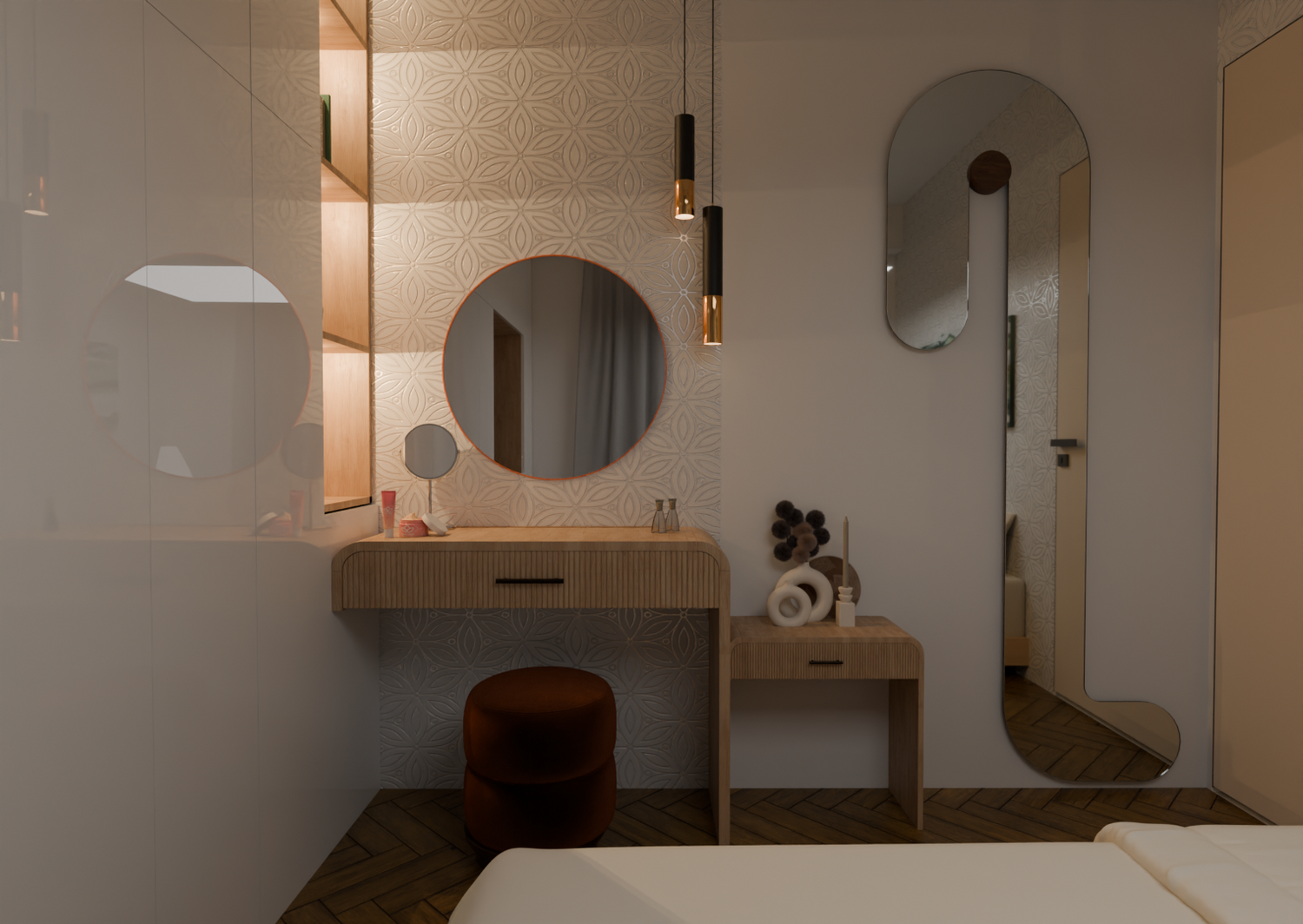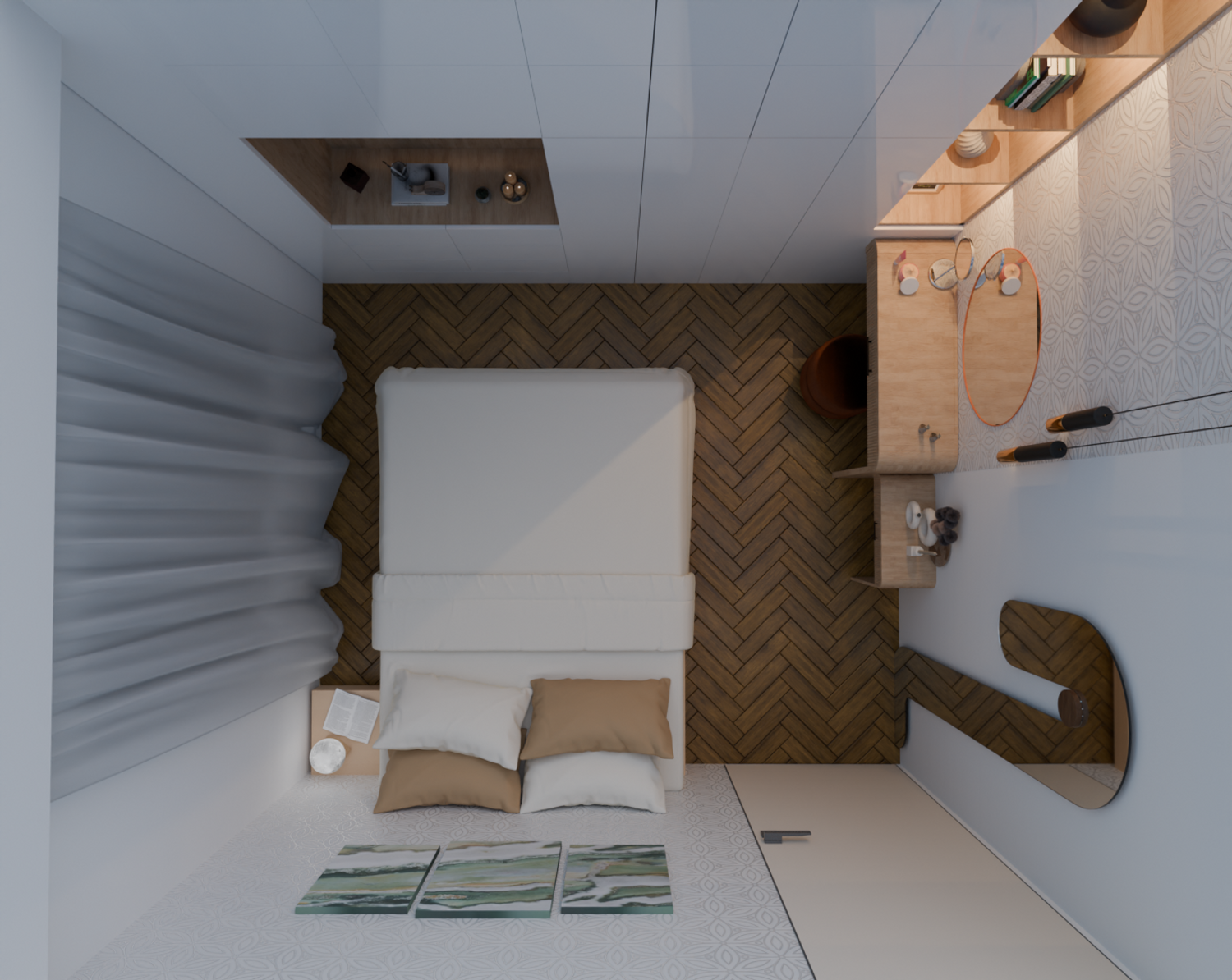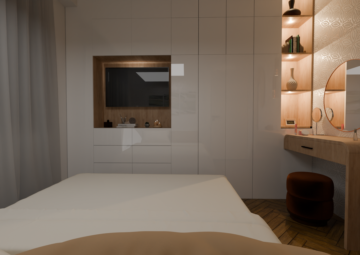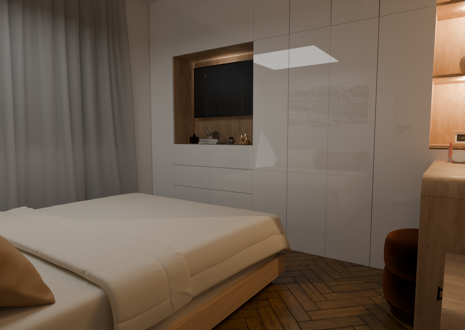 Ho scelto di riposizionare il letto sulla parete più corta: lo spazio è sufficiente per un modello matrimoniale completo di comodino. Questa soluzione mi ha permesso di sfruttare l'intera parete lunga per un'armadiatura molto capiente, nella quale ho integrato un angolo dedicato al make-up
