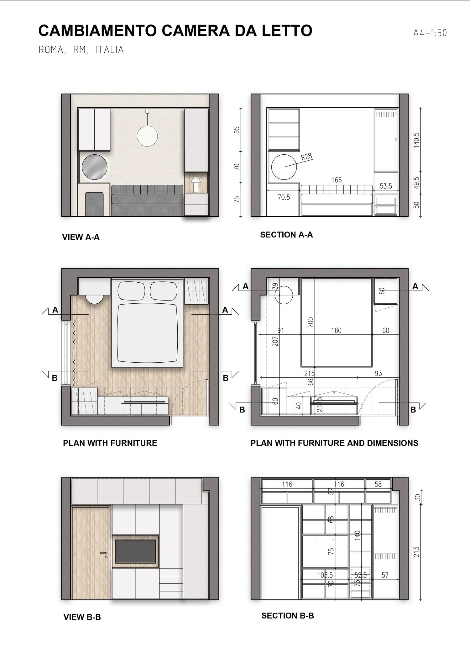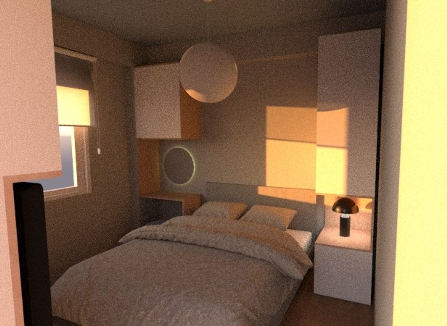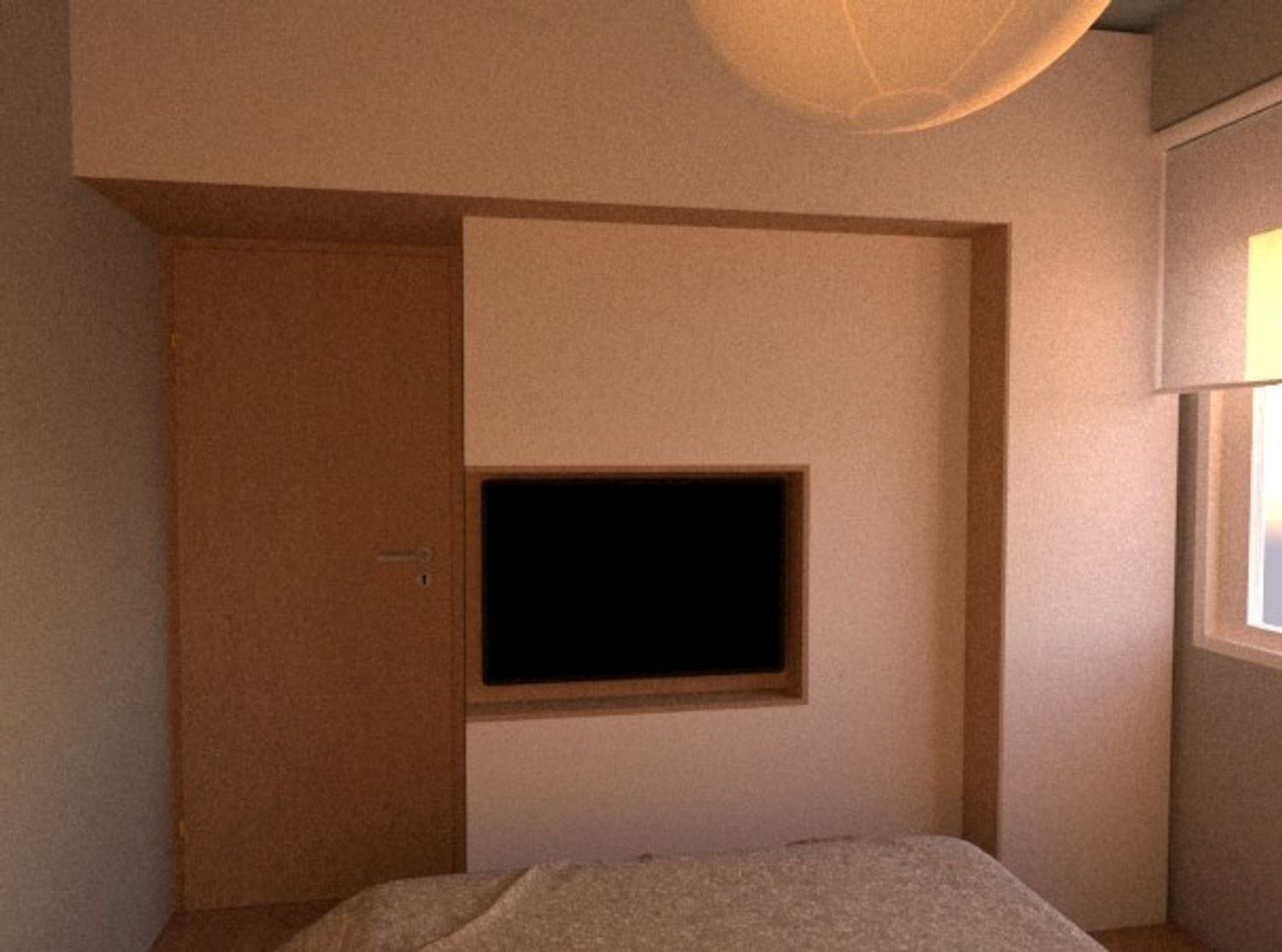 With this design, I tried to meet all the major requirements: TV in the room, maximum possible wardrobe, dedicated vanity area, the bed is 160*200, there is also dedicated night stand area on the one side of the bed.