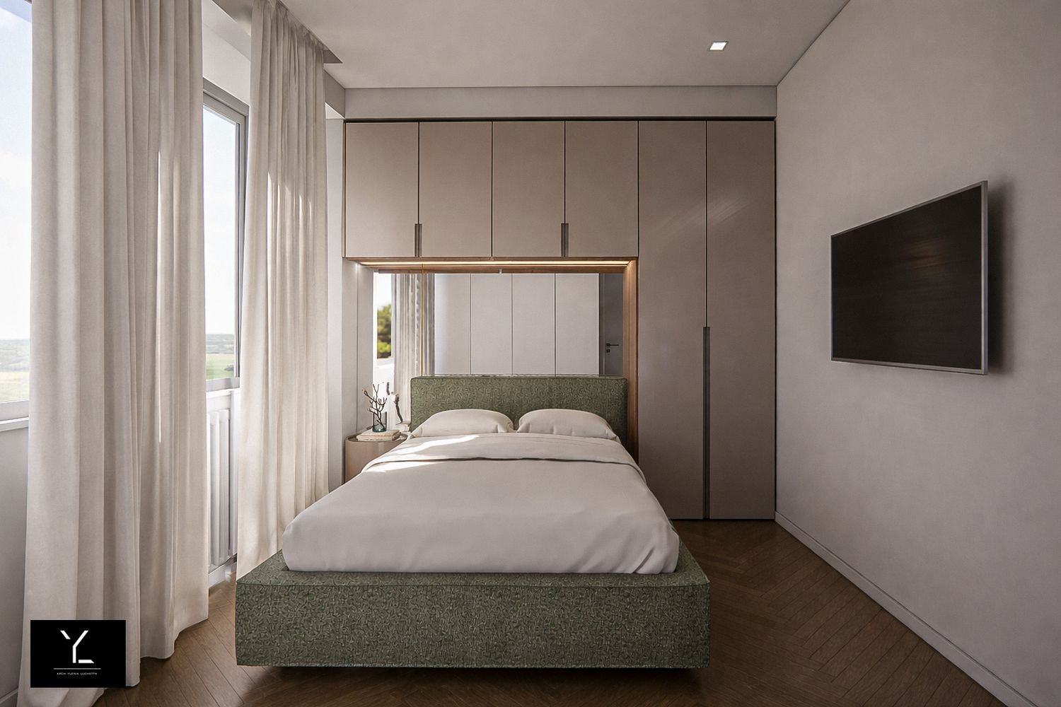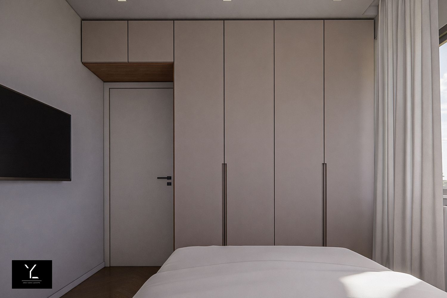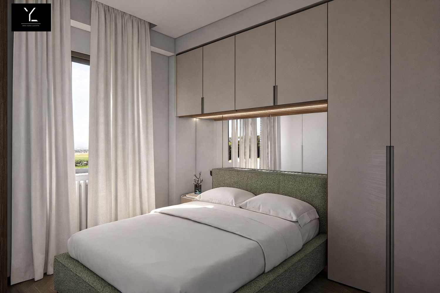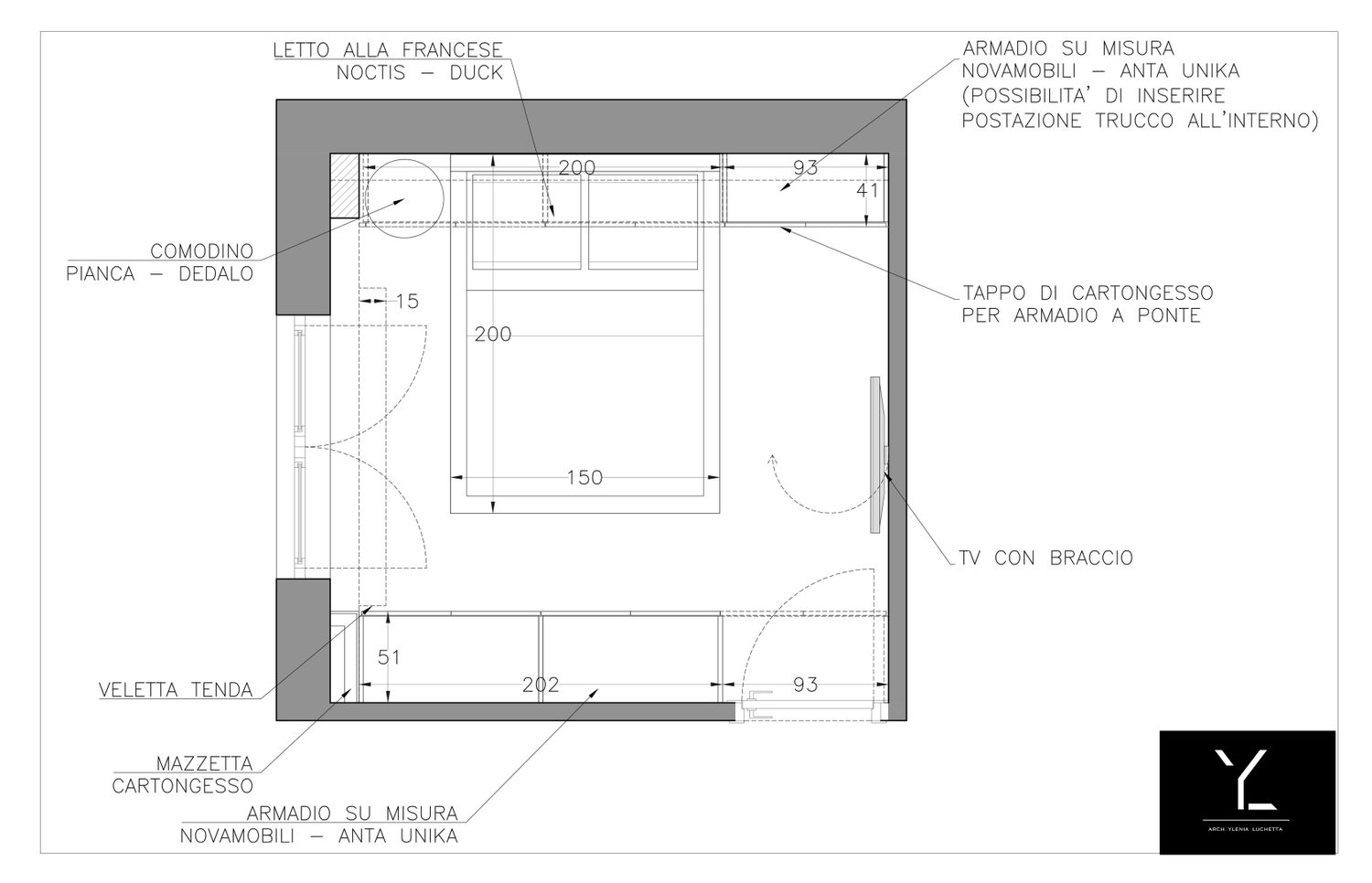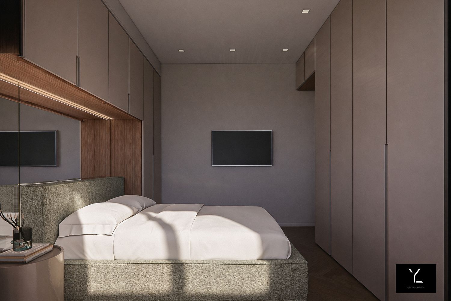 La parete che ospita il letto è composta da un letto alla francese, un comodino tondo e un sistema di armadiature a ponte e a terra, con possibilità di inserire all'interno dell'armadio la postazione make-up, il tutto impreziosito da una pannellatura a specchio per aumentare la percezione di profondità della stanza. La tv è stata spostata dalla posizione attuale optando per una a braccio per rendere comoda la visione di essa.