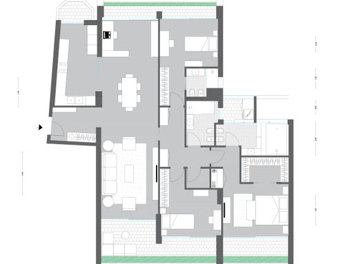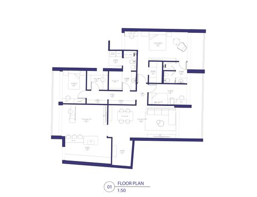 El plano con los muebles (01) respeta la disposiciĂłn actual de las paredes y la lĂłgica de los espacios y muebles. Solo en el baño 02 y el balcĂłn 05, los muebles y accesorios no son como se dibujaron en una antigua idea. Actualmente, al entrar en el Baño 02, a la derecha están los accesorios sanitarios, con una pared detrás en lugar de una abertura segĂşn el dibujo; a la izquierda está el lavabo y al fondo a la izquierda está la bañera. El balcĂłn 05 es un espacio de lavanderĂa y asĂ se mantendrá.
