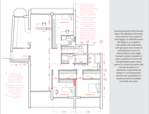 Far uscire dallo spazio aggiuntivo preso dalla Camera 03 tagliandola subito prima della porta un area tipo cabina armadio a C per la NS camera da letto (Camera 02) eliminando l'attuale stretta e lunga e rimodellando l'attuale bagno 03.