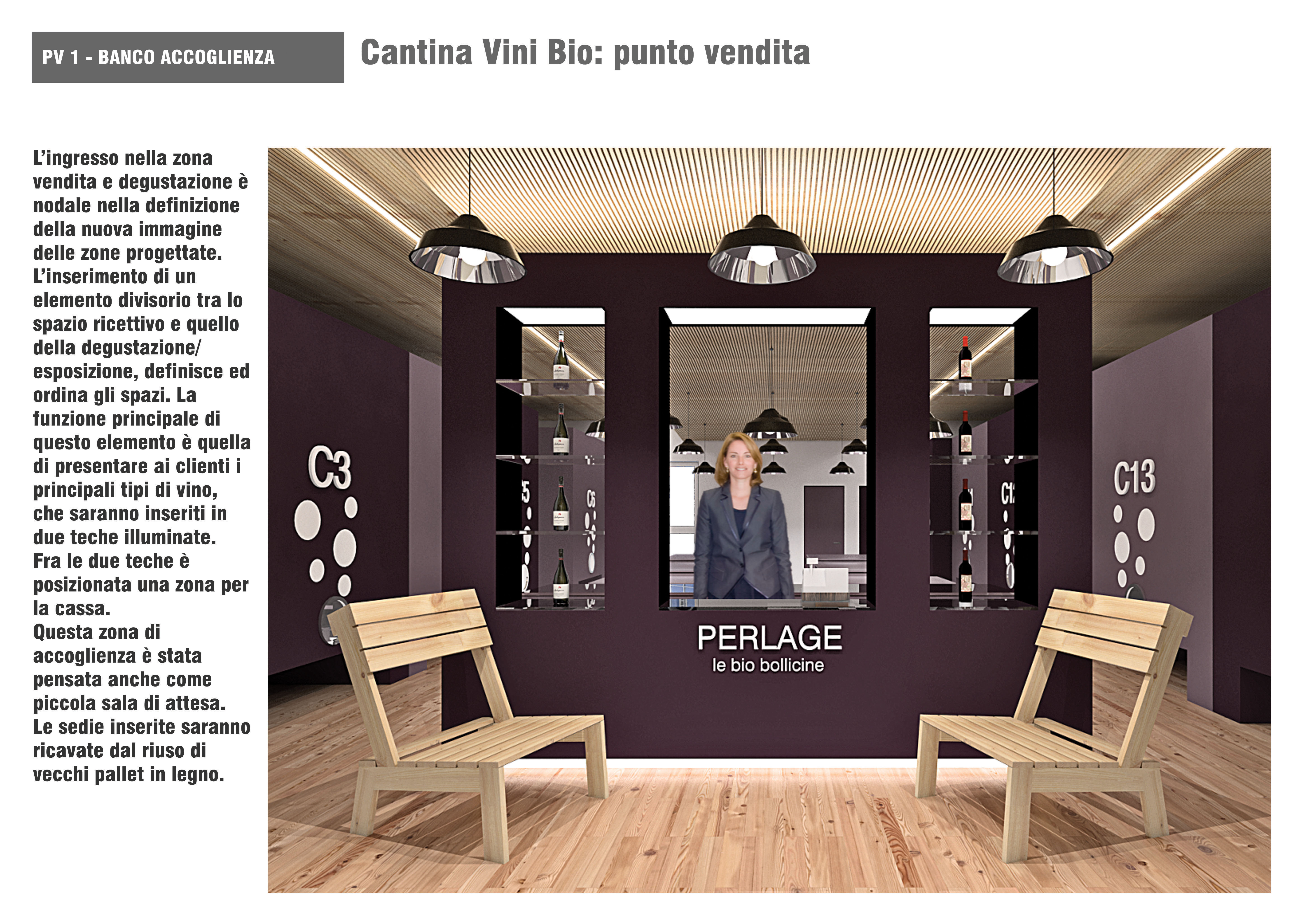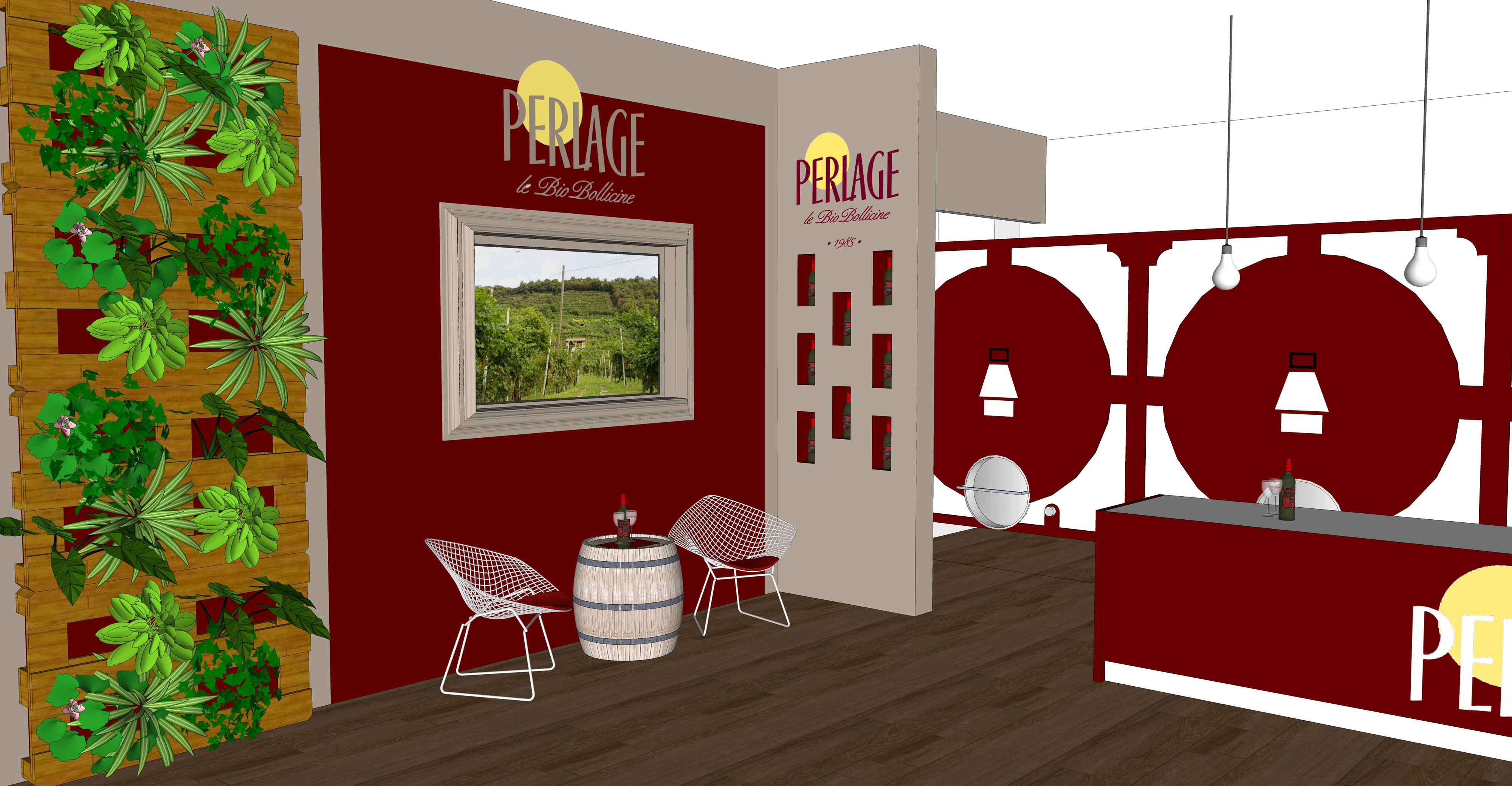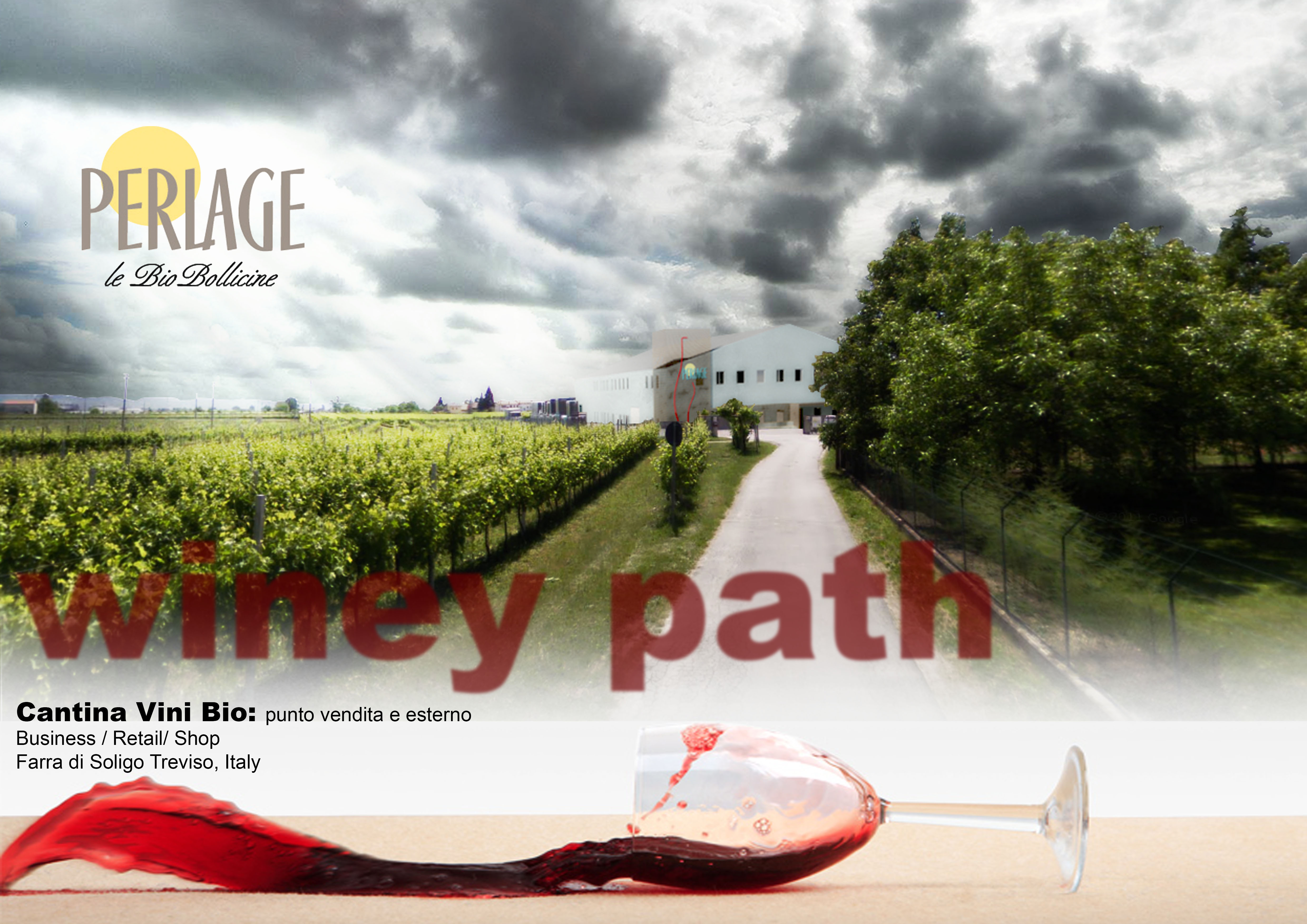 Perlage produce vini Biologici ed è molto attenta alla sostenibilità ambientale. La cantina di produzione contiene uno spaccio/sala degustazione e eventi di circa 200mq, in cui sono inserite delle vasche di cemento bordeaux e una cucinetta in acciaio. La parte da arredare è di circa 120mq.