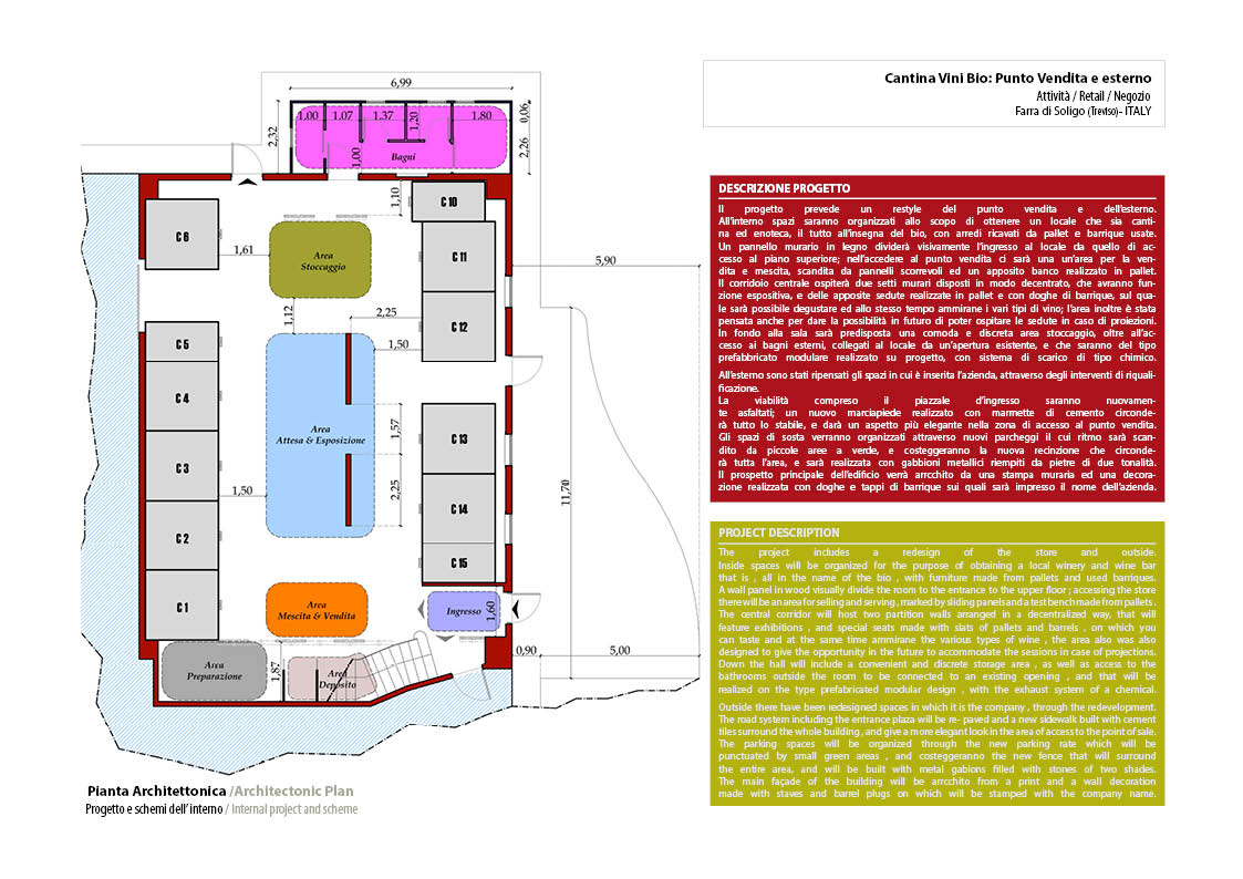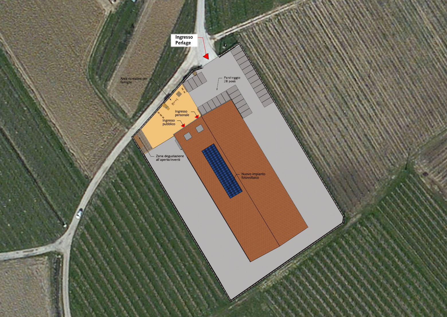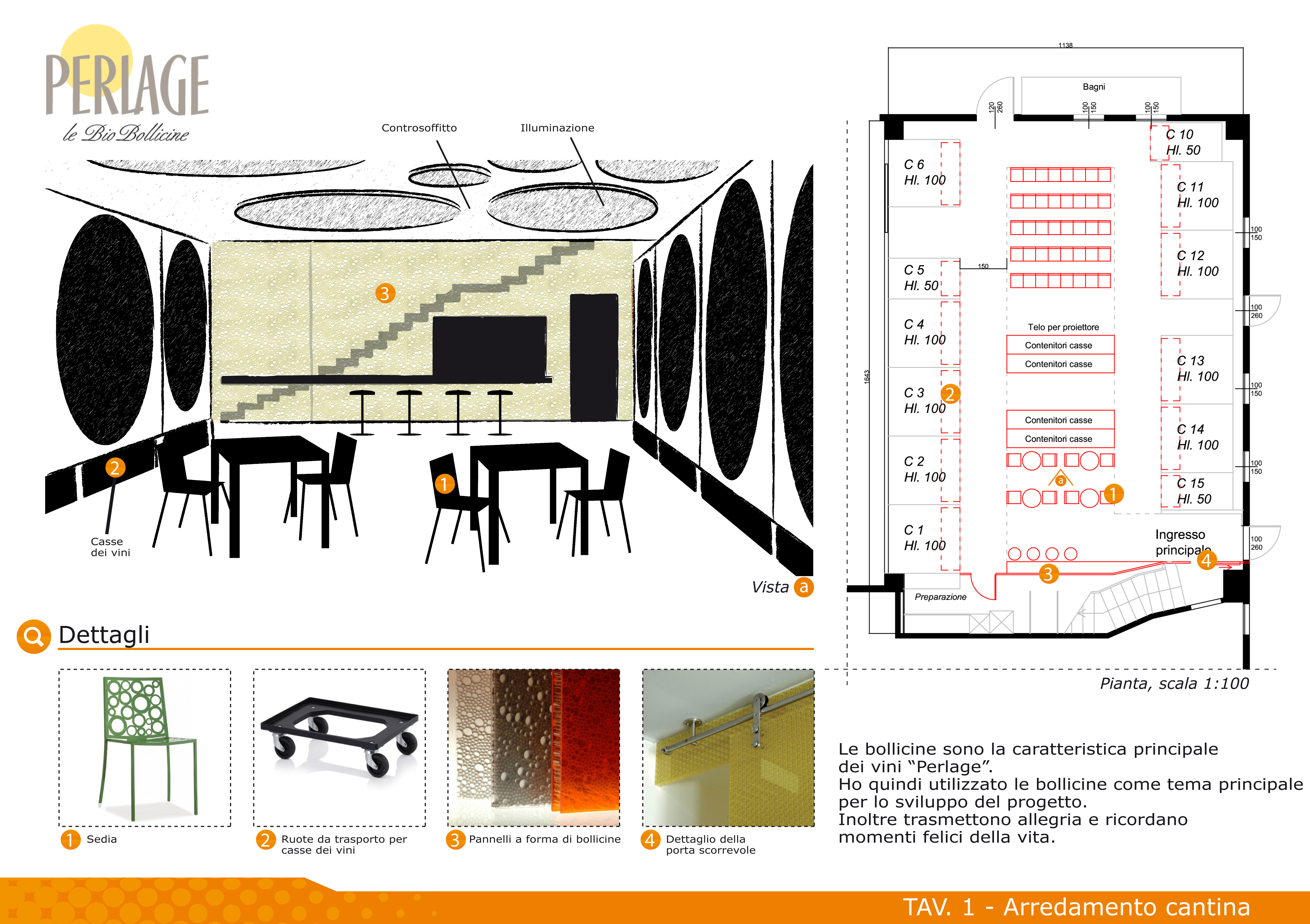 Perlage produce vini Biologici ed è molto attenta alla sostenibilità ambientale. La cantina di produzione contiene uno spaccio/sala degustazione e eventi di circa 200mq, in cui sono inserite delle vasche di cemento bordeaux e una cucinetta in acciaio. La parte da arredare è di circa 120mq.