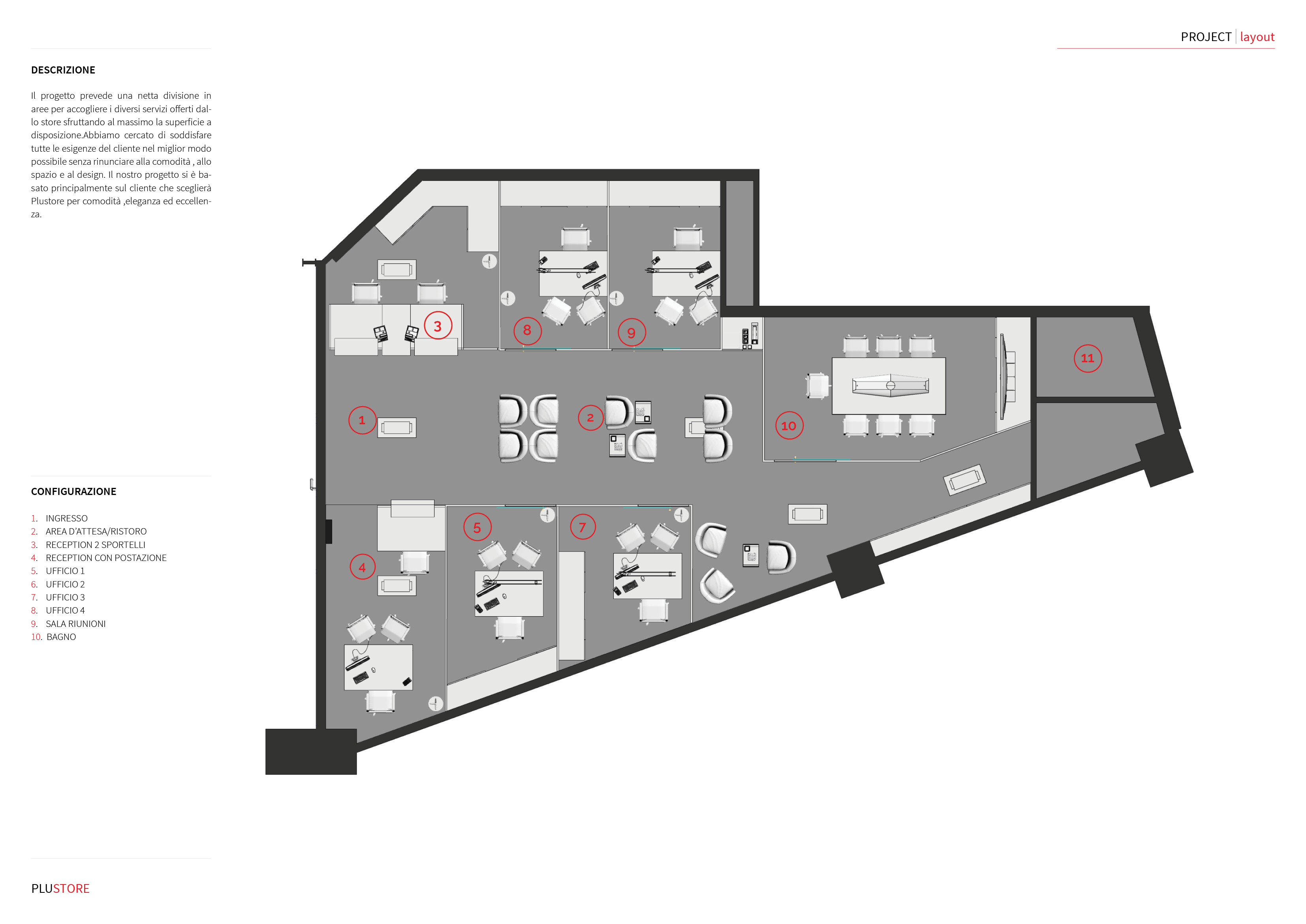 La location, sulla quale deve essere costruito il concept dello store, è un open space di 80/120 metri quadri suddiviso in 4 macro aree, dove Posta Sì e Capital House devono avere una posizione “privilegiata” di front office con marchio visibile mentre i servizi assicurativi e di mediazione creditizia insieme e il CAF possono essere collocati in due piccole aree riservate, non necessariamente chiuse, per garantire riservatezza al cliente. In particolare l’area credito/ assicurativa, dal punto di vista normativo, deve essere ben separata dagli altri servizi e ben inequivocabilmente identificata dal cliente.