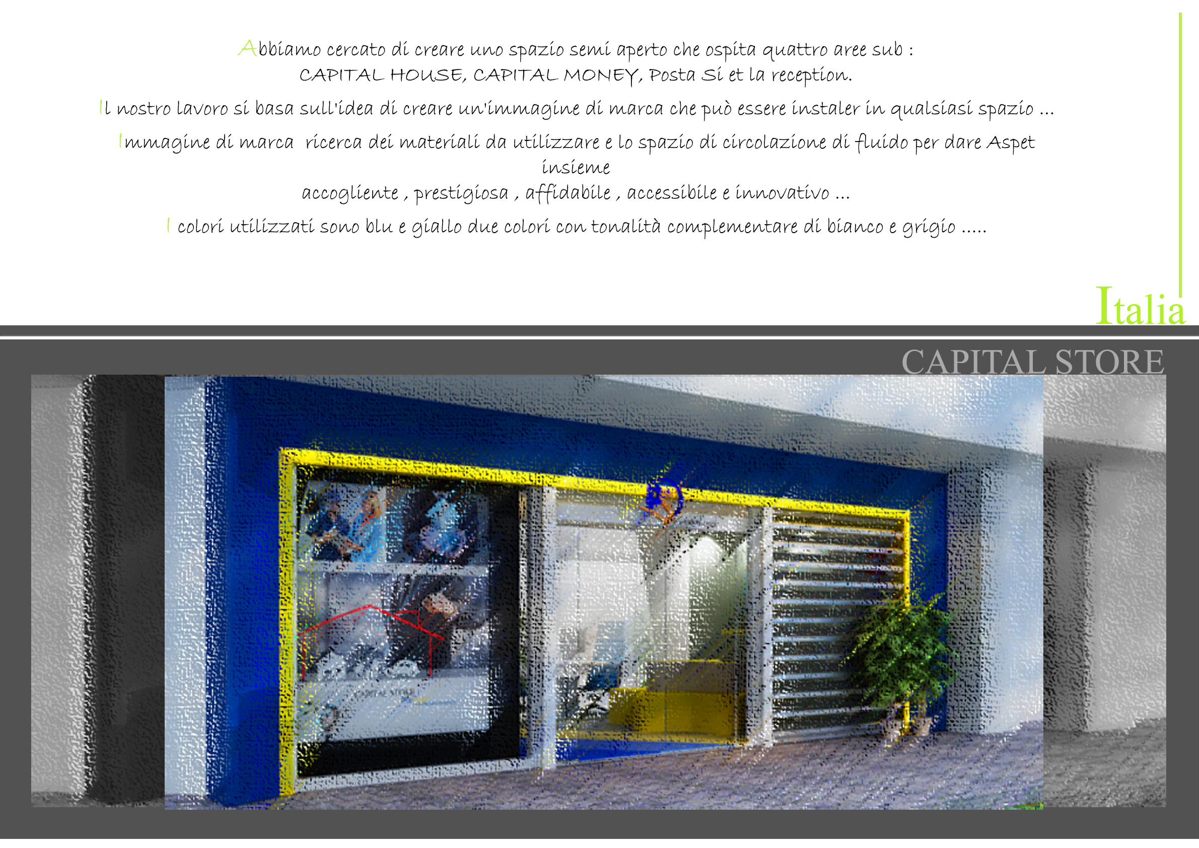 Il Capital Store vuole diventare un punto di riferimento importante per i suoi clienti. La mission dello store è legata ai suoi valori di professionalità, trasparenza e serietà nell’erogazione dei servizi che devono riflettersi nella sua struttura e design. D’altra parte lo store vuole accogliere e coinvolgere al meglio il suo cliente accogliendolo e intrattenendolo durante le fasi di attesa; lo store deve quindi essere accogliente, moderno e innovativo allo stesso tempo. Nello store deve essere presente una zona d’attesa che deve fungere da “salotto d’accoglienza” (se possibile, inserire una piccola area ristoro con un’area giornali), dovrà essere presente, anche delle prese corrente che permettano ai clienti di lavorare durante il tempo d’attesa del loro turno. Per Capital Store il cliente e le sue necessità sono al primo posto.