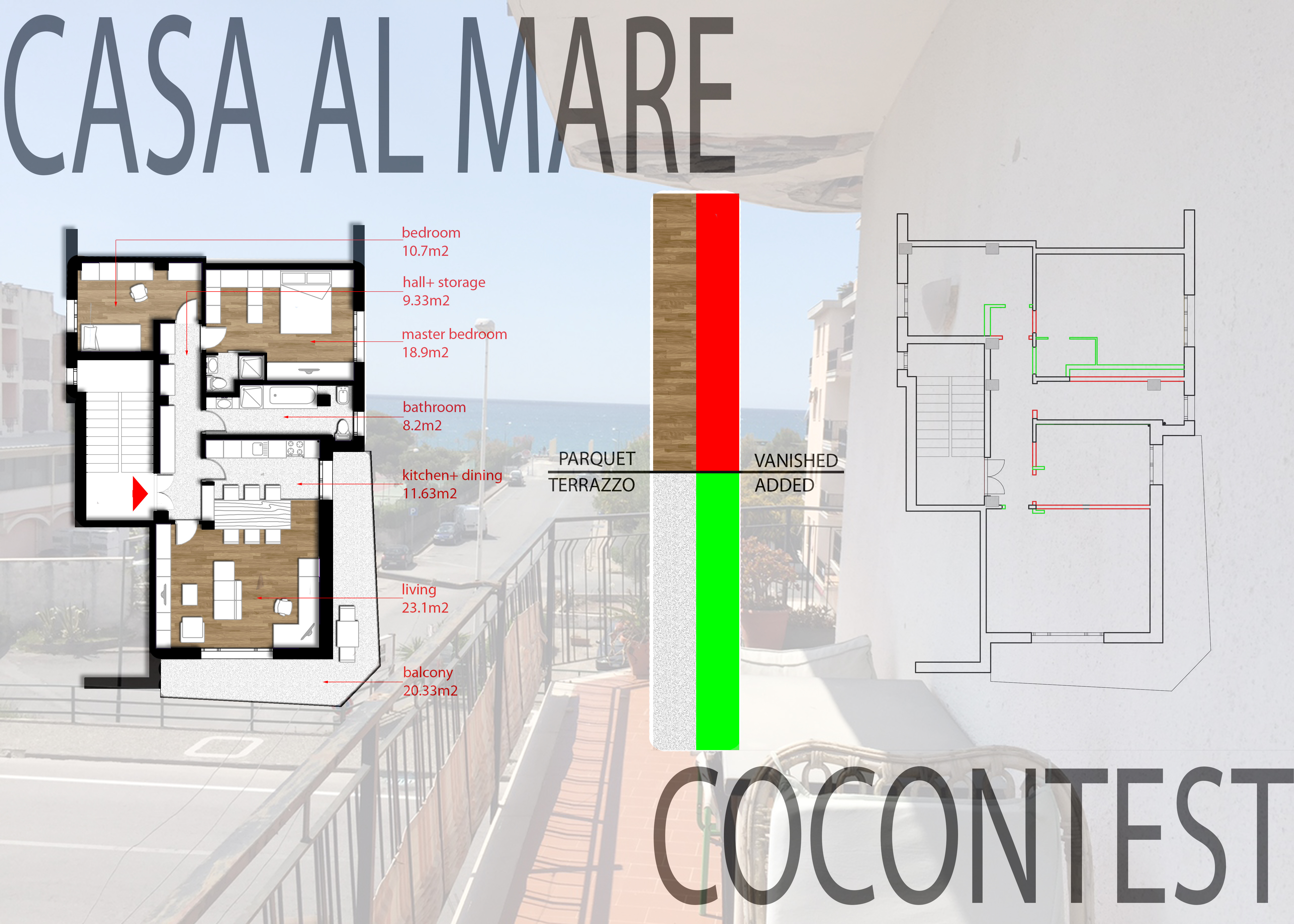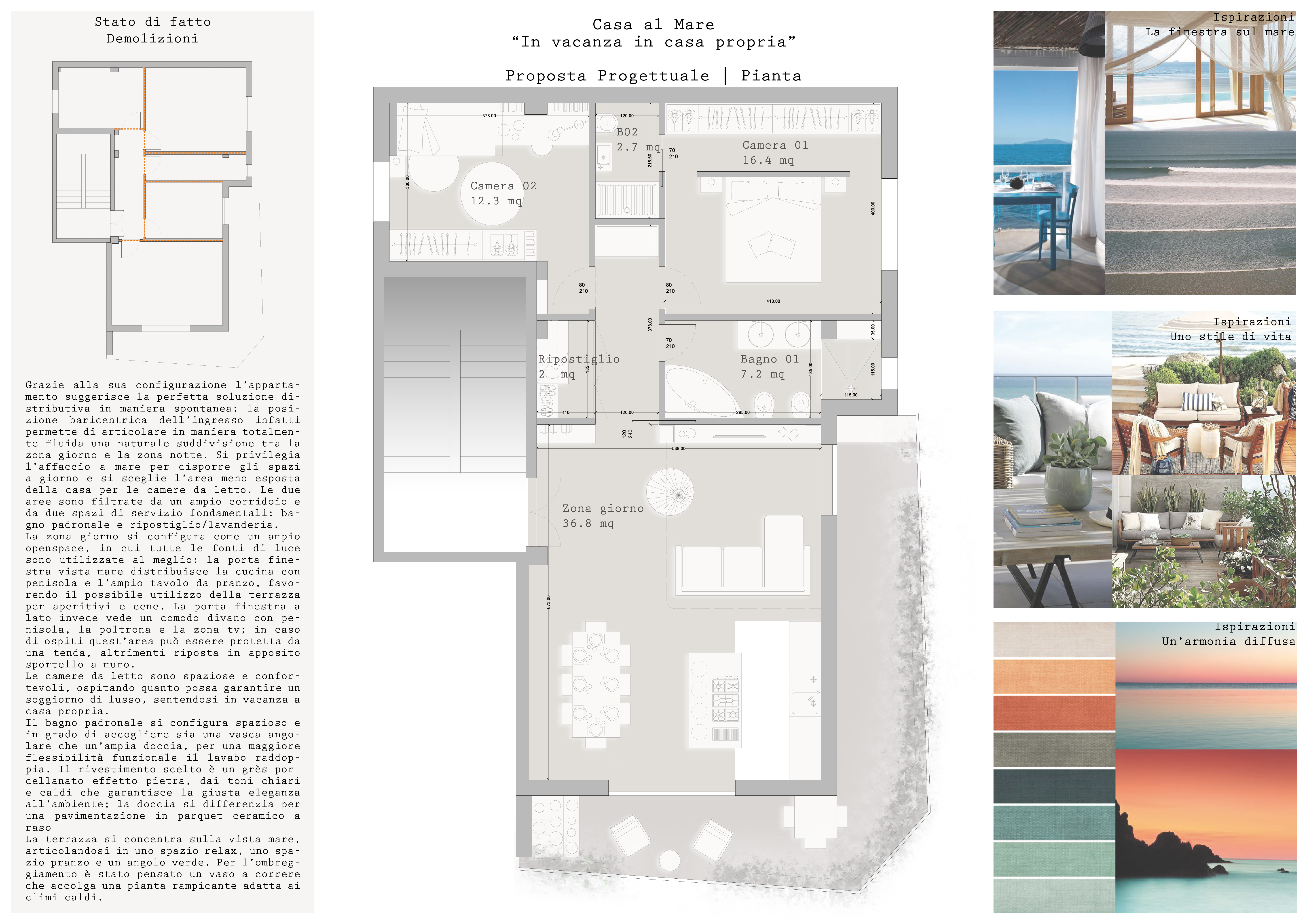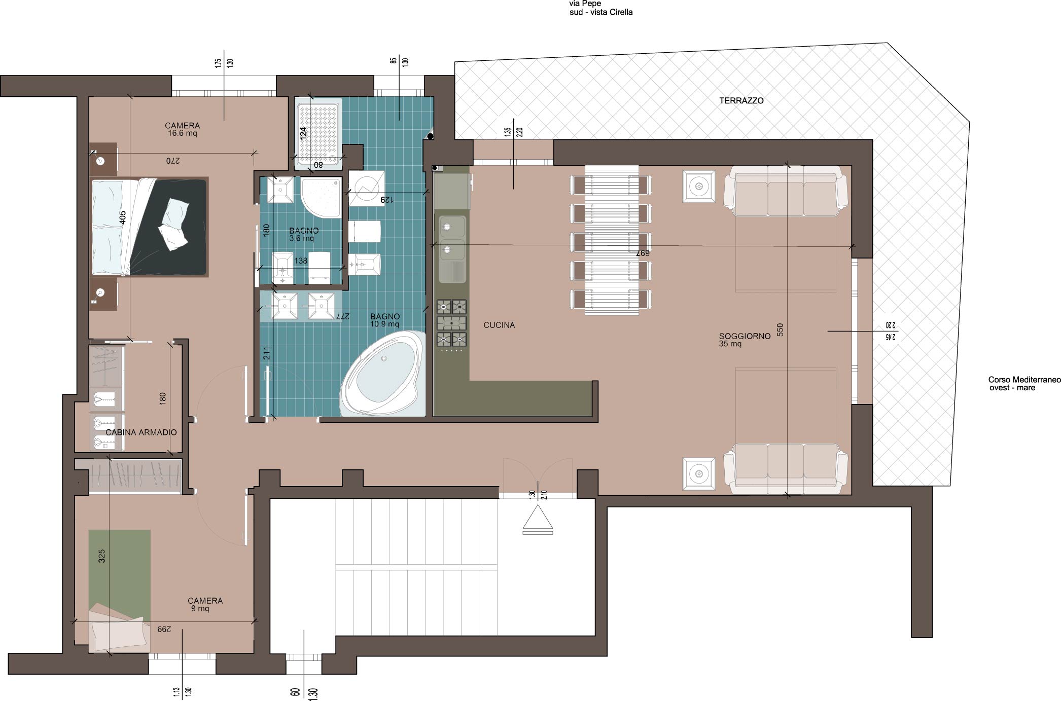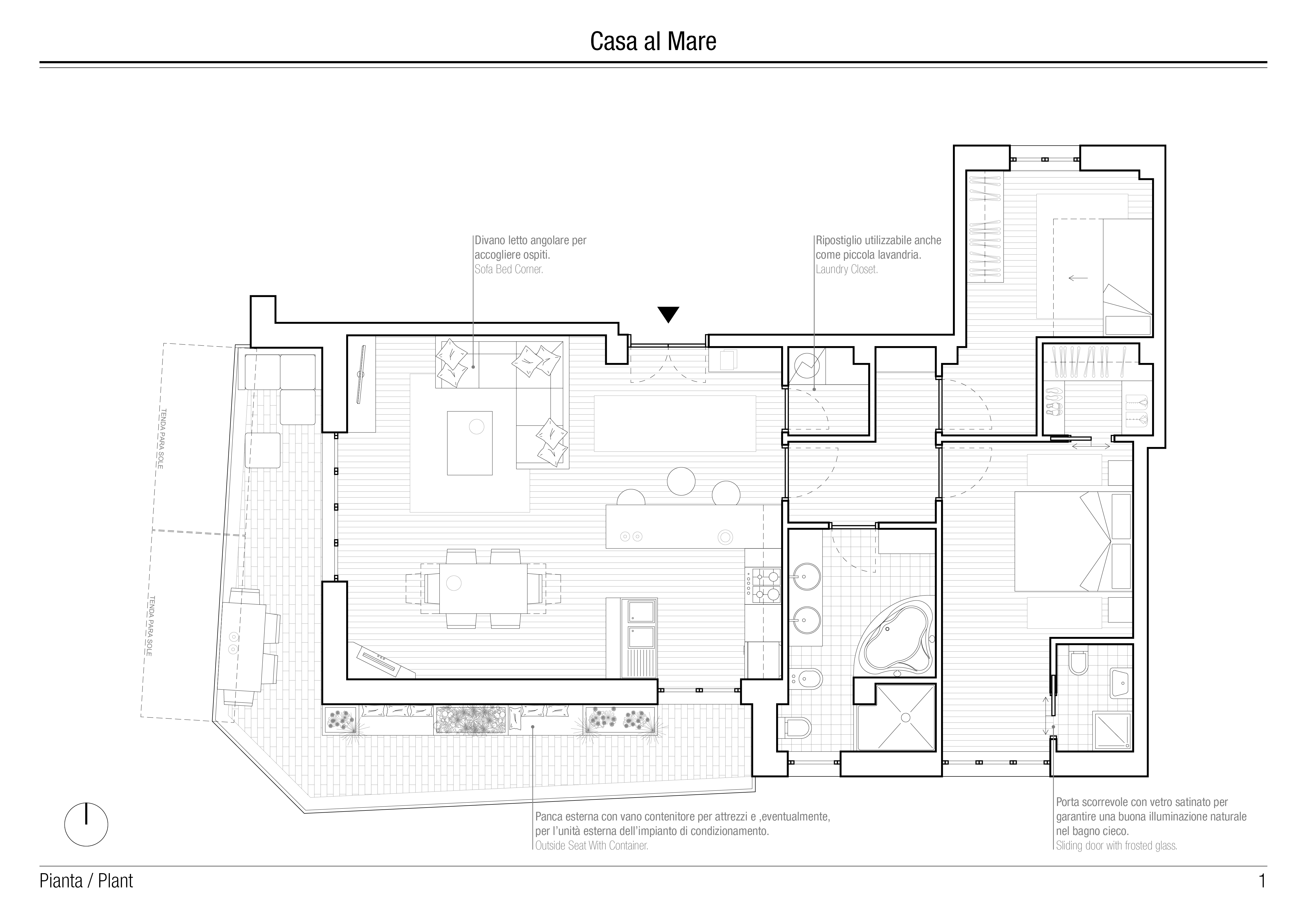 - Living: creare una grande sala living con cucina, zona pranzo (in grado di accogliere molti ospiti) e salotto, unendo eventualmente la sala grande con la stanza 1. Questa sarà l'area più importante e vissuta della casa, con vista mare.