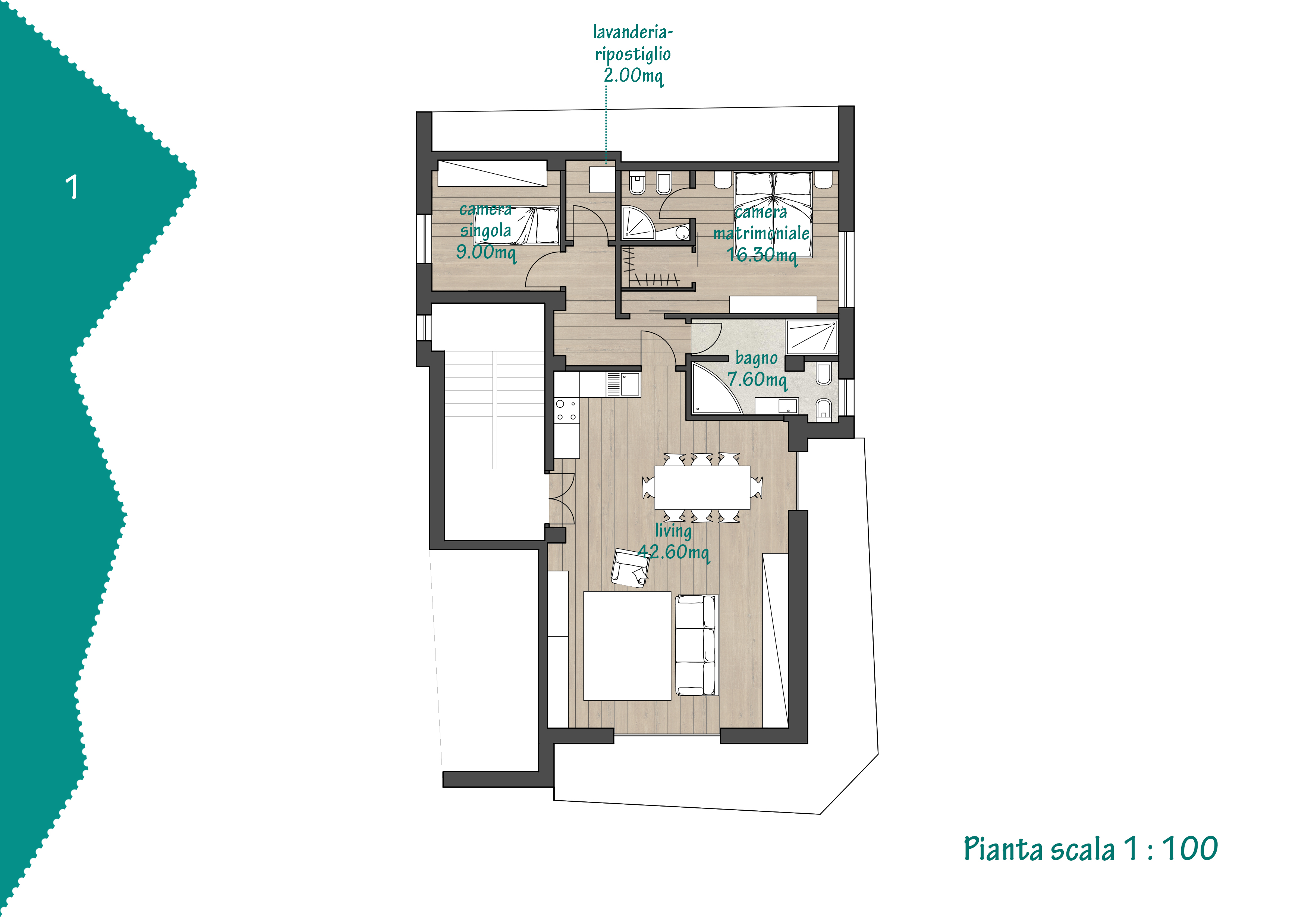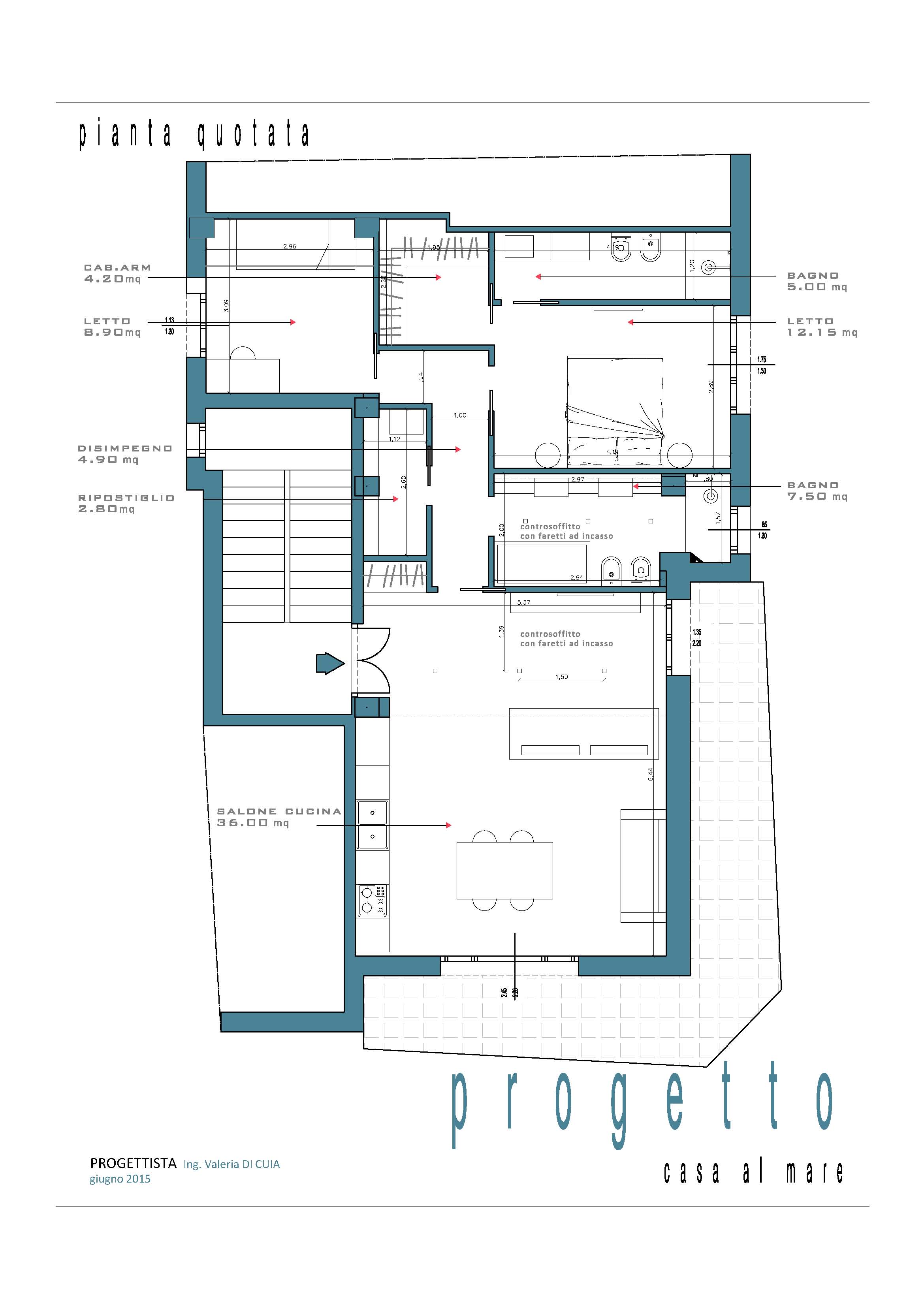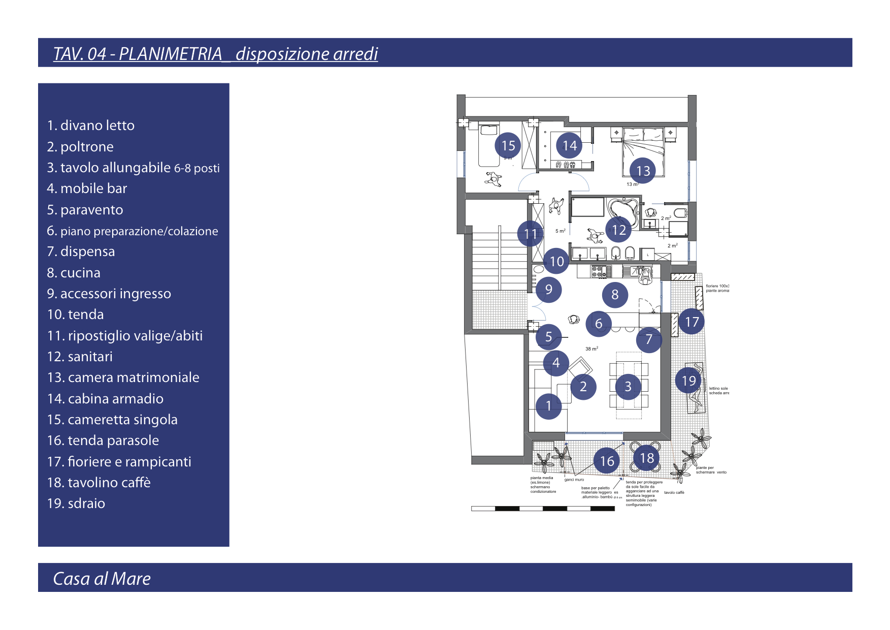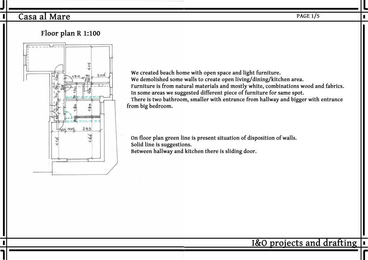 - Living: creare una grande sala living con cucina, zona pranzo (in grado di accogliere molti ospiti) e salotto, unendo eventualmente la sala grande con la stanza 1. Questa sarà l'area più importante e vissuta della casa, con vista mare.