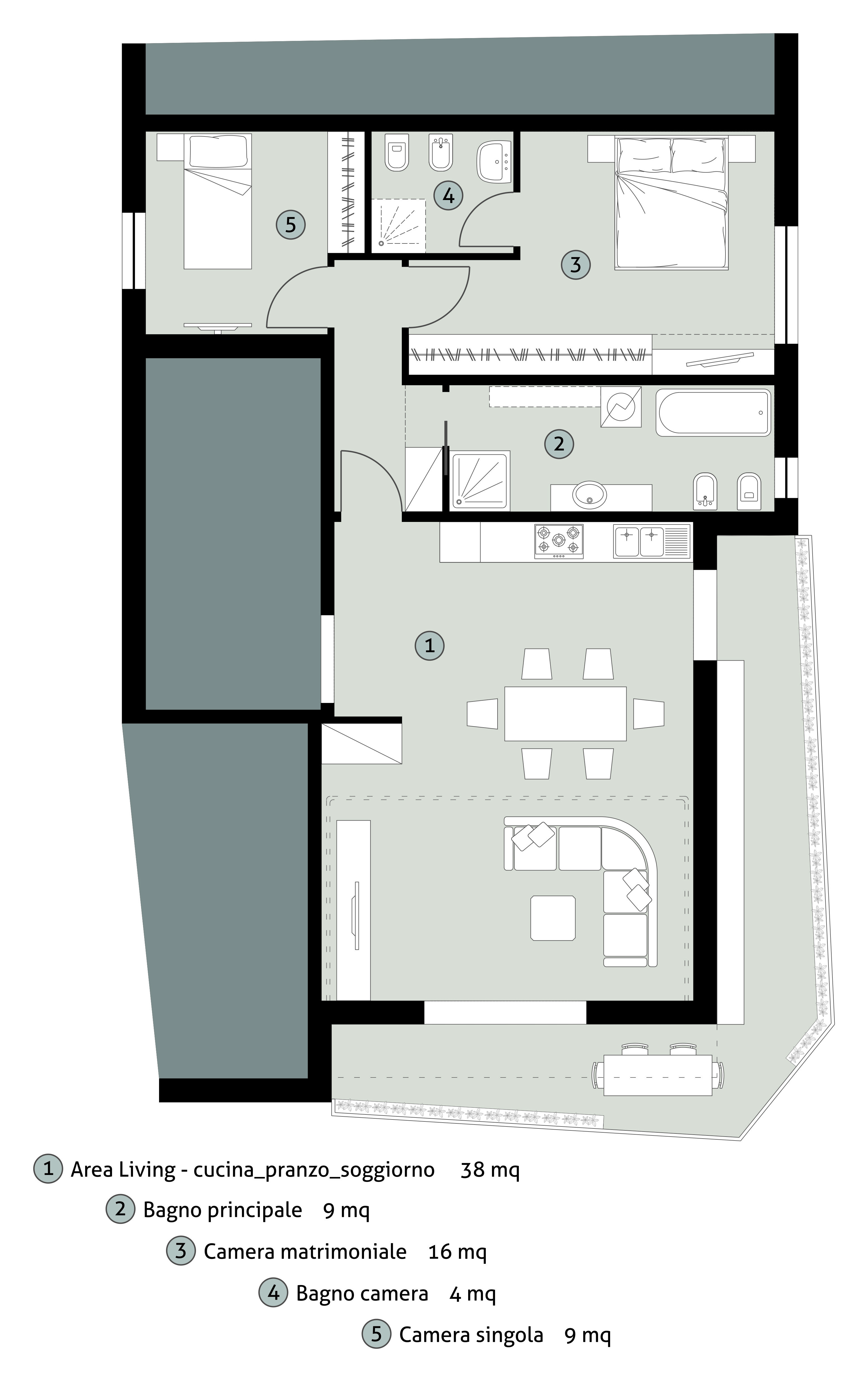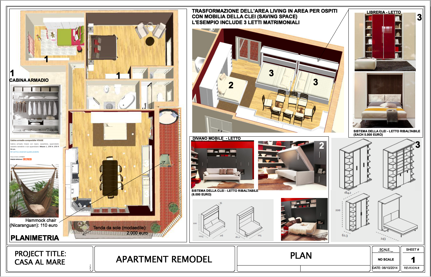 - Balcone: prevedere delle tende davanti alla zona living e delle soluzioni per rendere piacevole ed accogliente una eventuale permanenza sul balcone (tavolino per colazione, eventuali grate e fioriere).