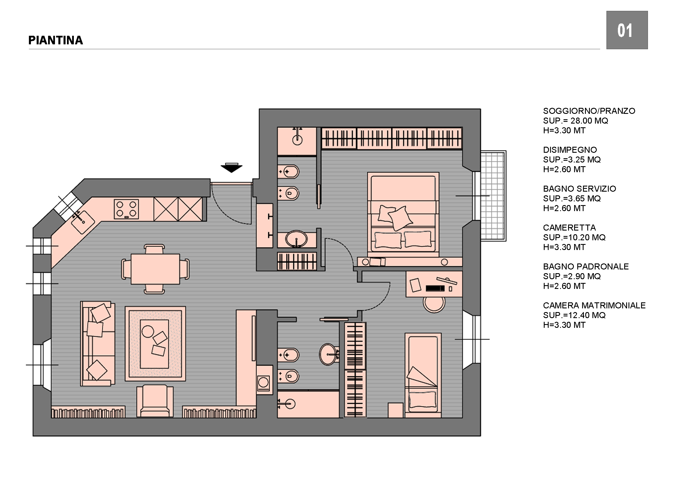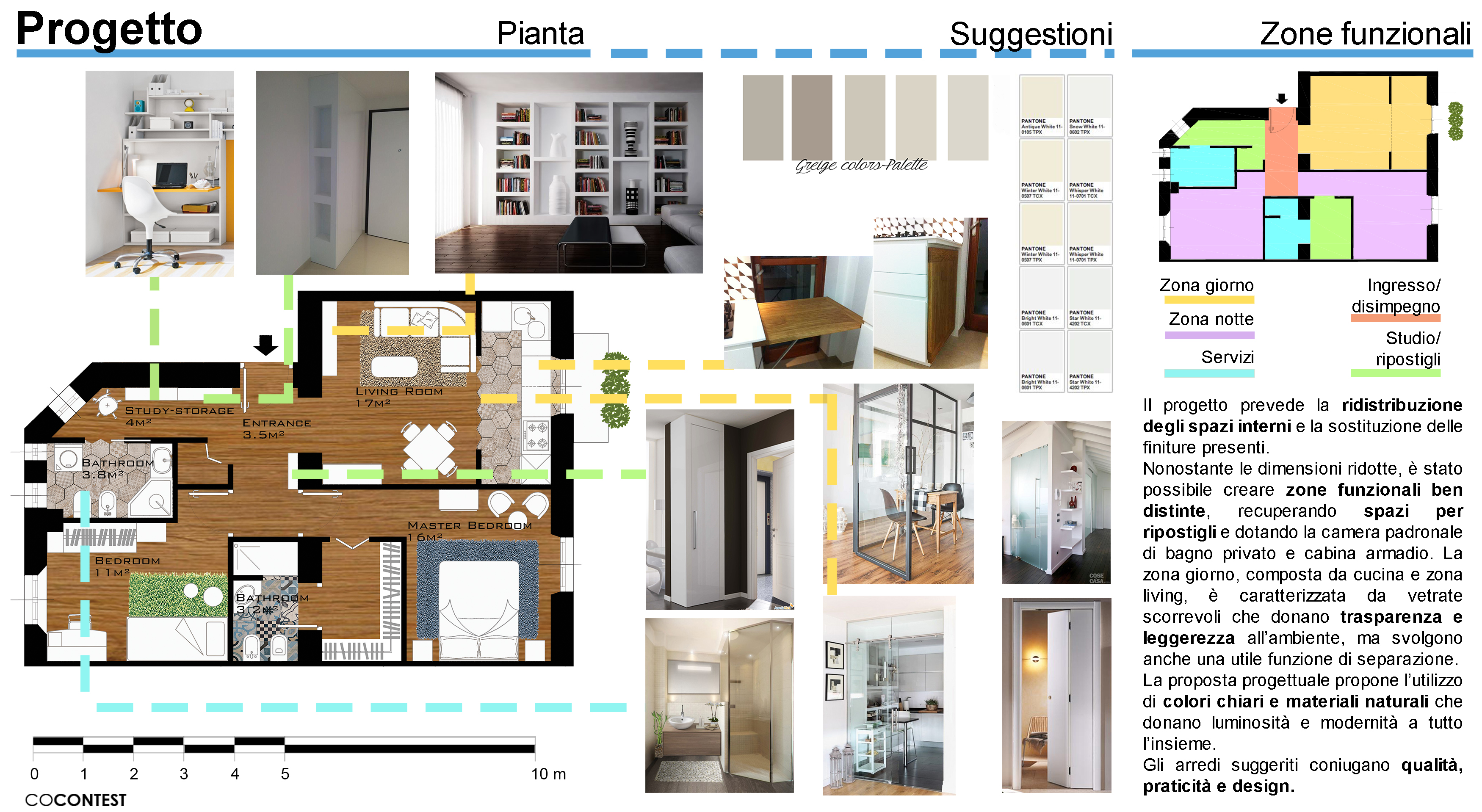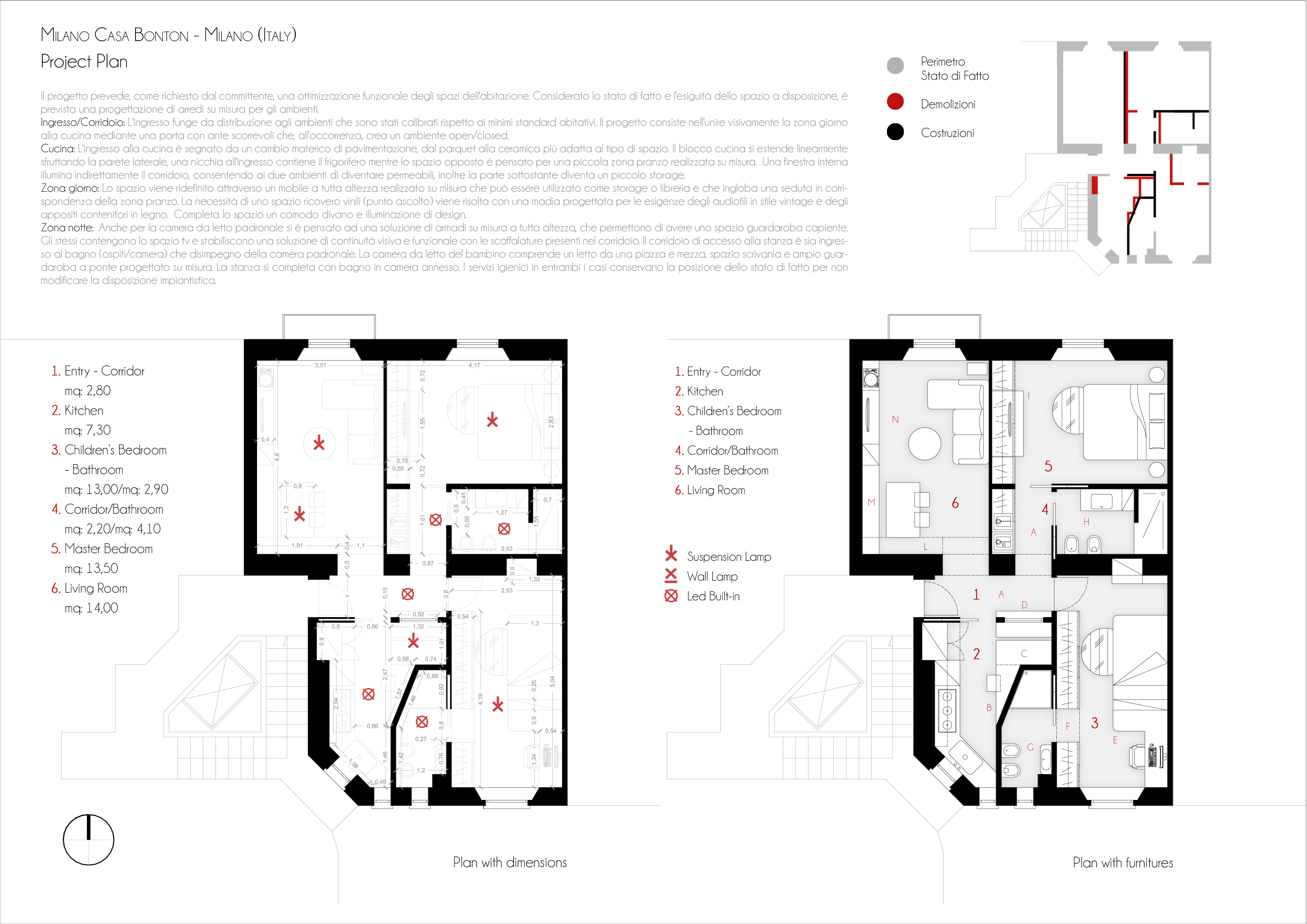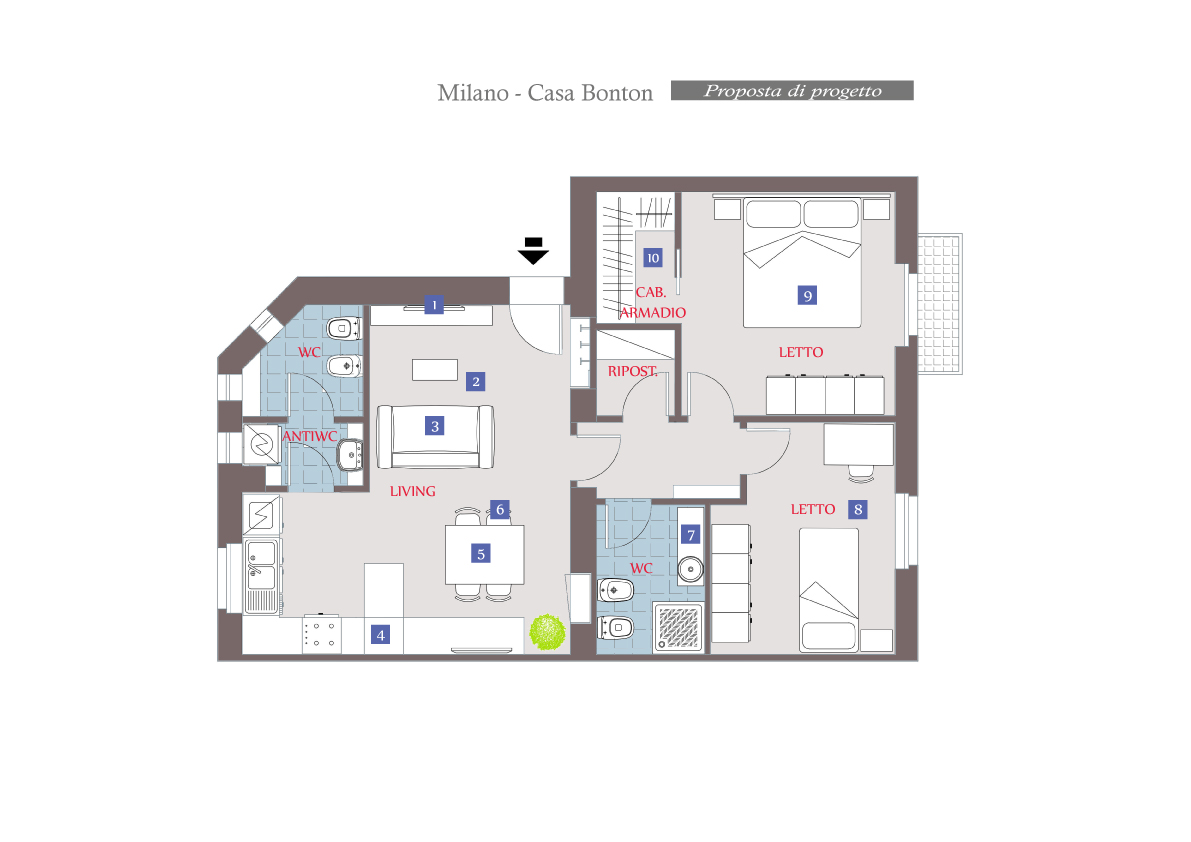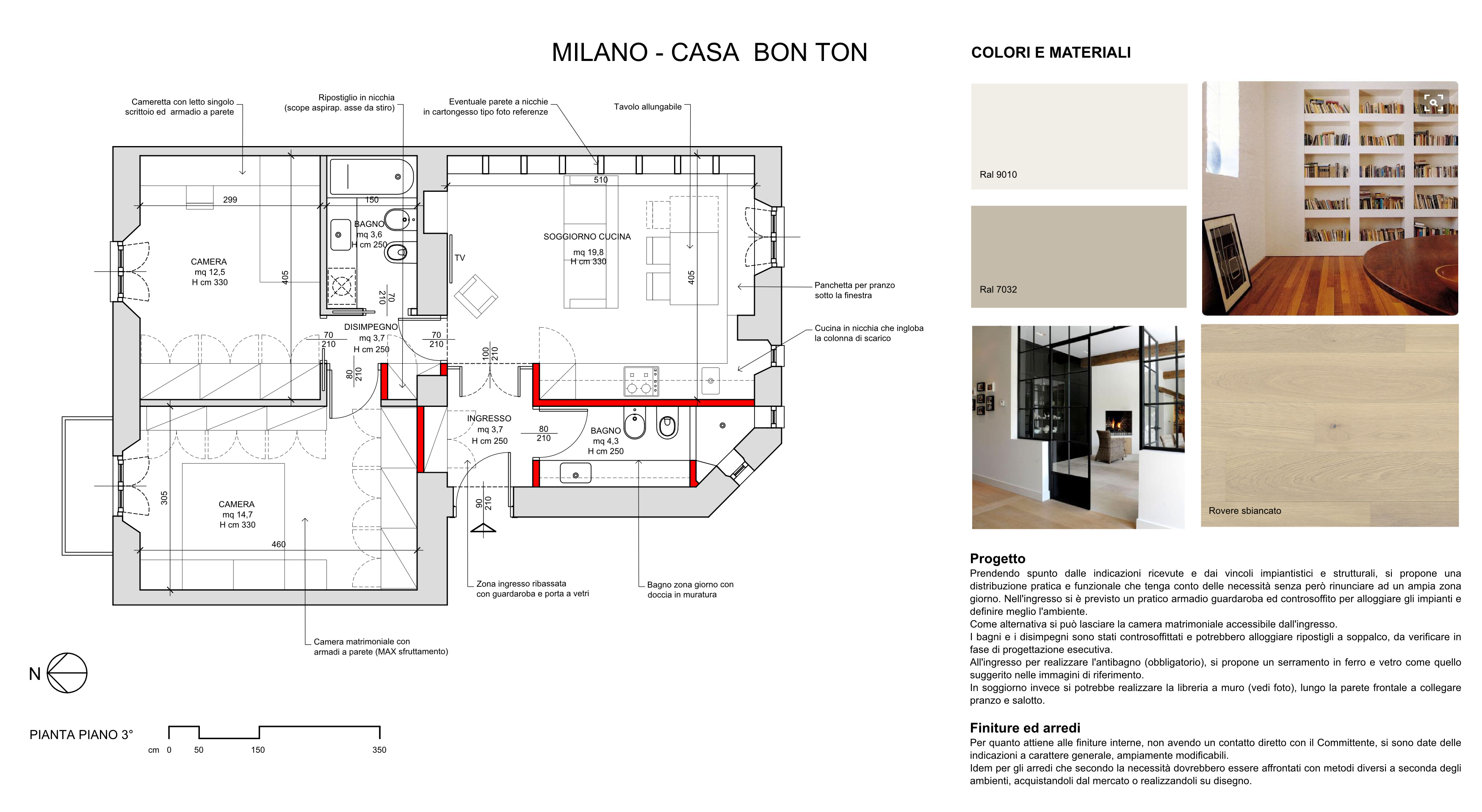 L'appartamento verrà completamente ristrutturato. La composizione attuale con soggiorno, cucina, 2 camere e 2 bagni dovrà essere mantenuta, vista però la scarsa metratura vorremmo sfruttare tutti gli spazi nel migliore dei modi andando a ricavare nicchie, ripostigli e vani armadio dove possibile. Valuteremmo la possibilità di creare una zona giorno open sala /cucina a vista anche ribaltando la posizione attuale degli ambienti. Se si riuscisse valuteremmo anche la classica soluzione dell'armadio piuttosto che la cabina armadio nella camera matrimoniale, abbiamo però paura di perdere molta capacità contenitiva. Il riscaldamento sarà a pavimento. Nel soggiorno una porzione di parete sarà destinata a tv/impianto stereo e ricovero vinili. La palette di colori sarà bianca/grigio/naturale. Famiglia composta da 2 adulti e un bambino di 6 anni.