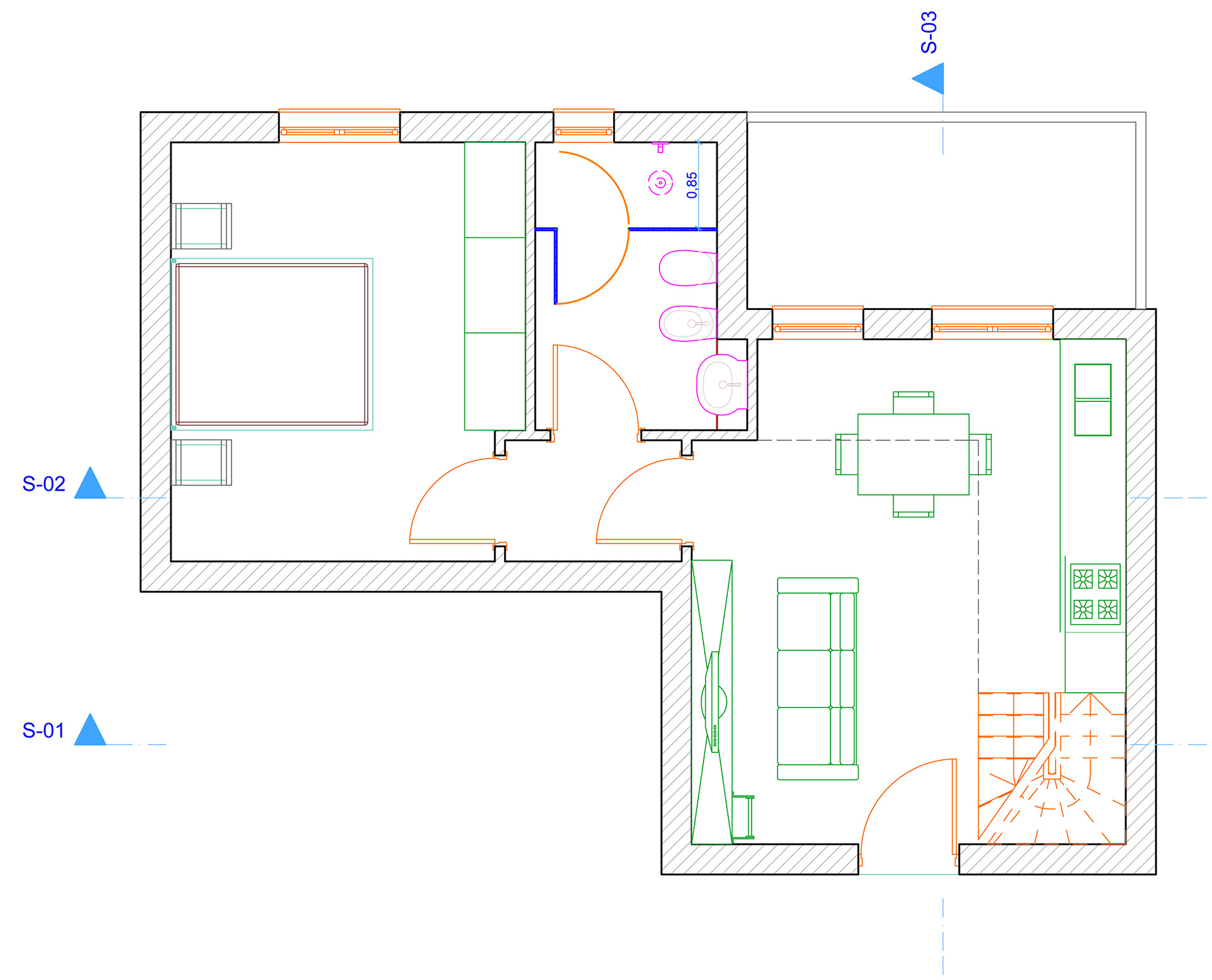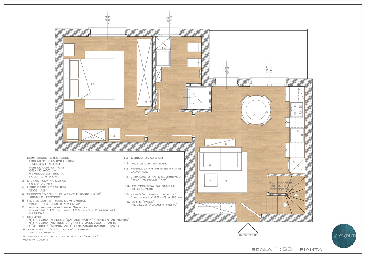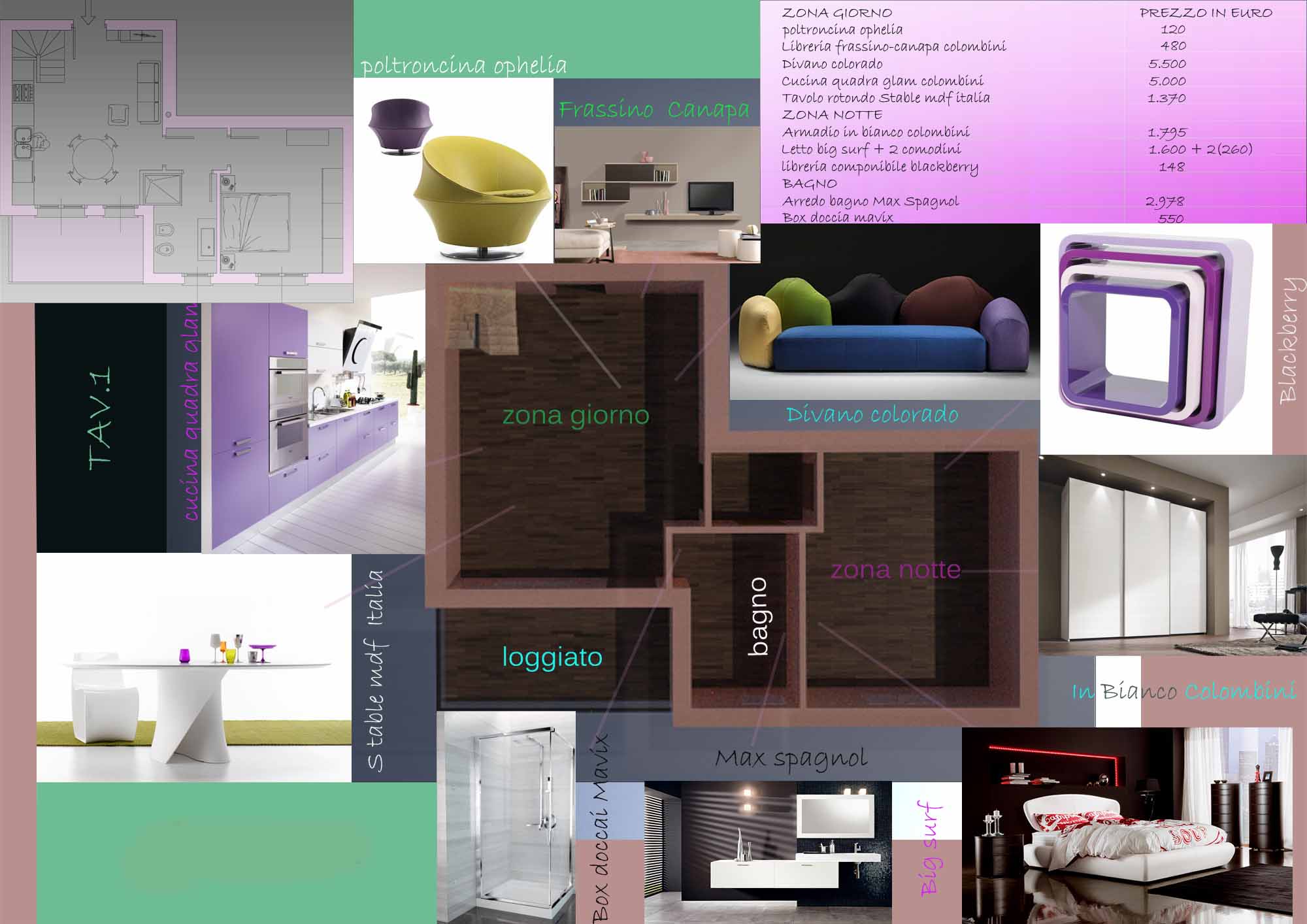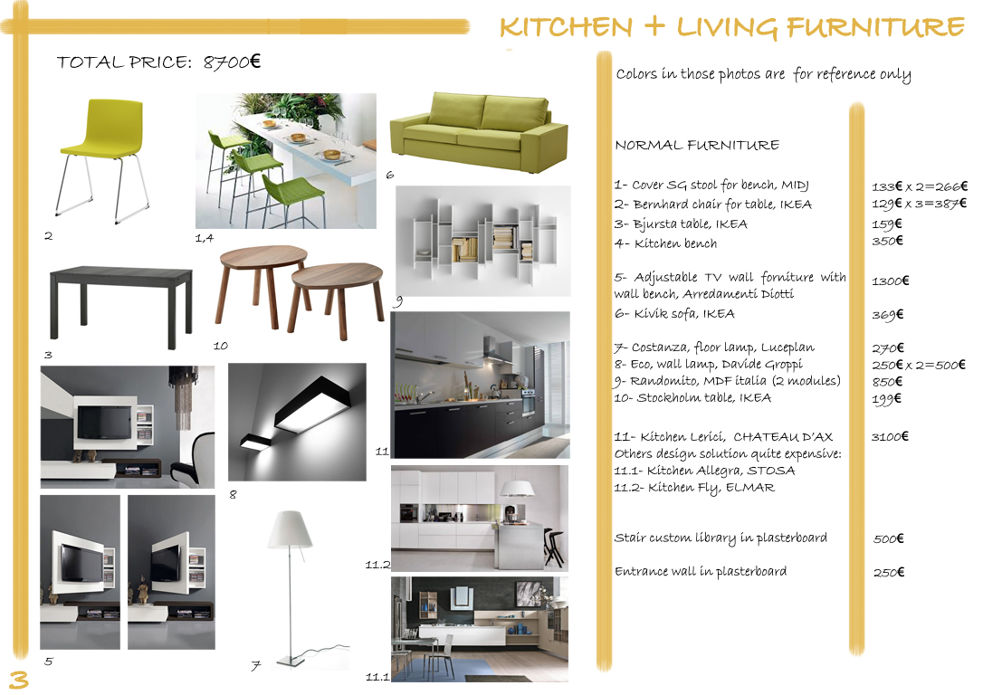 Il progetto nella zona giorno, che avevo ideato è quello avere una bella cucina lineare che si integri con la scala che verrà posizionata accanto . Nell’area restante posizionare un tavolo rotondo dove pranzare e un divano con di fronte la tv.