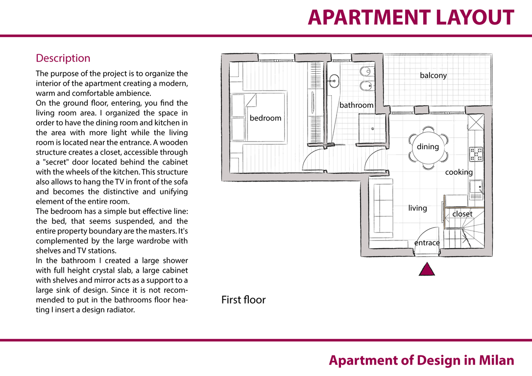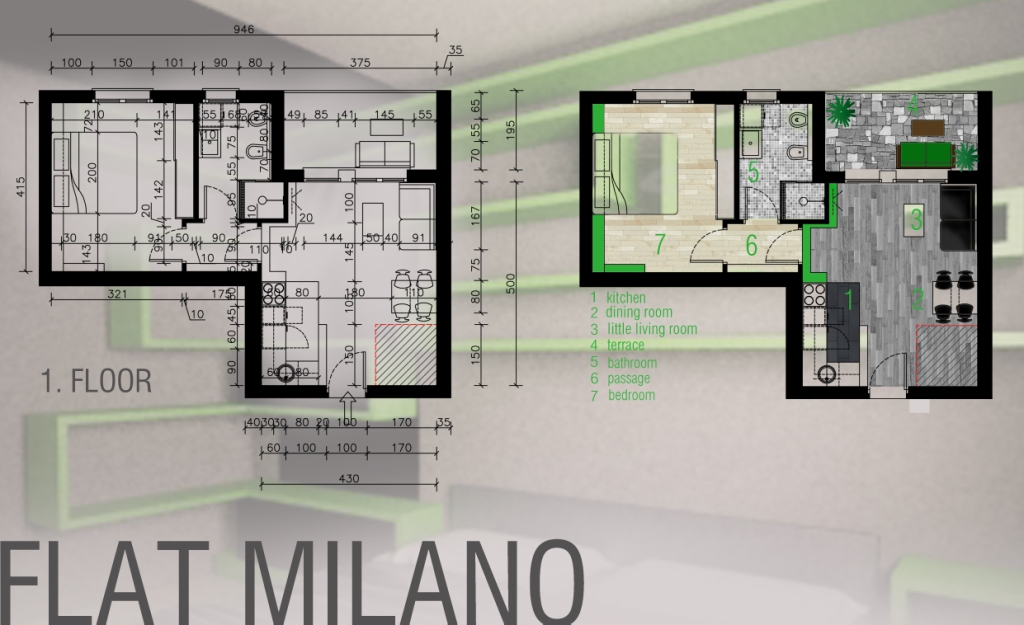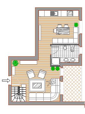 The flat is near to Milan is in a small building made by 4 flats in the ground floor and 4 in the first floor my flat is in the first floor. My flat is composed by living room kitchen, one bathroom , one master bedroom and a balcony. From the entrance on the right will be installed a stairs to go on the loft. I would like to arrange the loft to have a living room with sofa and tv, moreover it has 3 windows on the ceiling.