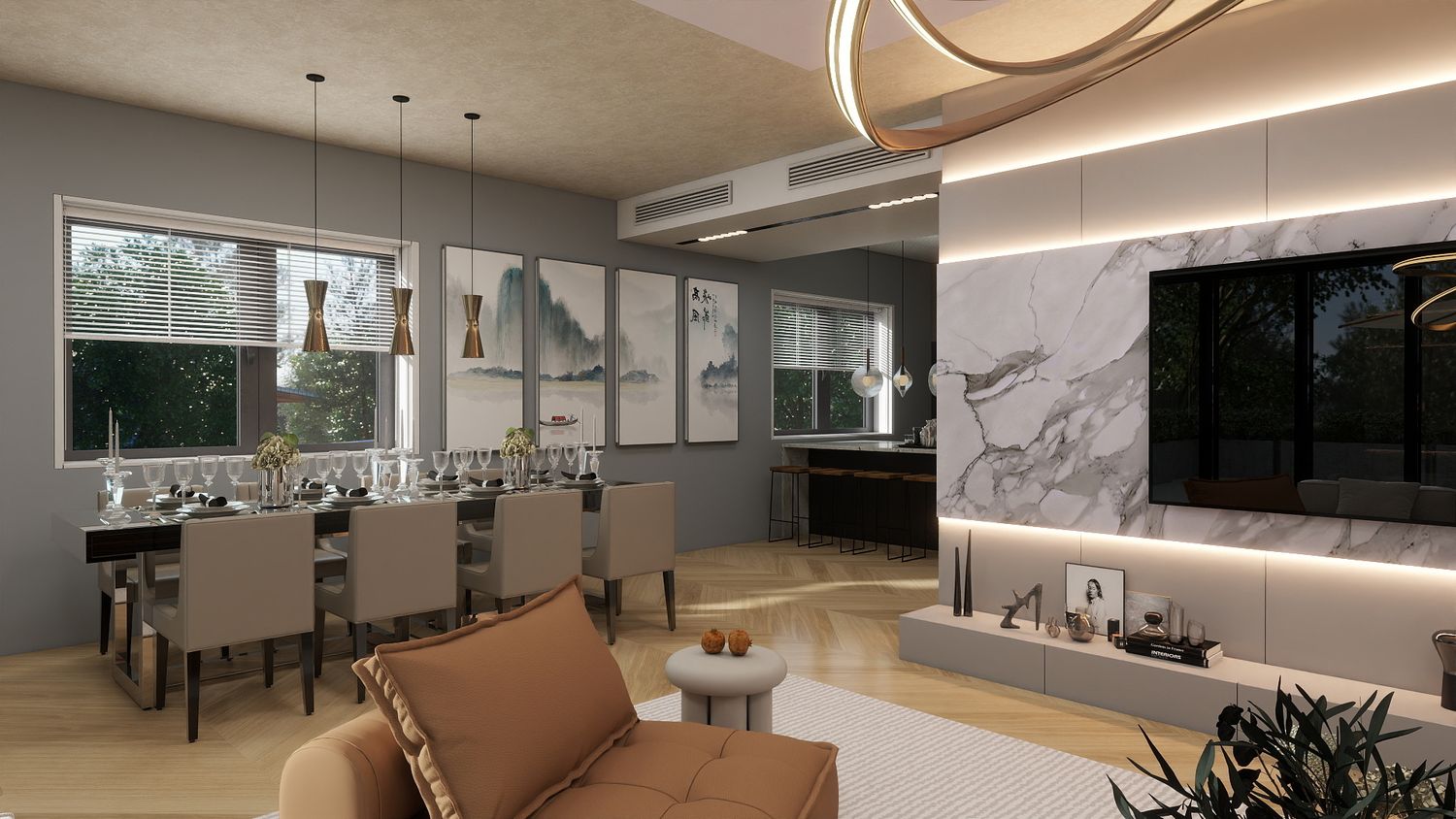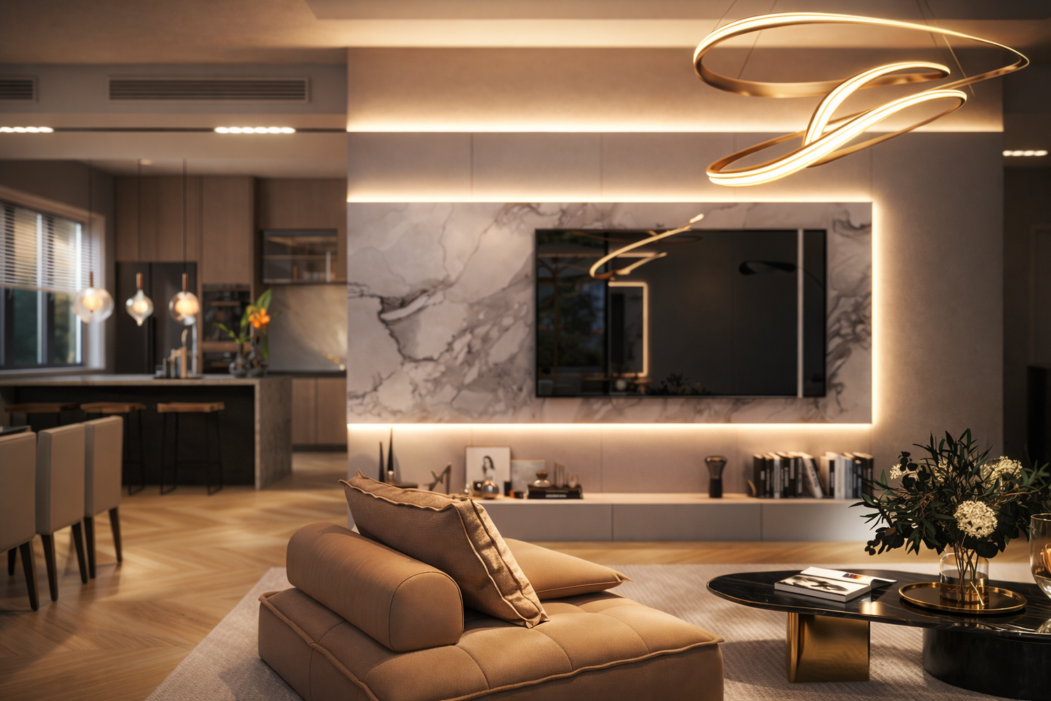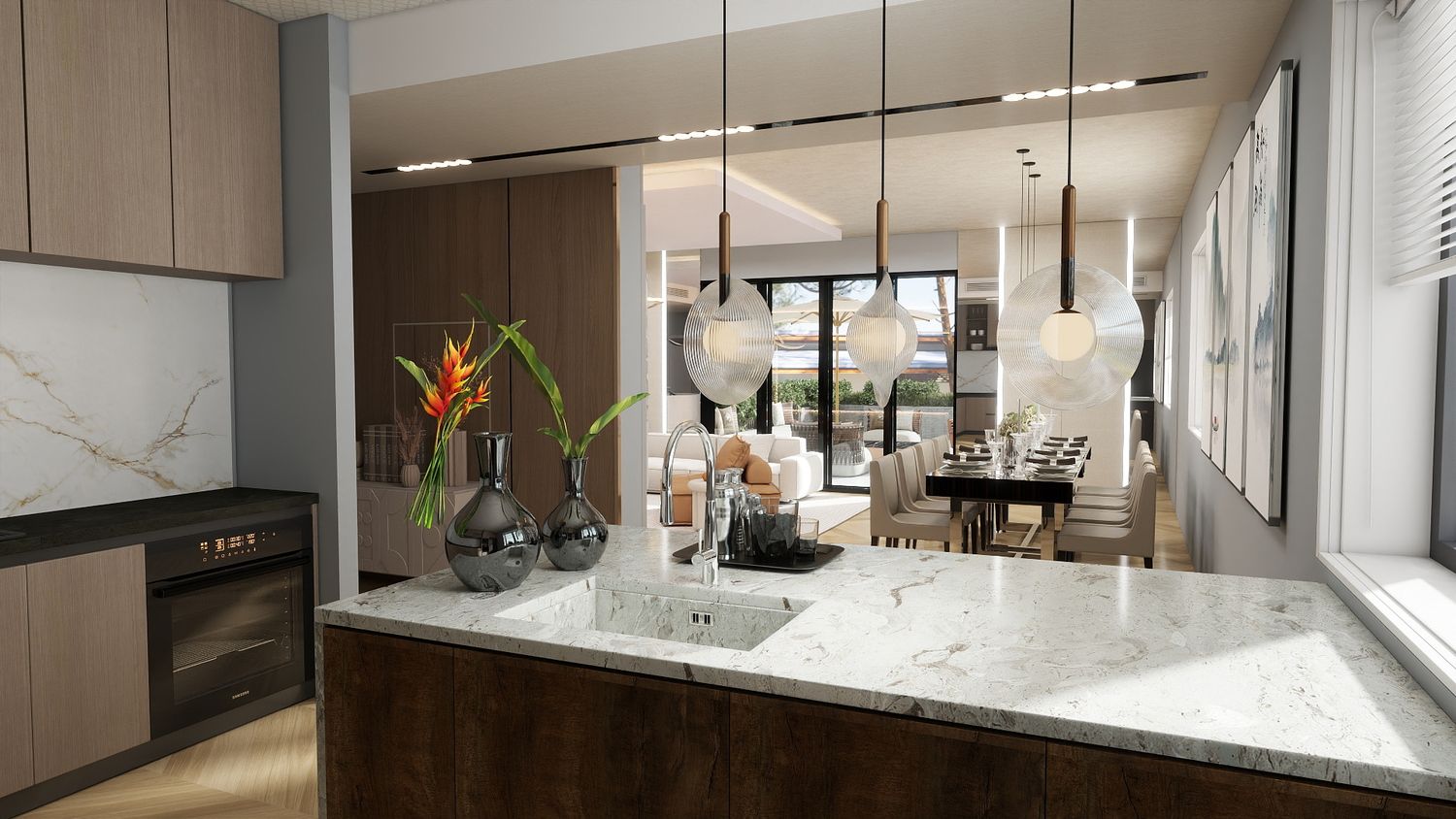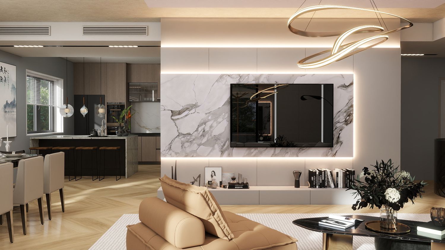 Il progetto propone una redistribuzione funzionale ed equilibrata dell’appartamento, mantenendo come elemento centrale la zona giorno open-space con soggiorno e cucina in diretto rapporto con il terrazzo, come richiesto.