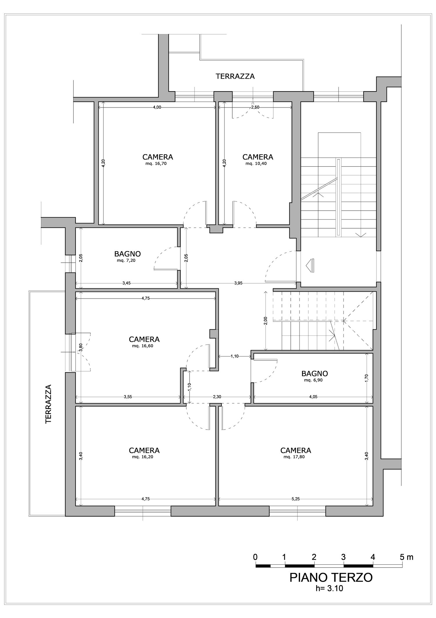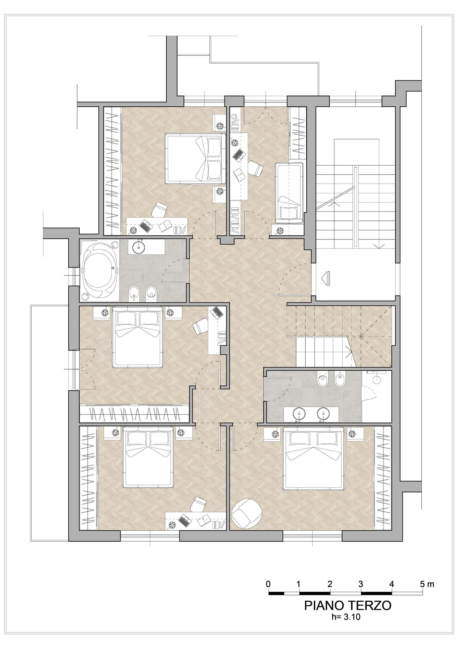 piano terzo: 5 camere da letto di dimensioni comprese fra i 10 e i 17 mq, ampie abbastanza da poter essere arredate con letto singolo standard (camera da 10 mq), doppio queen size oppure king size (le più grandi), capiente armadiatura ed eventuale scrivania; due comodi bagni di circa 7 mq ciascuno, dotati di sanitari, lavabo singolo o doppio, ampia doccia o vasca idromassaggio;