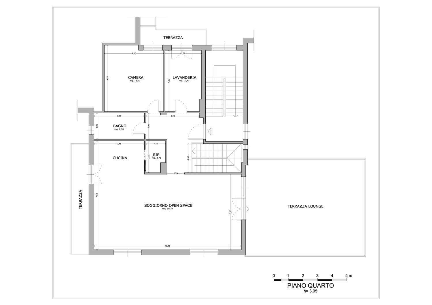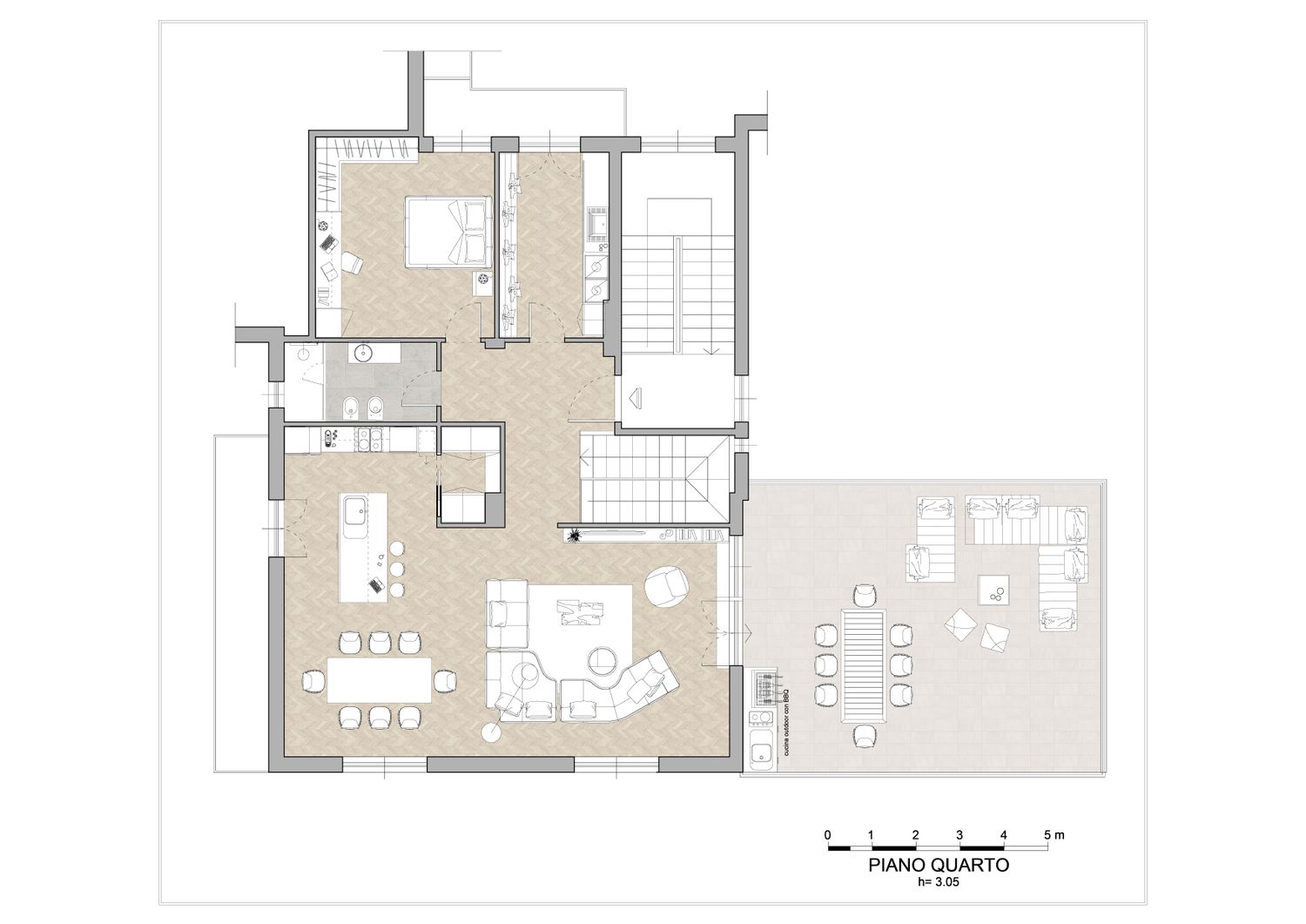 piano quarto: grande e signorile soggiorno open space affacciato sulla terrazza lounge, con cucina a vista con isola centrale, comoda zona pranzo e area divani molto ampia. All'esterno, la terrazza viene attrezzata come una estensione del living, con zona divani, tavolo da pranzo e cucina outdoor dotata di barbecue e frigo bar. Inoltre: camera di 18 mq con capiente armadiatura, letto doppio king o queen size, scrivania; terzo bagno con sanitari, lavabo e ampia doccia; locale lavanderia con parete attrezzata, lavasciuga, stenditoi e lavabo/lavatoio; piccolo spazio ripostiglio/dispensa con accesso diretto dalla zona cucina.