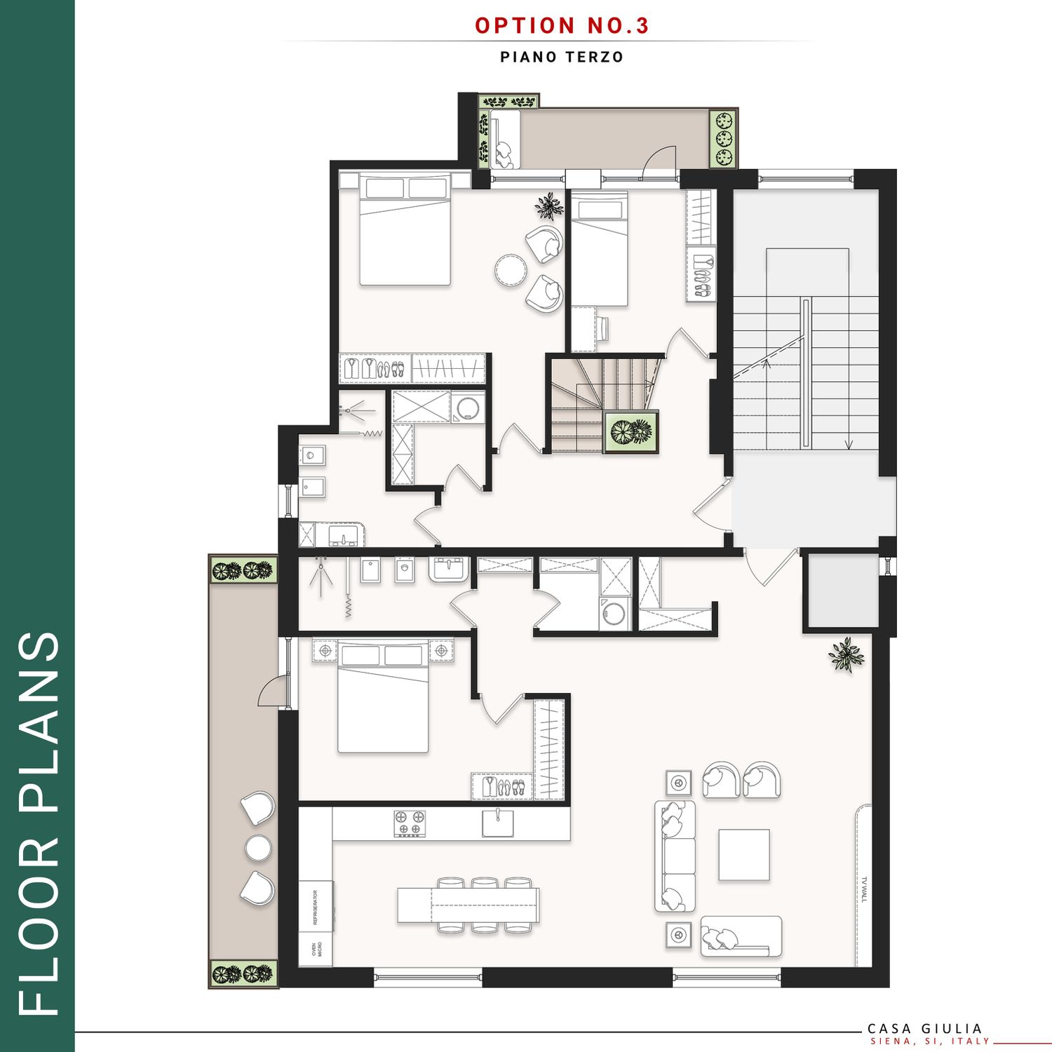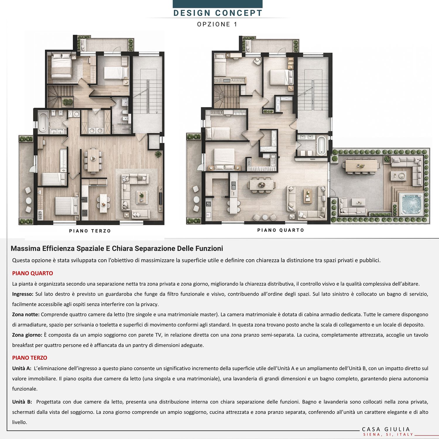 Each solution is explained in detail in the presentation boards, with a focus on layout logic and furnishing.