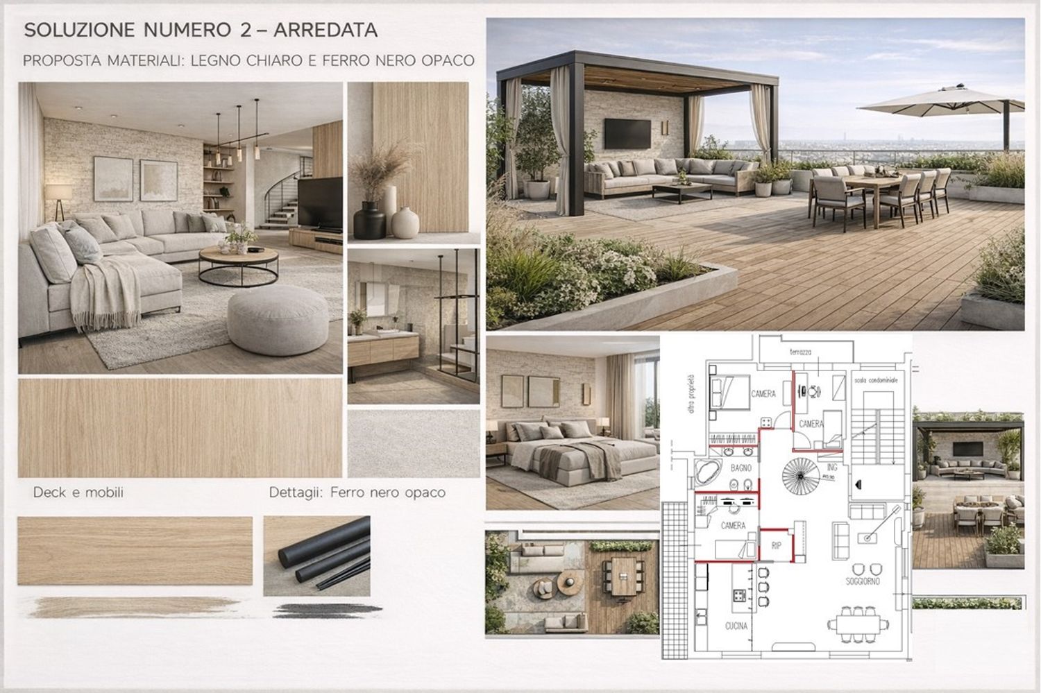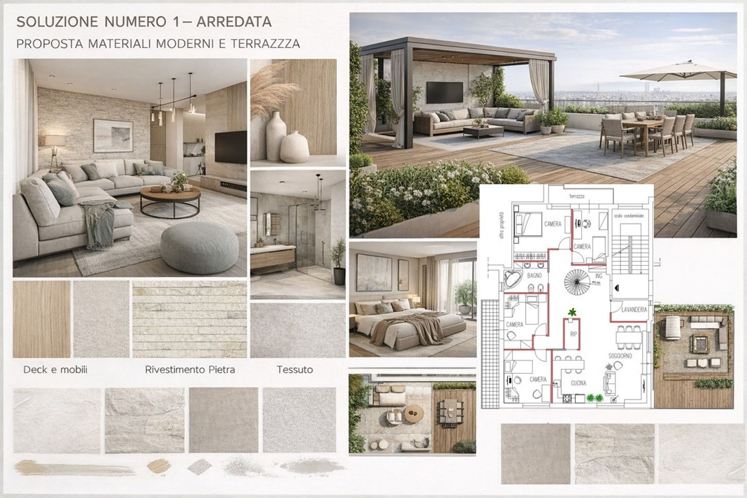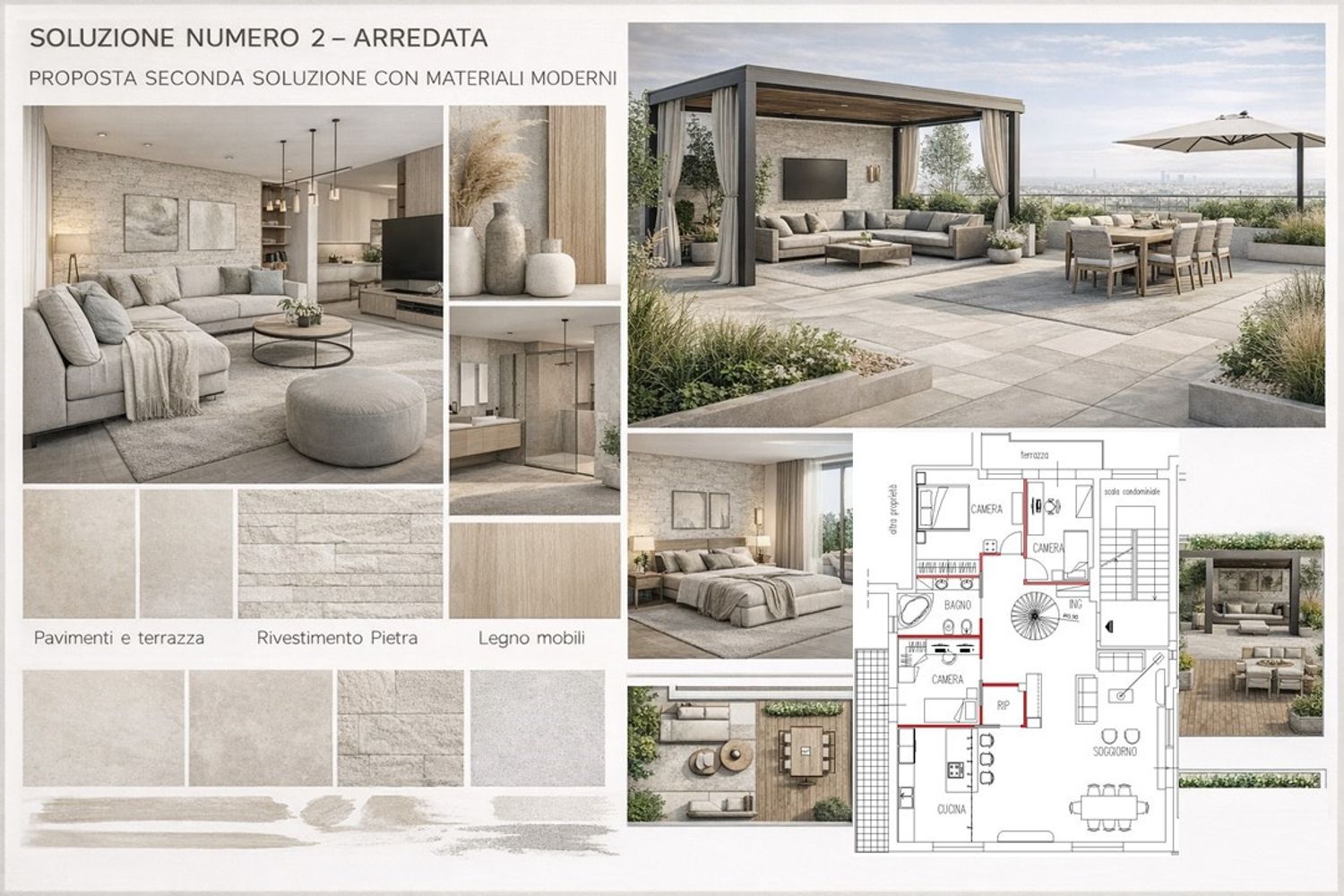 Per ciascuna soluzione sono state elaborate sia la pianta di demolizione e ricostruzione, per rendere chiari gli interventi sull’esistente, sia la pianta arredata, così da offrire una visione concreta e immediata degli spazi. A completamento del progetto sono state sviluppate tre proposte grafiche materiche, pensate per suggerire atmosfere, finiture e combinazioni di materiali coerenti con uno stile contemporaneo e rilassante. È inoltre presente una soluzione arredata dedicata al terrazzo, concepito come vera estensione della zona giorno e spazio da vivere in ogni momento.