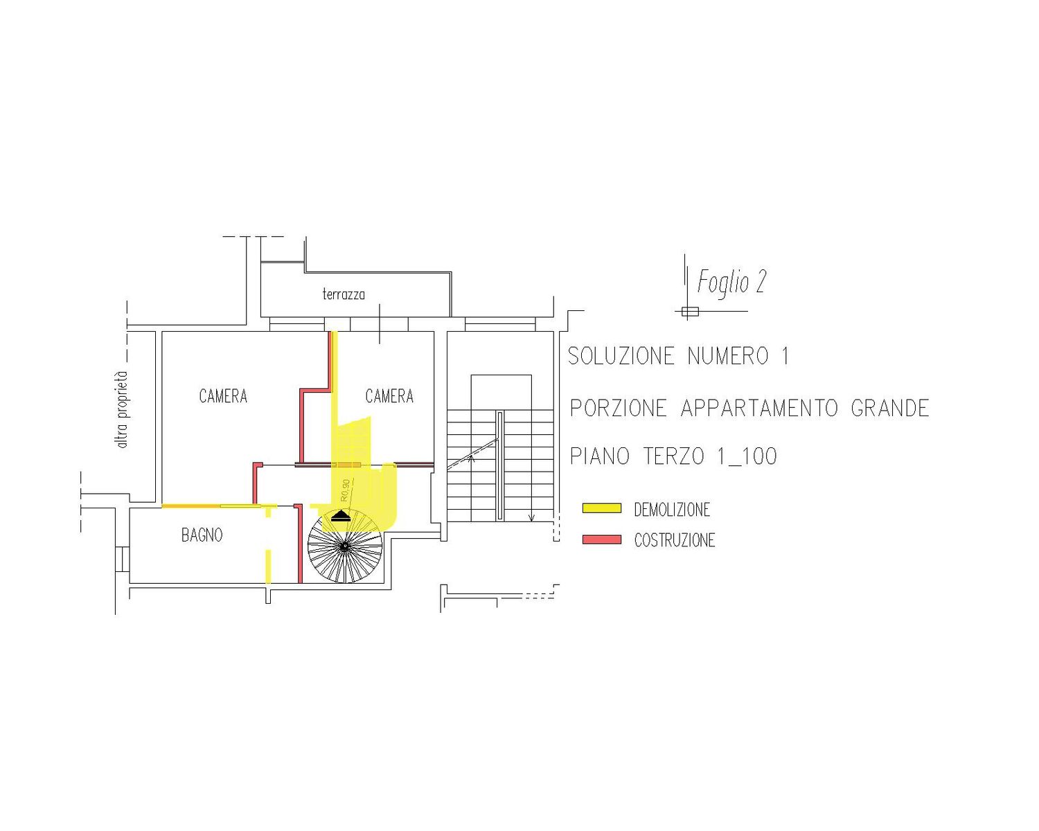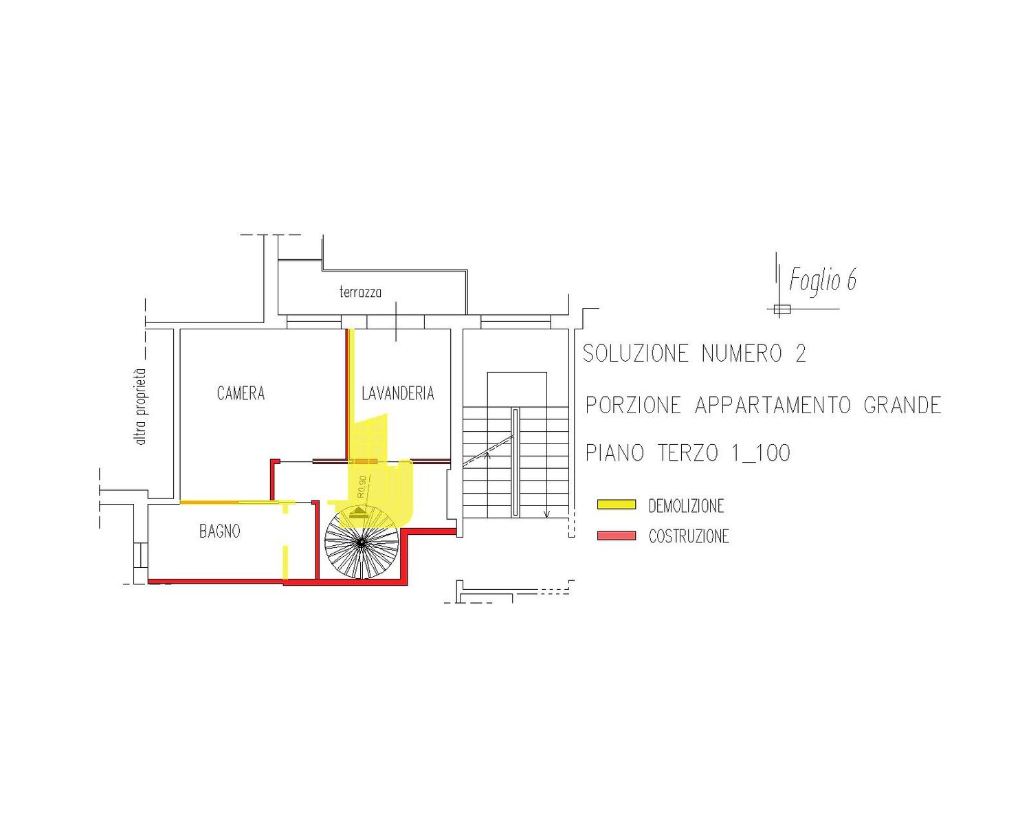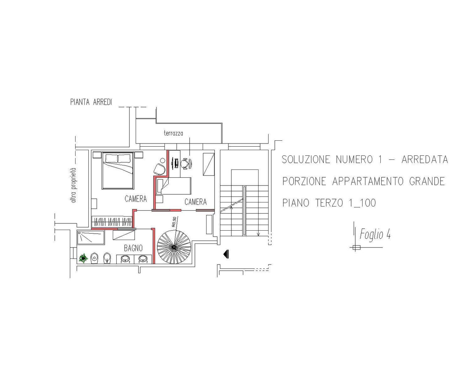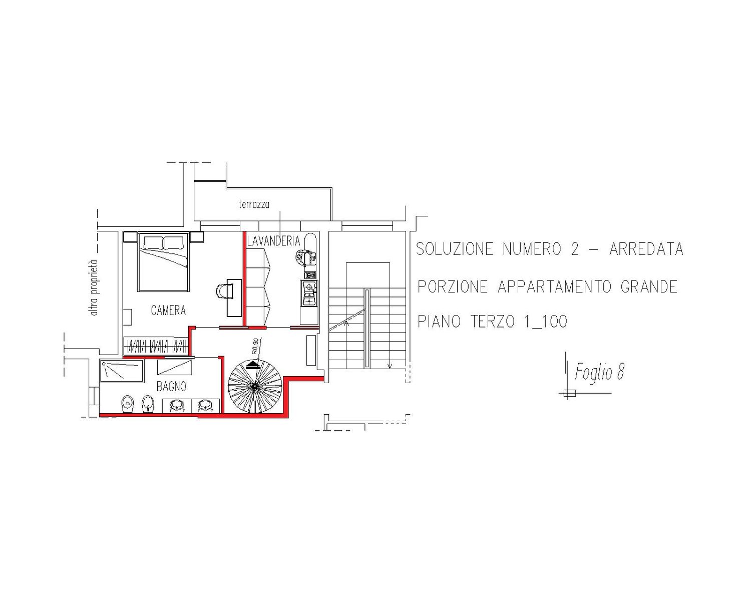 In entrambe le soluzioni per l’appartamento grande, la nuova scala a chiocciola è collocata al centro della casa, in una posizione strategica e baricentrica, vicino all’ingresso, diventando l’elemento di connessione verticale tra i due livelli e liberando superficie utile per le stanze. Questo intervento consente di recuperare pienamente gli ambienti richiesti e di migliorare la fluidità distributiva dell’intero appartamento.