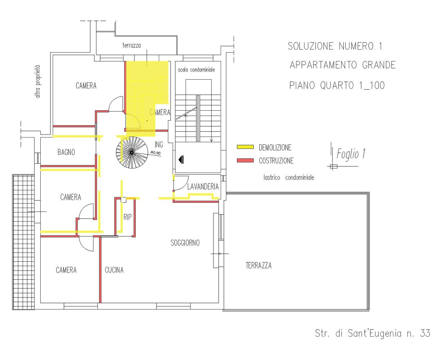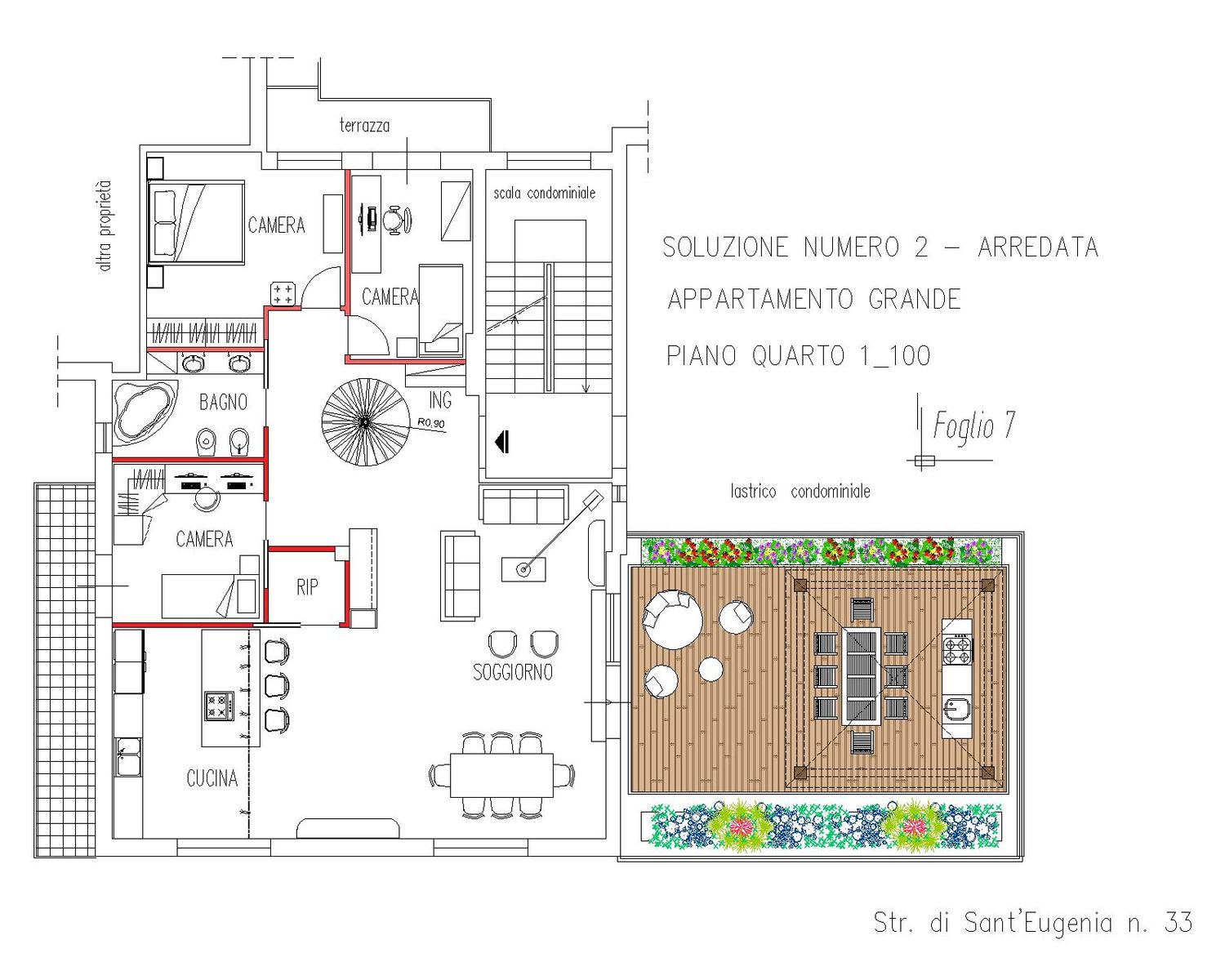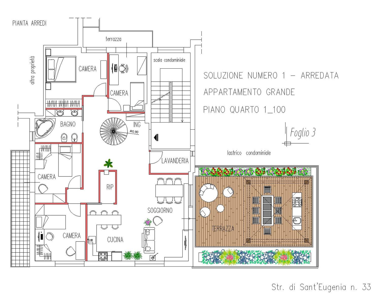 Nella prima soluzione per l’appartamento grande sono state ricavate sei camere da letto, due bagni e una lavanderia, rispettando tutti i requisiti funzionali richiesti. Successivamente, a seguito della volontà del committente di ridurre il numero delle camere a quattro, è stata sviluppata una seconda soluzione alternativa: in questo caso la zona giorno viene ulteriormente ampliata, rafforzando il rapporto con il terrazzo, e anche la lavanderia acquista maggiore spazio e comfort, mantenendo comunque un’elevata qualità distributiva e abitativa.