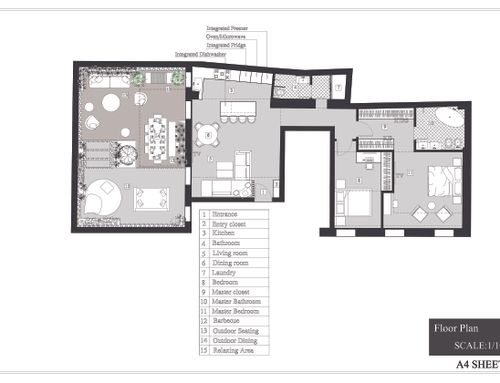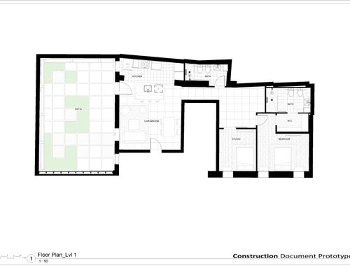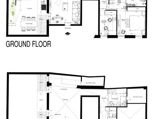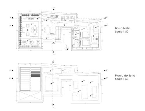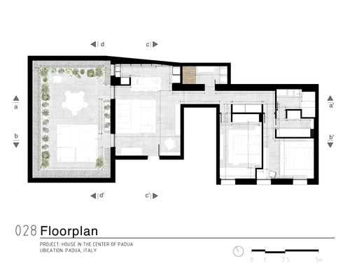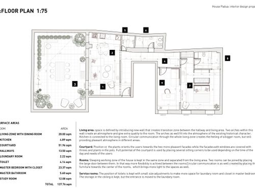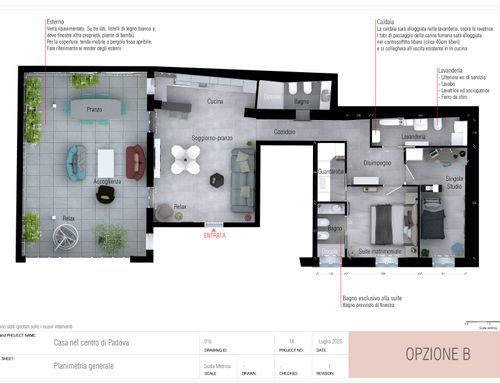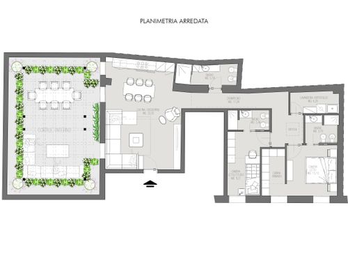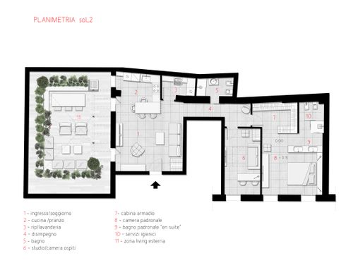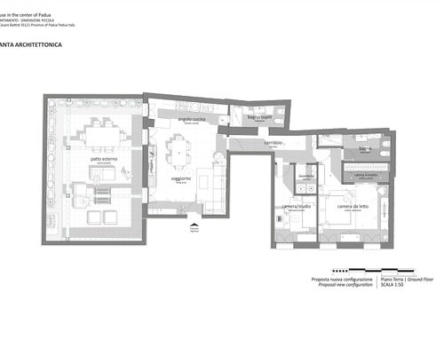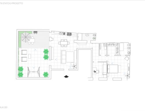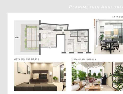 Dall'appartamento si vorrebbero ottenere una camera matrimoniale con bagno e stanza guardaroba (suite), uno studio/camera singola, un ulteriore bagno, un ripostiglio lavanderia e una zona giorno con cucina che permetta di sfruttare pienamente il cortile terrazzato, annesso all'appartamento. L'appartamento gode di altezze importanti (3,9m) che dovranno essere opportunamente sfruttate creando giochi con i controsoffitti ed eventualmente delle nuove superfici. Si prevede di demolire tutte le tramezze e ricostruirle, il rifacimento di tutti gli impianti e serramenti (interni esterni) e di tutti i pavimenti che dovranno essere di gres porcellanato preferibilmente di grande formato. Il riscaldamento sarà a pavimento. Molto importante sarà l'arredo della corte interna che richiede la capacità attraverso piante e altre soluzioni di eliminare dalla vista una serie di elementi architettonici brutti (finestre di servizio etc).