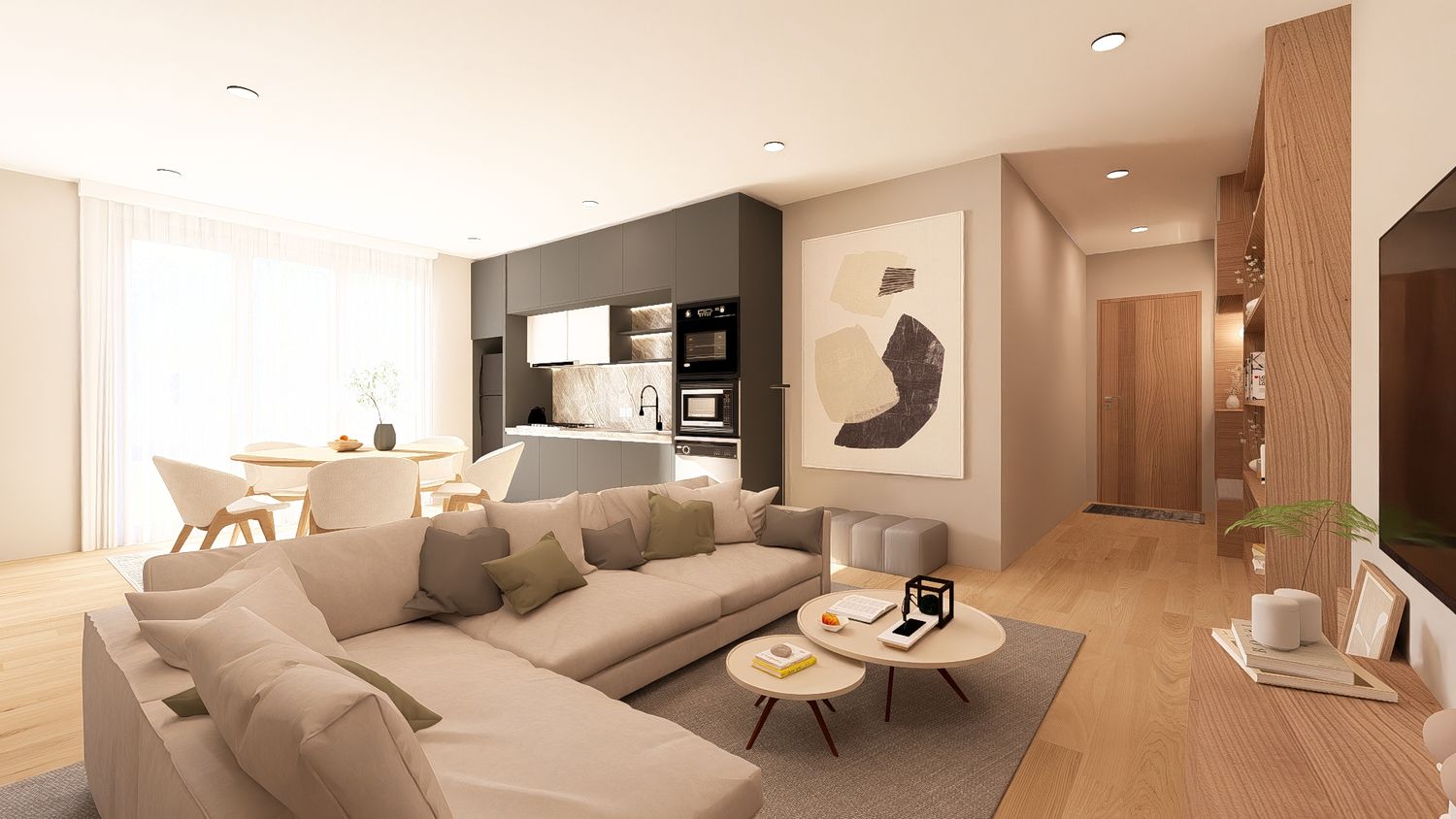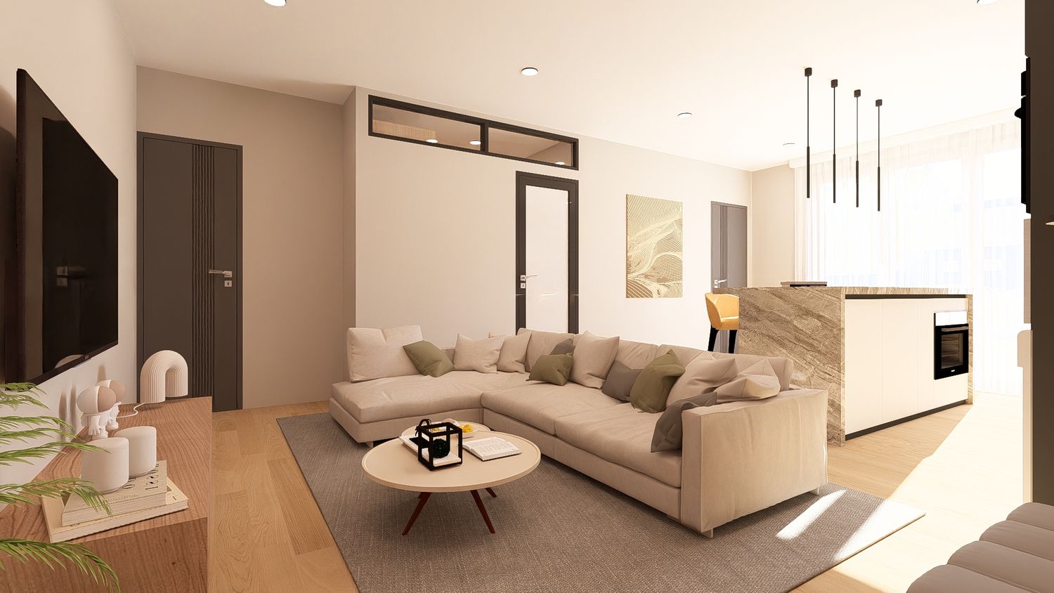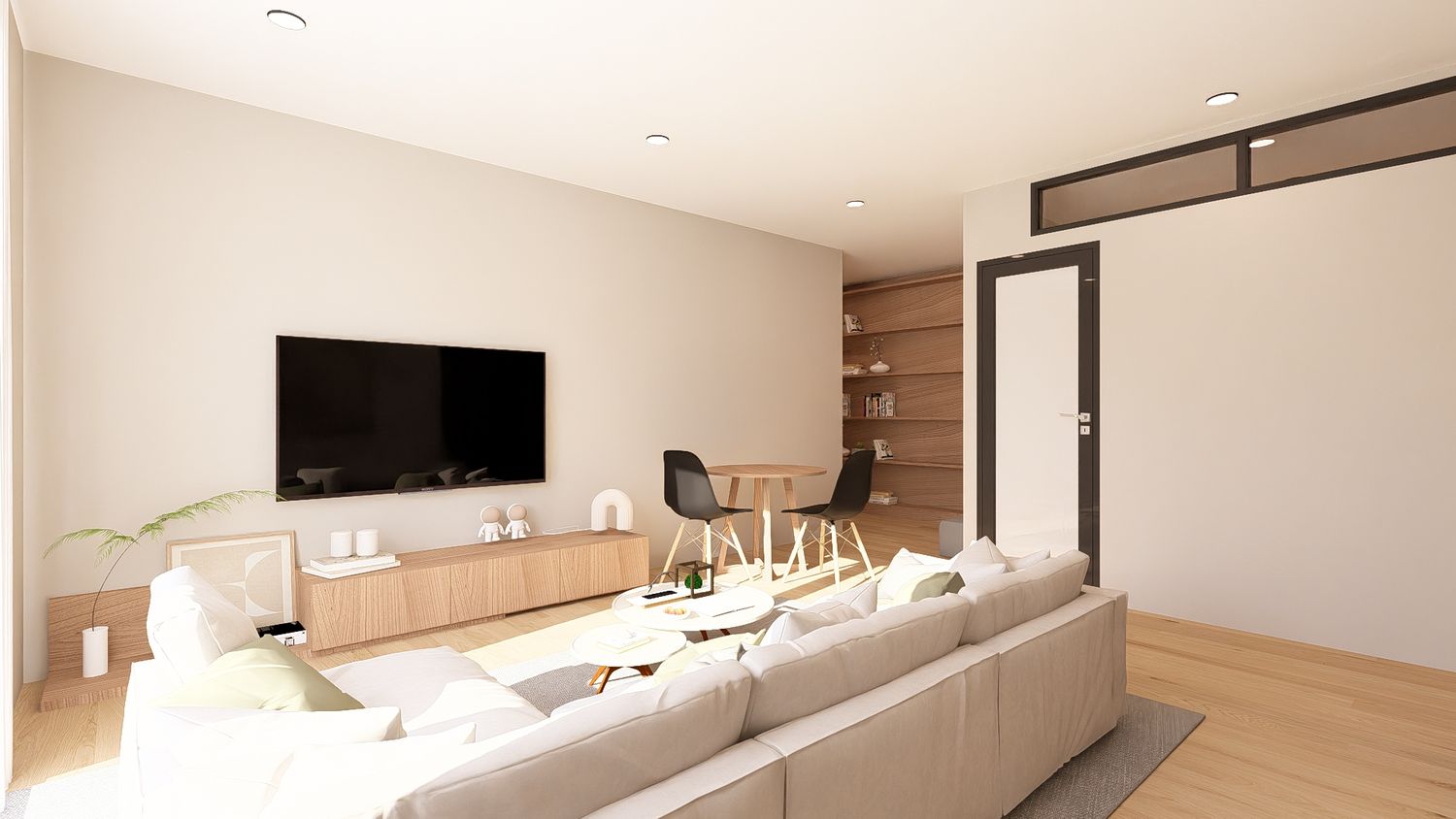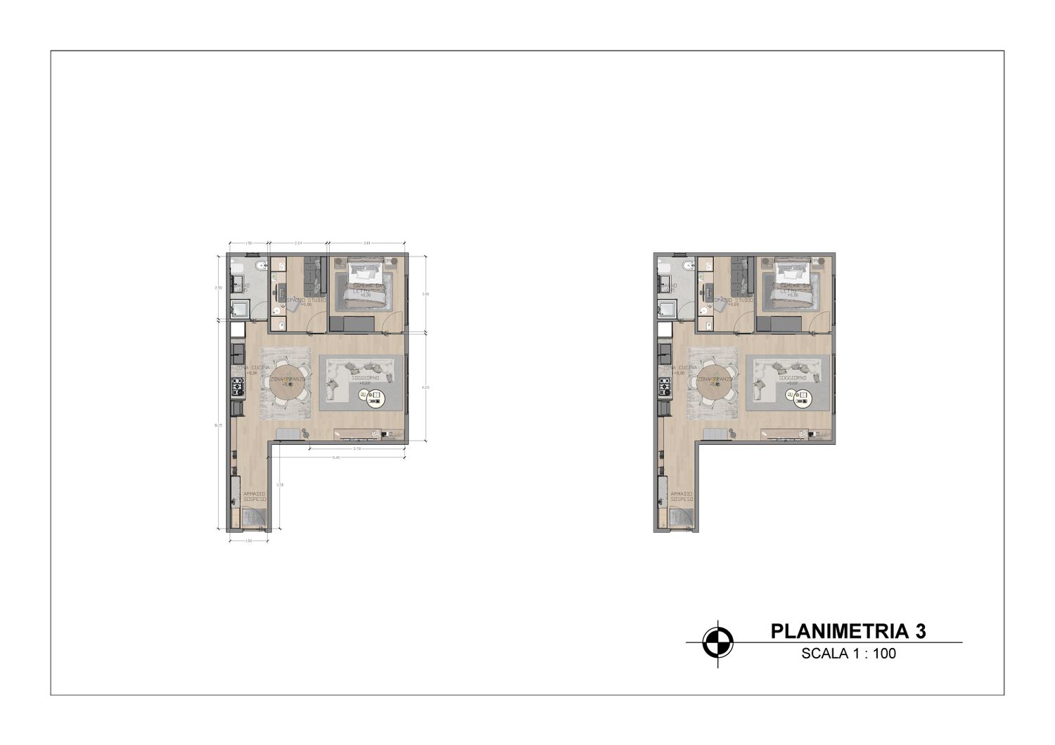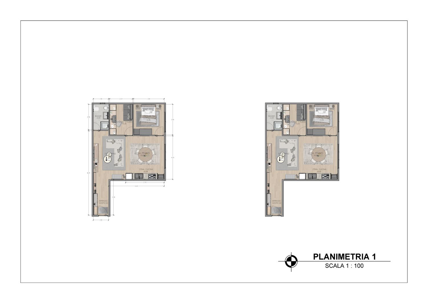 Questa configurazione offre una chiara separazione tra zona giorno e zona notte, migliorando il comfort abitativo. L’open space soggiorno-cucina resta luminoso e ben proporzionato, mentre la zona studio assume un carattere più raccolto ma sempre illuminato da luce indiretta. Ideale per chi desidera maggiore ordine funzionale senza rinunciare alla flessibilità.