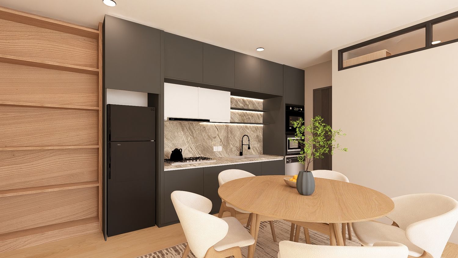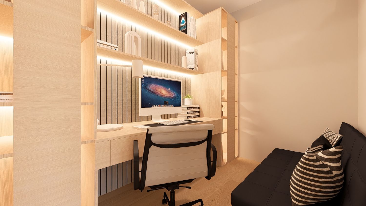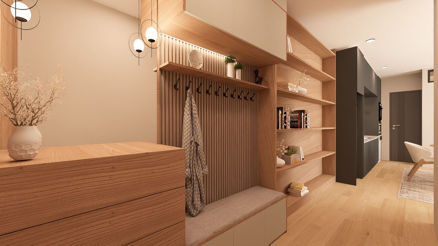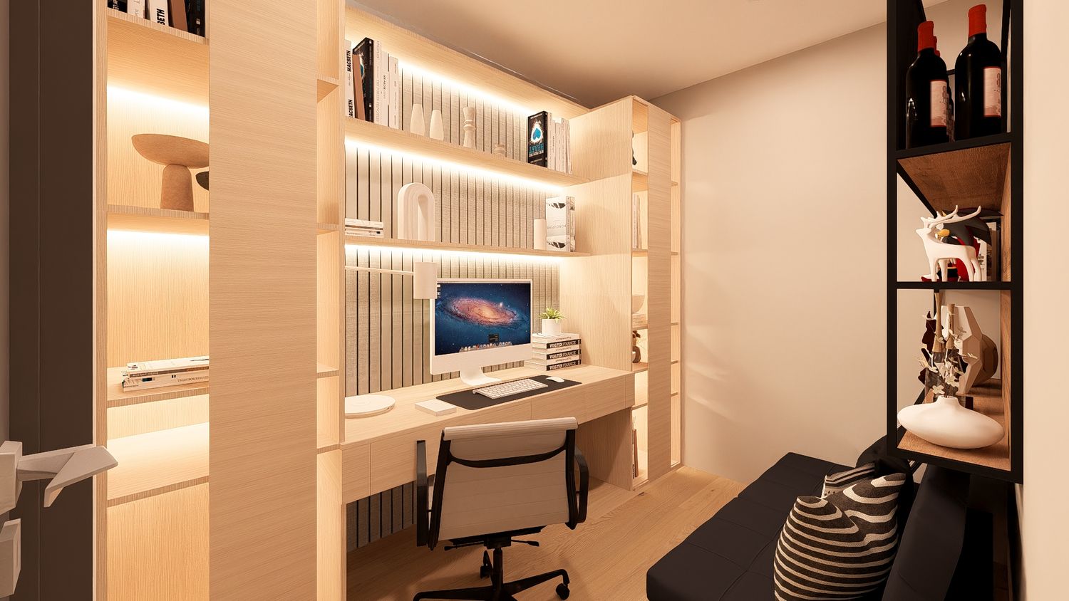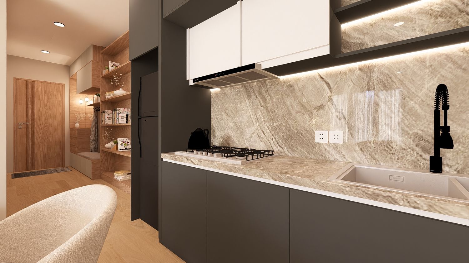 Questa configurazione offre una chiara separazione tra zona giorno e zona notte, migliorando il comfort abitativo. L’open space soggiorno-cucina resta luminoso e ben proporzionato, mentre la zona studio assume un carattere più raccolto ma sempre illuminato da luce indiretta. Ideale per chi desidera maggiore ordine funzionale senza rinunciare alla flessibilità.