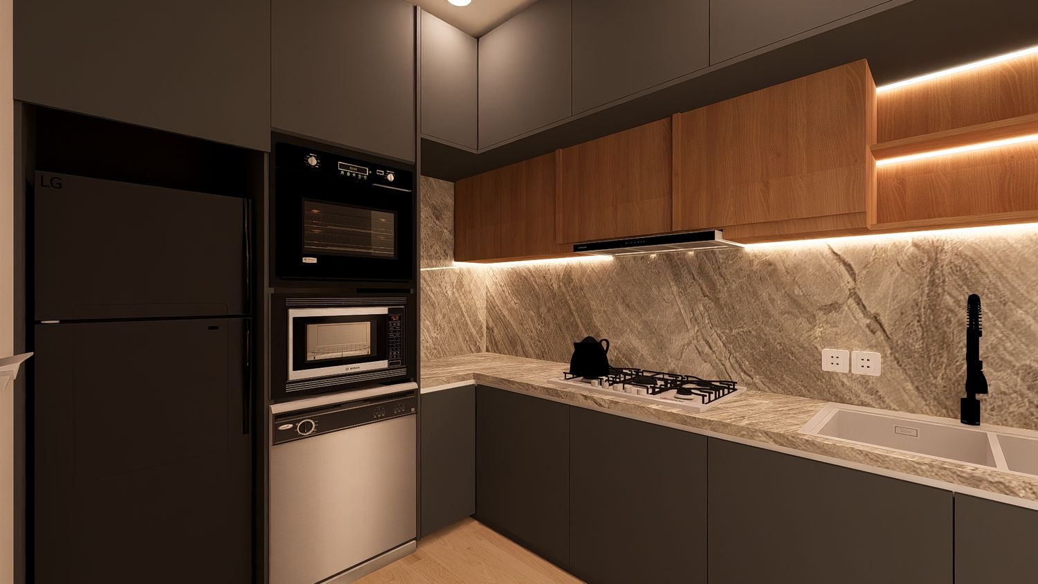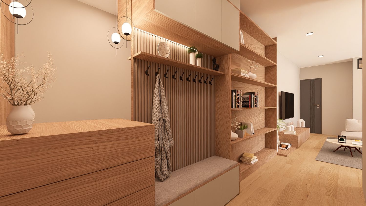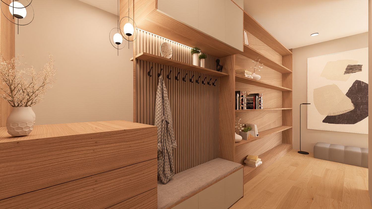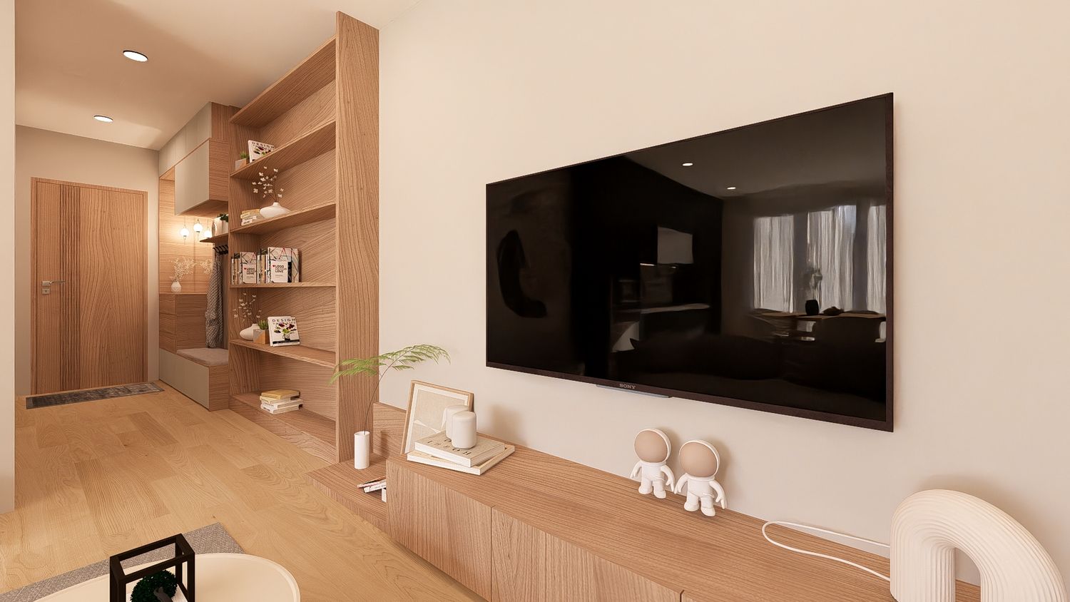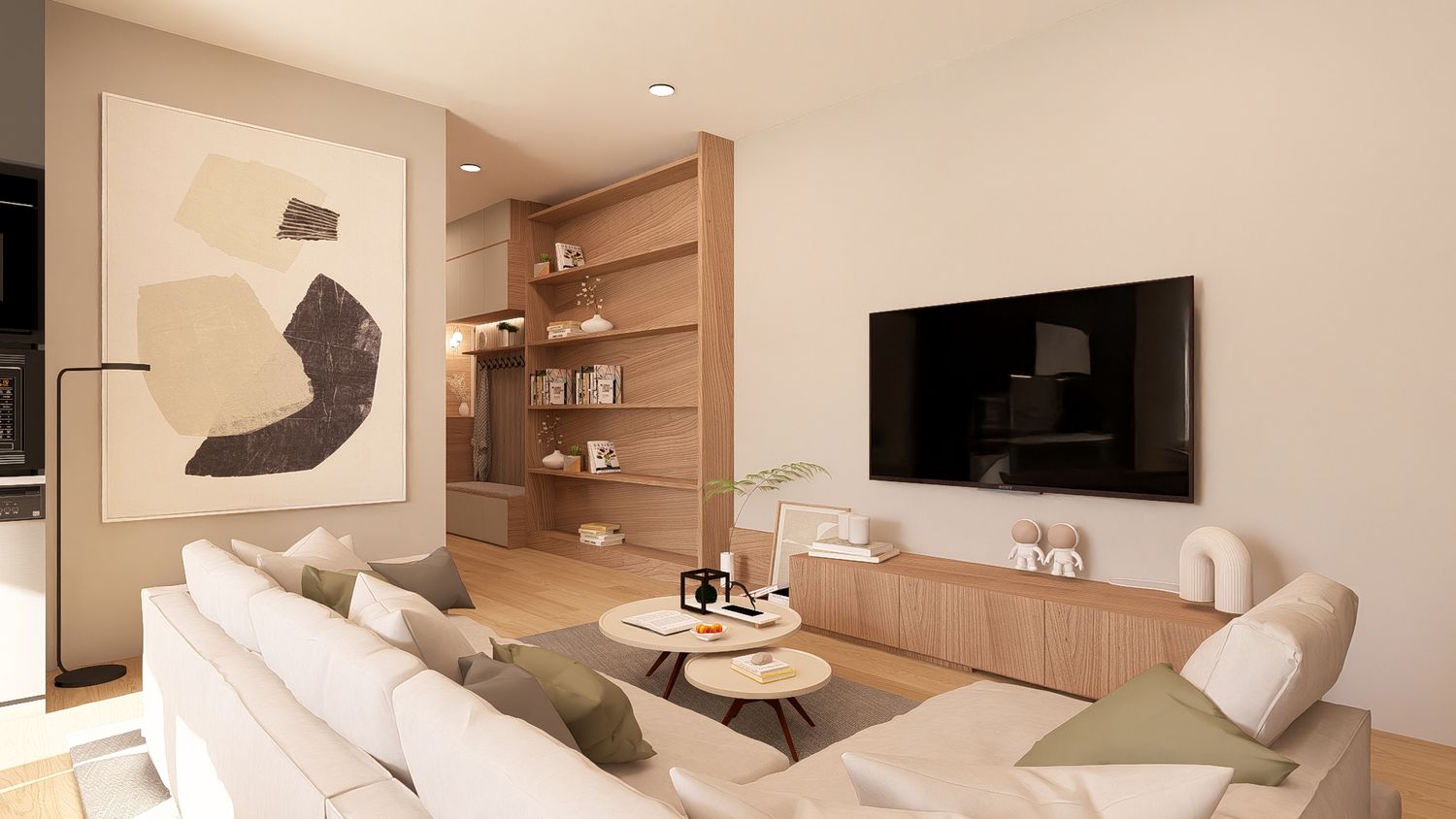 Questa configurazione offre una chiara separazione tra zona giorno e zona notte, migliorando il comfort abitativo. L’open space soggiorno-cucina resta luminoso e ben proporzionato, mentre la zona studio assume un carattere più raccolto ma sempre illuminato da luce indiretta. Ideale per chi desidera maggiore ordine funzionale senza rinunciare alla flessibilità.