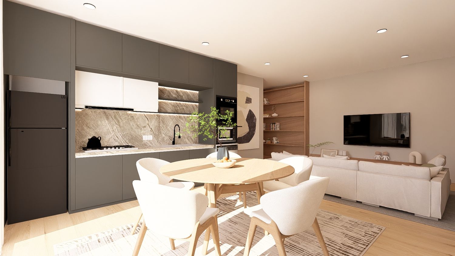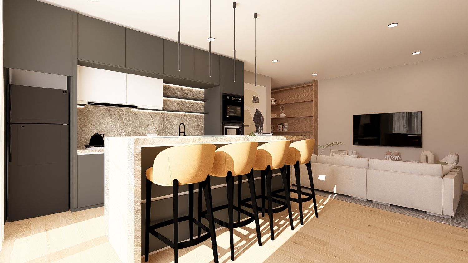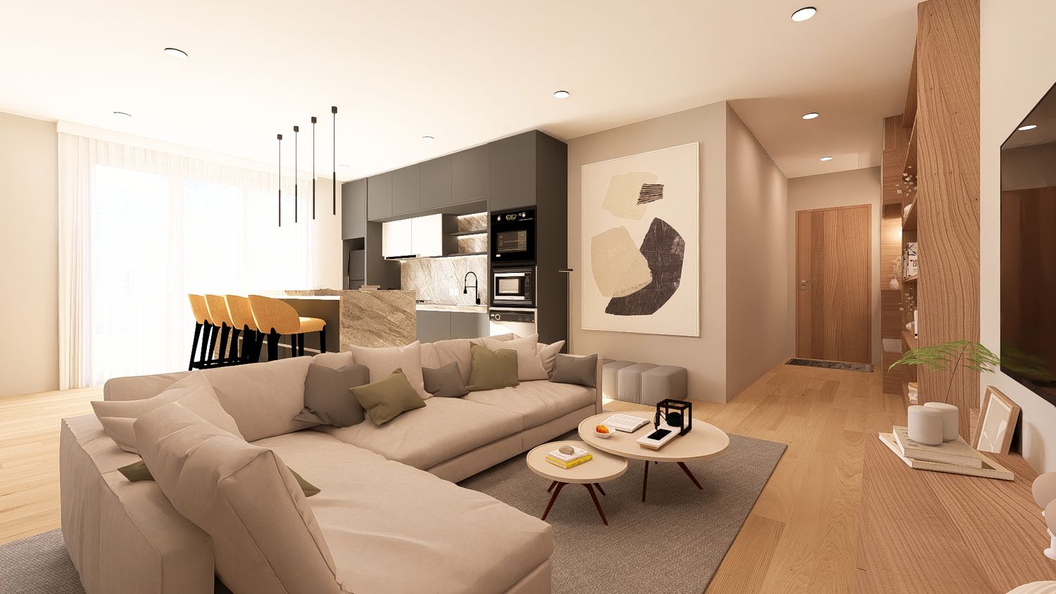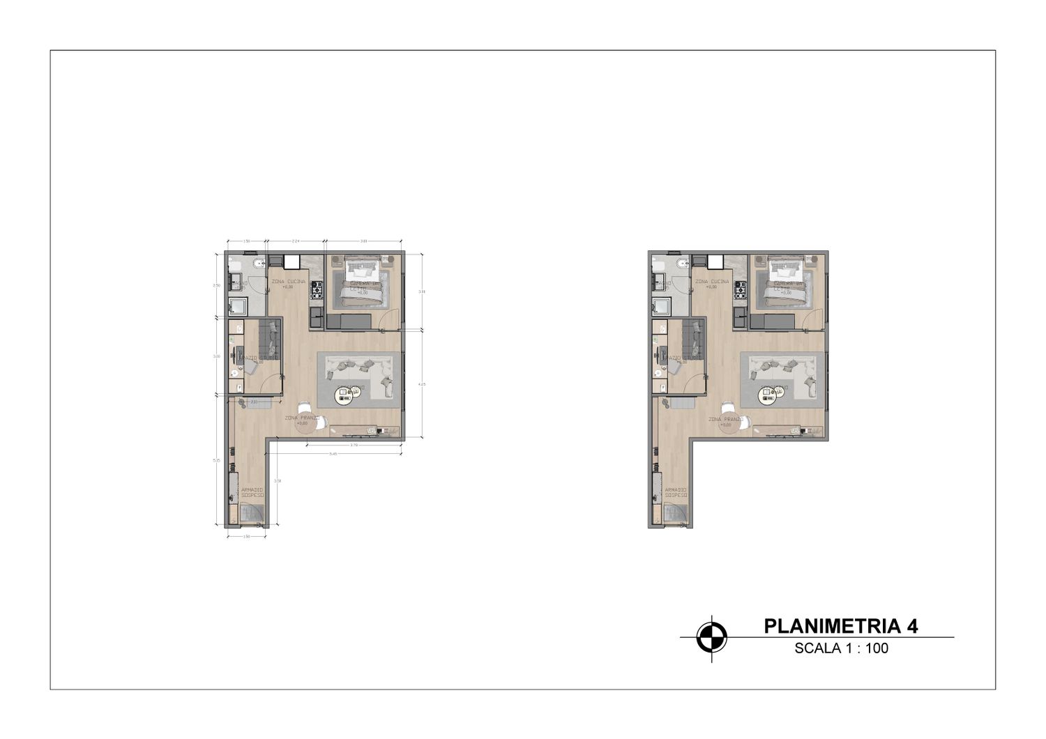 La quarta opzione massimizza la funzionalità complessiva dell’appartamento, sfruttando ogni metro quadrato in modo efficiente. La disposizione degli arredi rende gli spazi versatili e facilmente adattabili nel tempo. L’open space risulta equilibrato, la camera principale confortevole e lo studio perfettamente utilizzabile anche come spazio notte aggiuntivo.