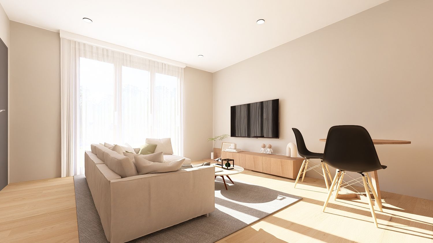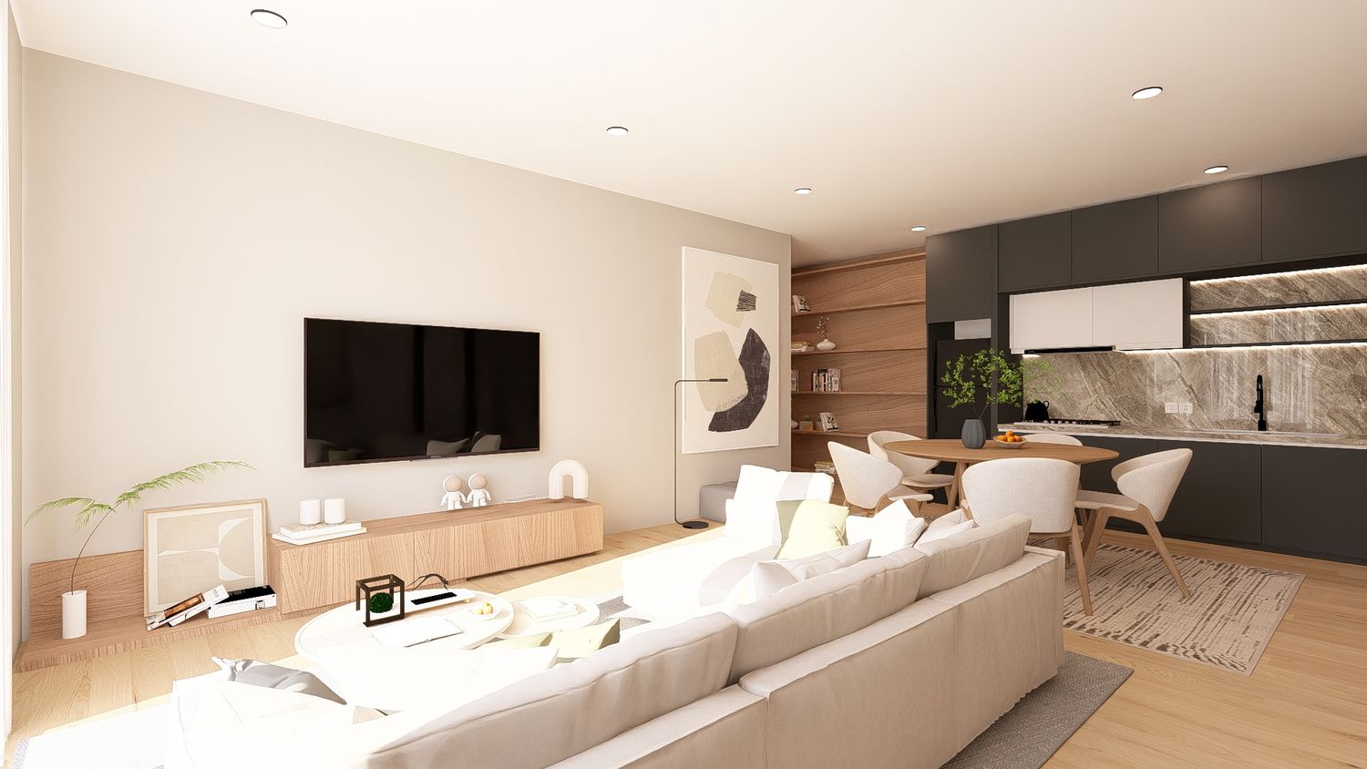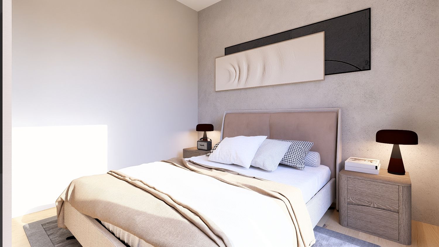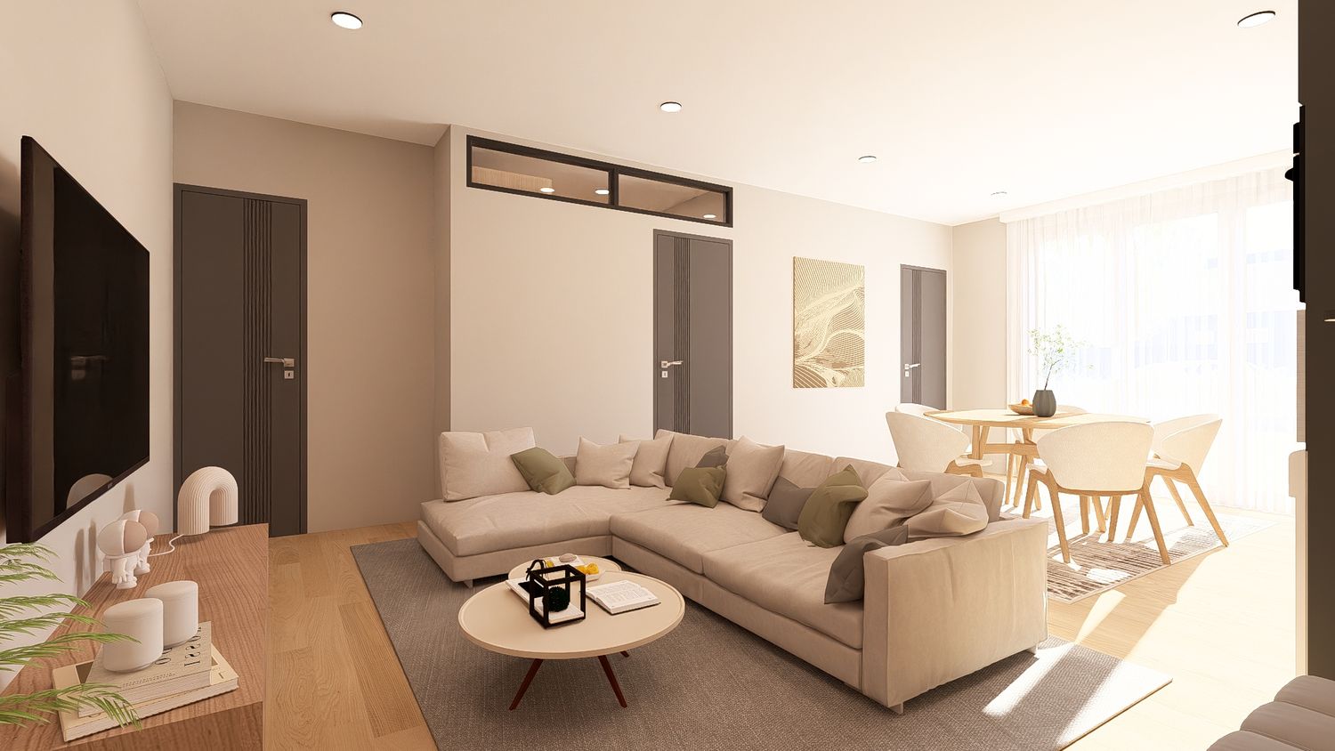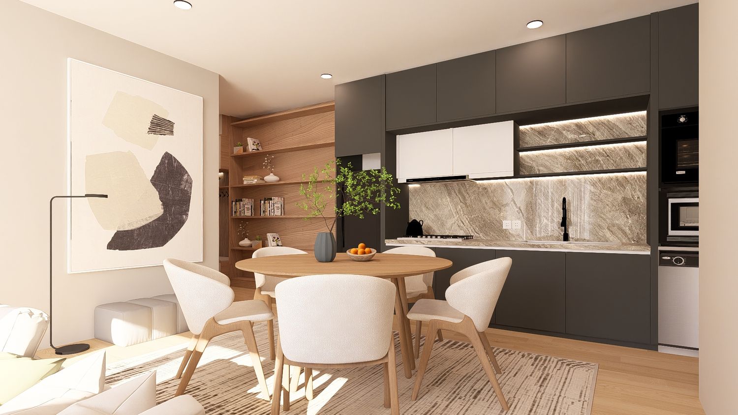 La quarta opzione massimizza la funzionalità complessiva dell’appartamento, sfruttando ogni metro quadrato in modo efficiente. La disposizione degli arredi rende gli spazi versatili e facilmente adattabili nel tempo. L’open space risulta equilibrato, la camera principale confortevole e lo studio perfettamente utilizzabile anche come spazio notte aggiuntivo.