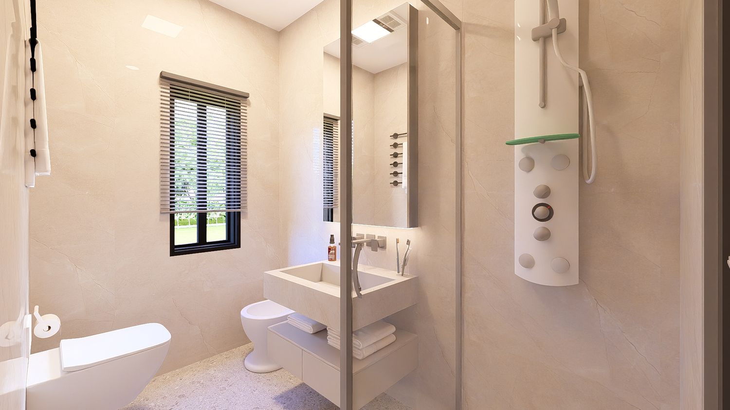 Questa soluzione privilegia un open space ampio e continuo tra soggiorno e cucina, massimizzando la percezione di spazio e la luminosità naturale. La zona studio, pur priva di finestra esterna, riceve luce indiretta dagli ambienti adiacenti ed è dimensionata per ospitare anche un letto singolo. La distribuzione è semplice, fluida e senza spazi di passaggio inutilizzati.