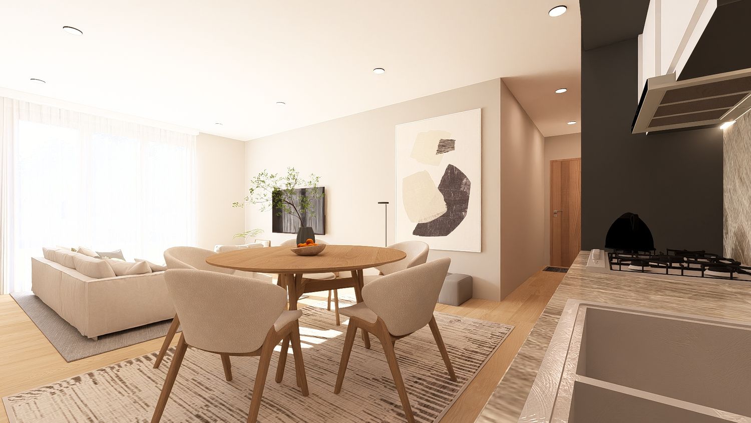In questa opzione la cucina è più definita ma rimane visivamente connessa al soggiorno, garantendo ordine e funzionalità. La zona notte principale risulta più protetta e silenziosa, mentre lo studio è ben integrato e multifunzionale. La soluzione ottimizza l’uso dello spazio mantenendo un buon equilibrio tra apertura e privacy.