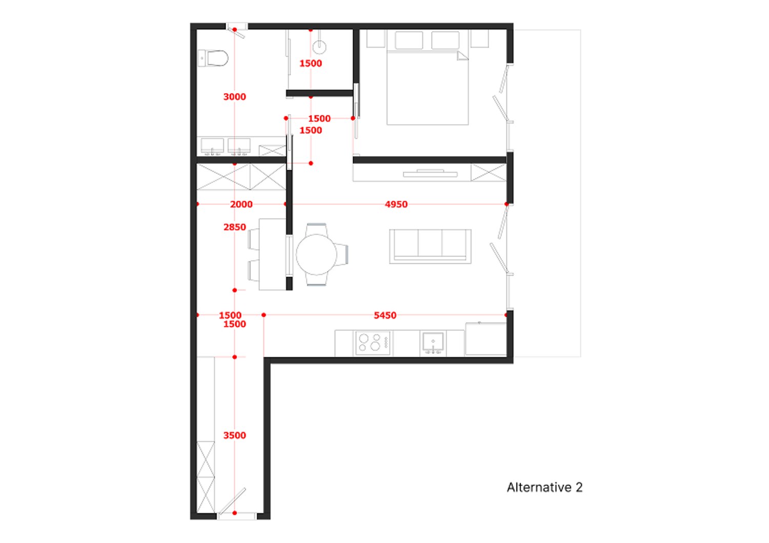 Alt 2: This alternative offers a more defined and organised space, suitable if you want a clear separation between work and relaxation functions.