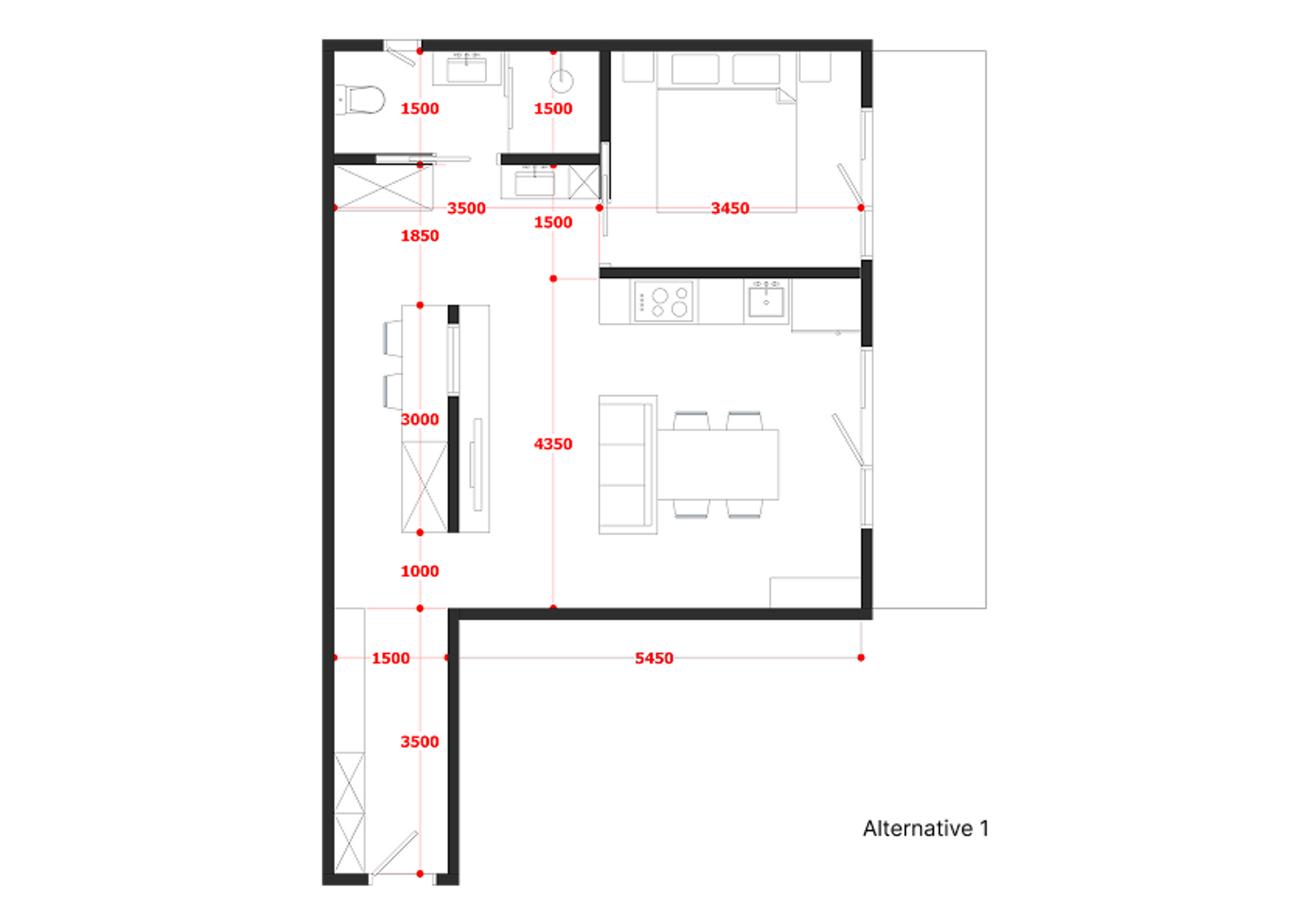 Alt 1: In this alternative, the main focus is to create the impression of as much space as possible by minimising solid wall partitions.