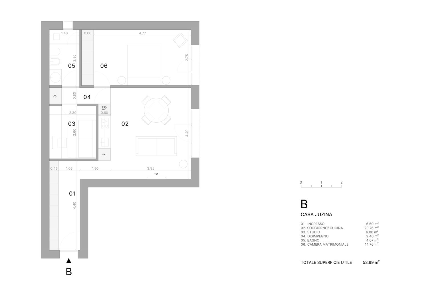L’ingresso dell’appartamento è valorizzato mediante l’utilizzo del corridoio, lungo il quale viene inserito un armadio a tutta altezza, ideale per riporre giacche e oggetti di uso quotidiano, contribuendo a mantenere ordine. Al termine del corridoio si accede alla zona giorno, concepita come un unico ambiente open-space soggiorno–cucina. Qui è previsto un arredo multifunzionale che integra la parete TV con la cucina, consentendo una soluzione compatta e versatile.