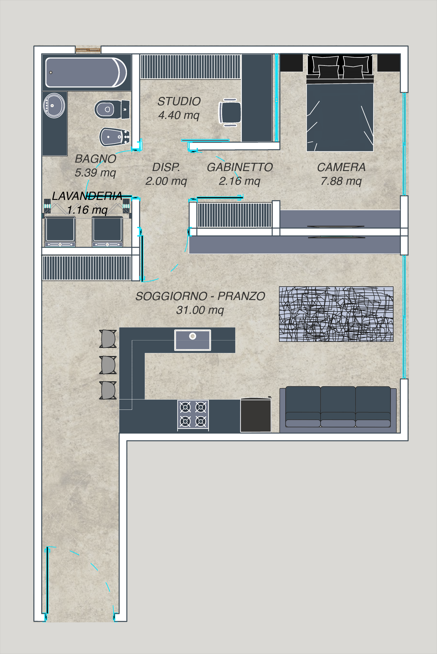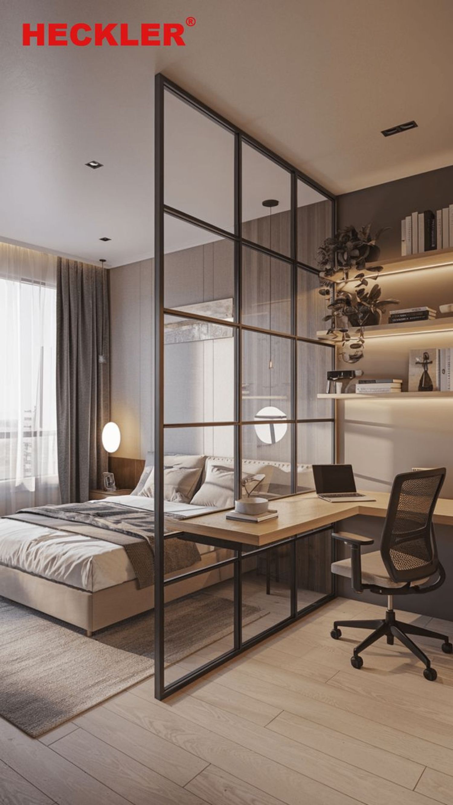 La casa si articola come una sequenza di atmosfere interconnesse, dove ogni spazio dialoga con gli altri attraverso luce, trasparenze e proporzioni. Lo studio, reinterpretato come ambiente di lavoro contemporaneo, diventa un punto focale di produttività e stile: visibile dall’area sociale, ma raccolto nella sua funzione. Si configura come uno spazio ibrido per il lavoro e la riflessione, delimitato da una parete vetrata in stile industriale poggiata su un basamento alto un metro. Questa parete non si limita a separare, ma svela: consente all’architettura di respirare, alla luce di fluire liberamente e all’utente di sentirsi parte di un sistema coerente ed elegante, immerso nella luminosità naturale e valorizzato dalla vista sulle finestre