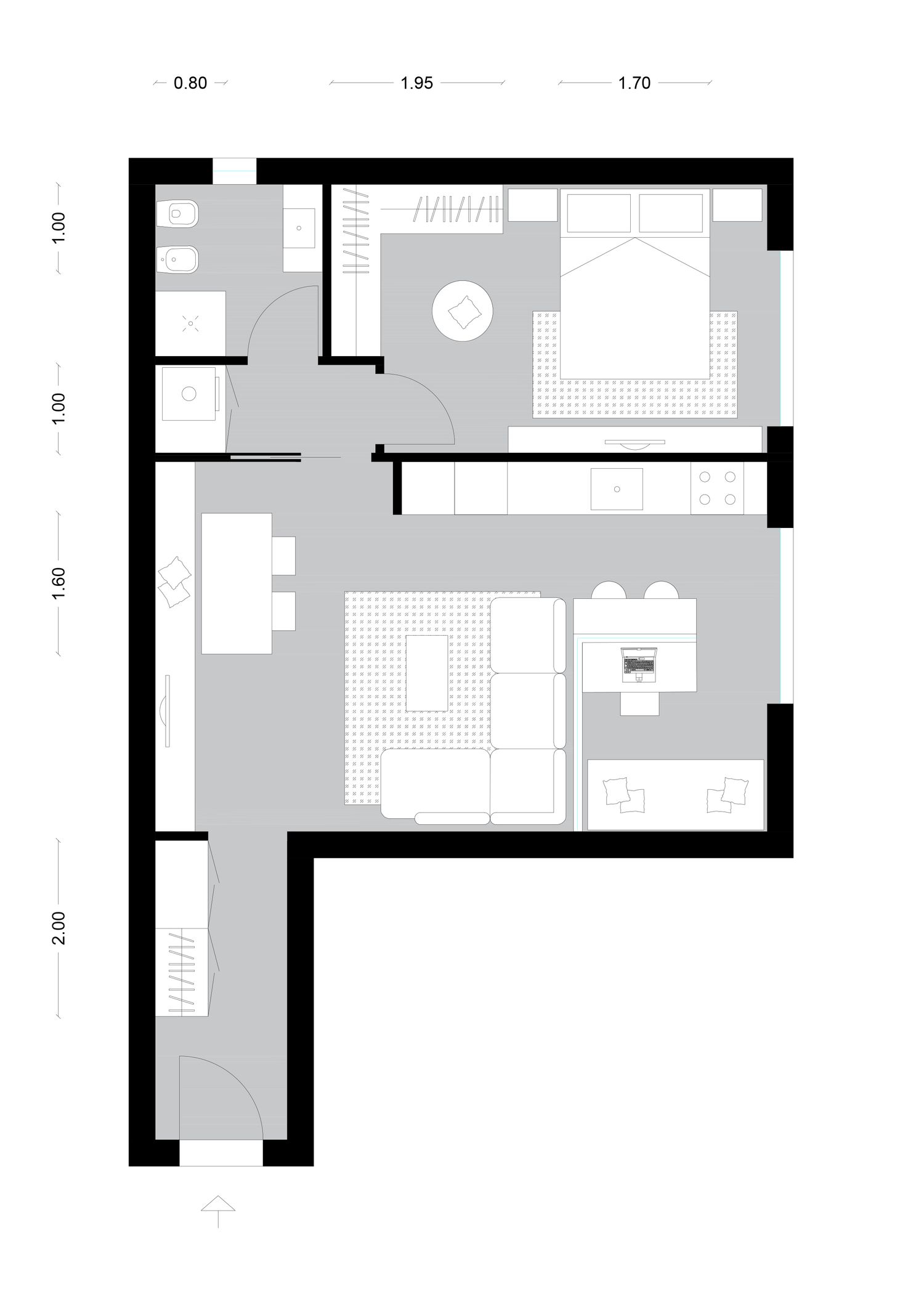 Questo appartamento seppur piccolo mi ha ispirato la scelta di un gres grigio scuro per tutte le stanze. le pareti bianche daranno ariosità e leggerezza. Allego immagini di riferimento di finiture e arredi che suggerisco. Mi interessava ricavare molto contenimento, che non basta mai, e spazi funzionali anche per ospiti. La scelta di un tavolo pranzo posizionato così permette di considerarne uno allungabile e avere non poche persone a tavola ol tre che comodi passaggi. Spero piaccia. Ciao