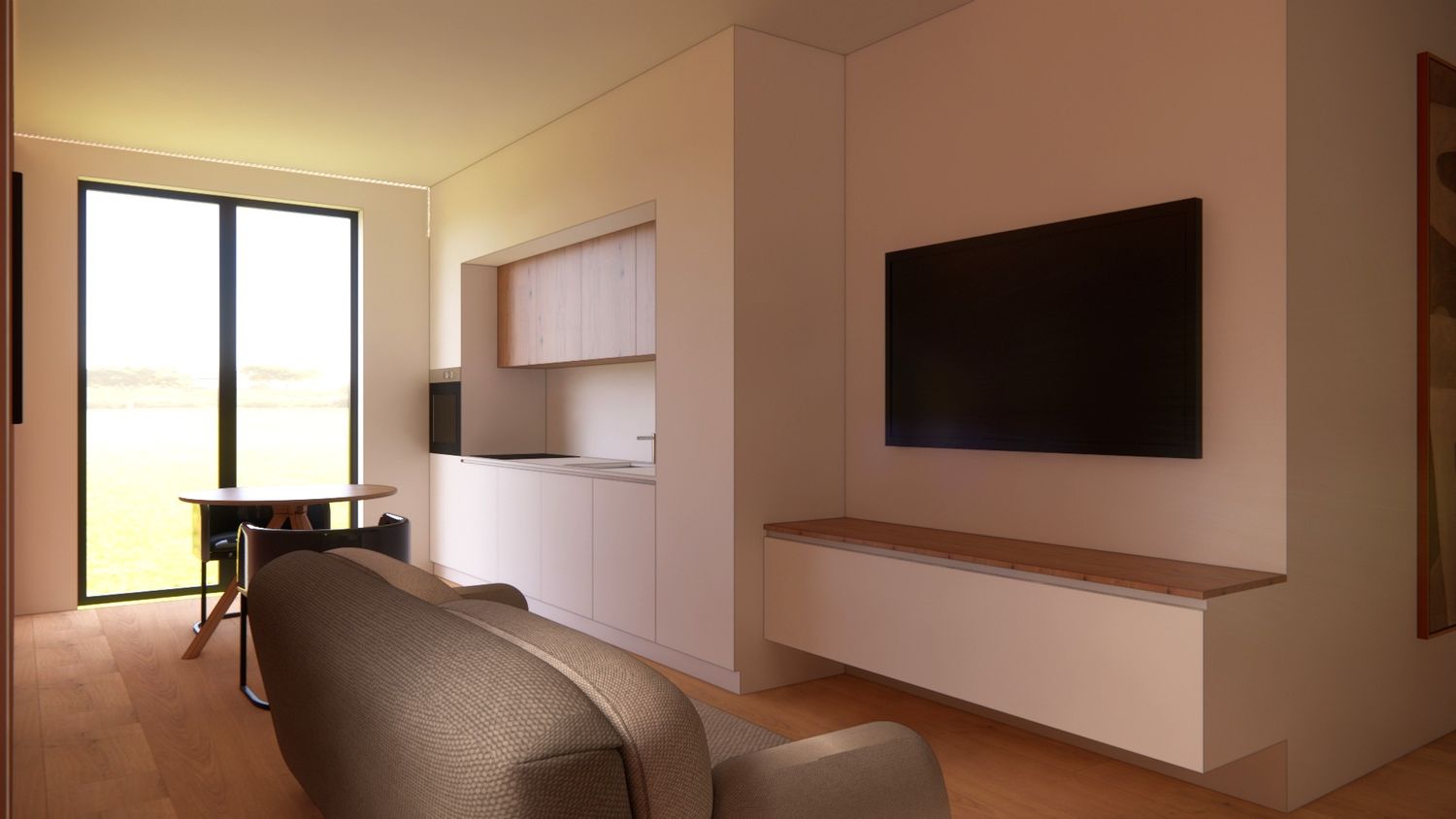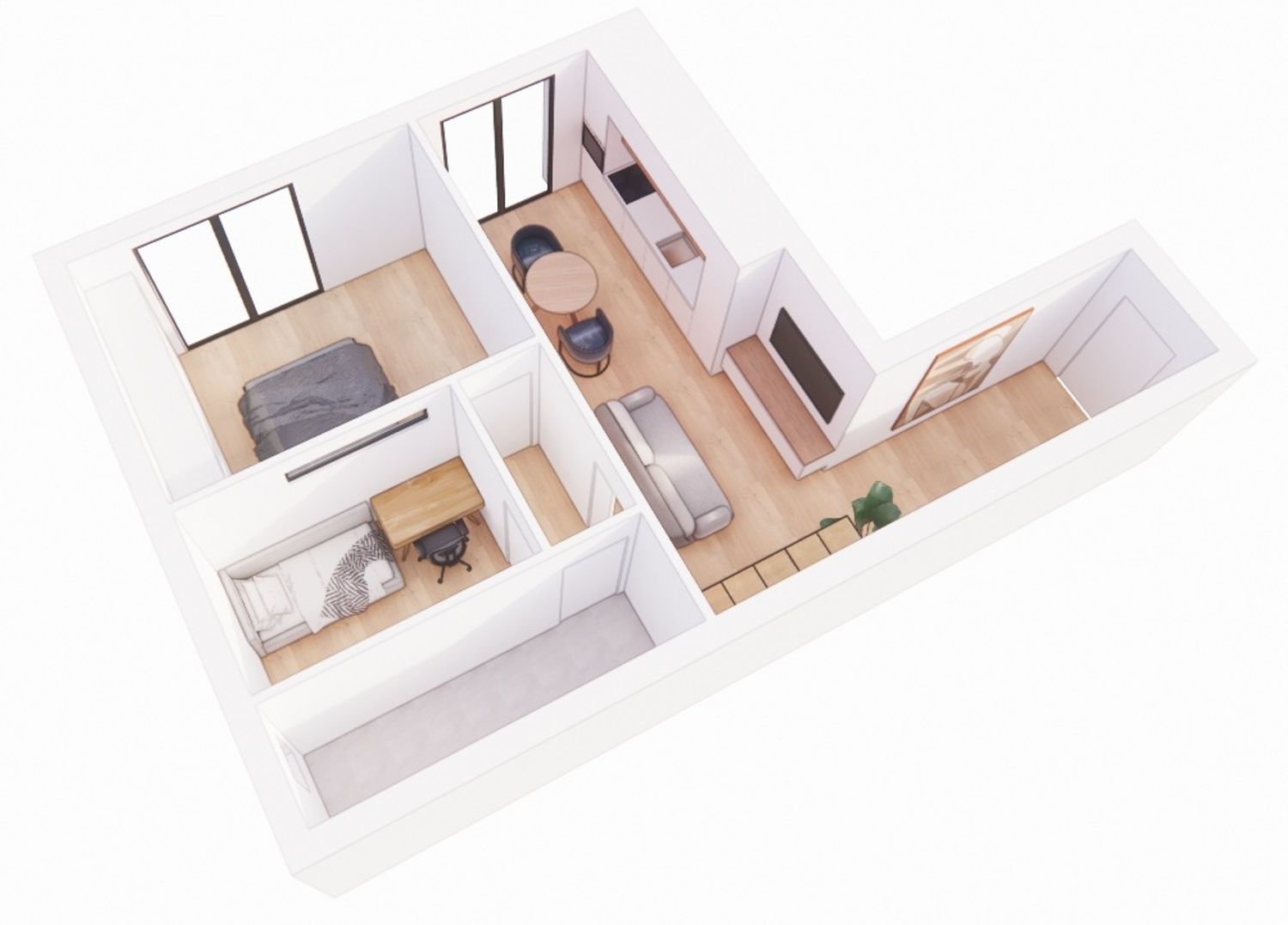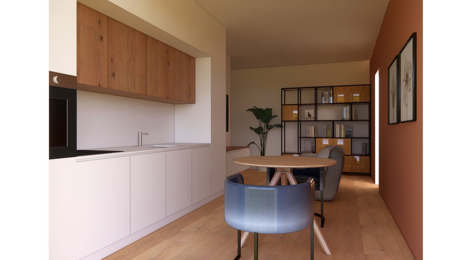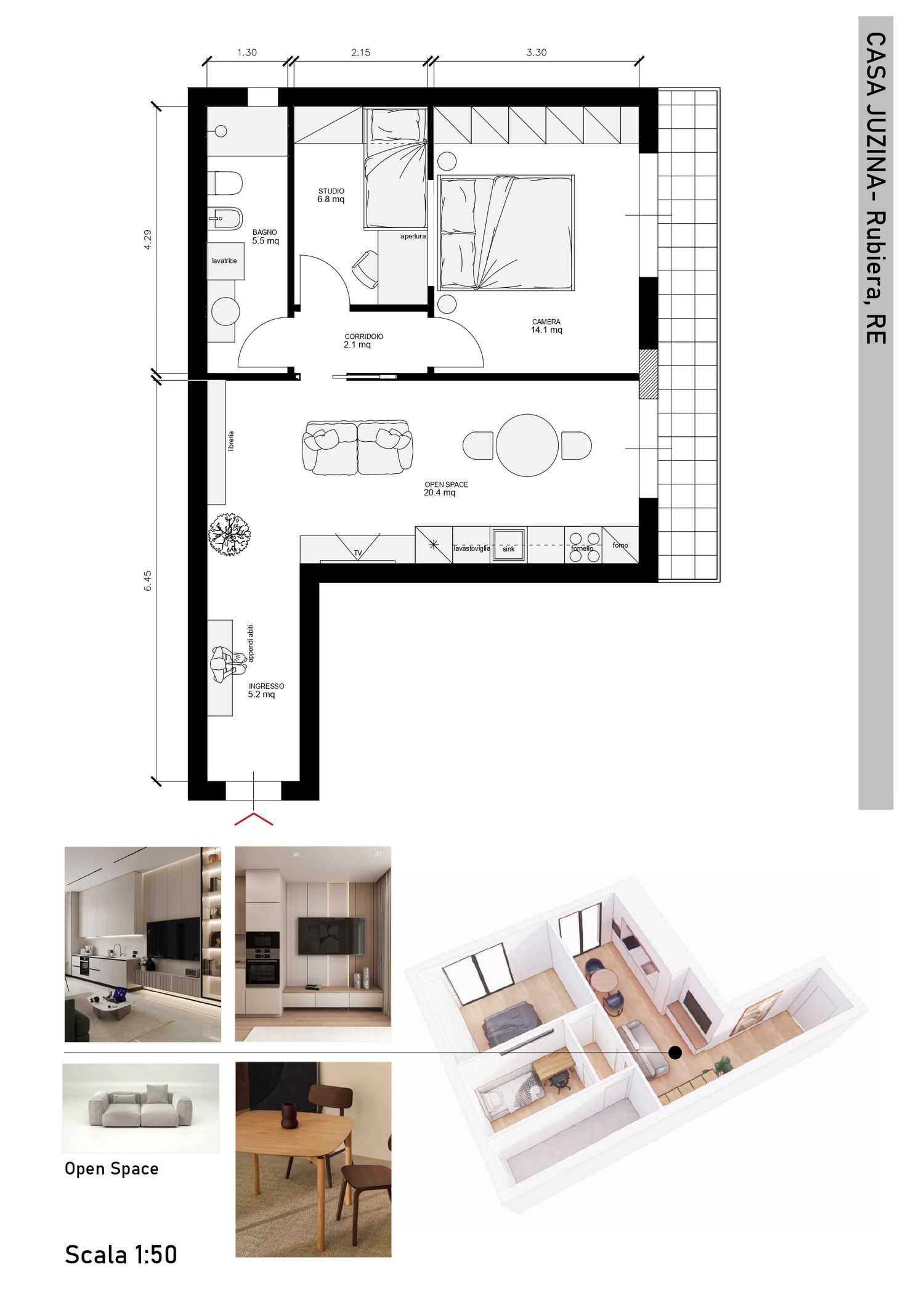 L'idea progettuale consiste nel creare due zone ben distinte, una zona notte e una zona living/open space. La zona notte è composta da camera matrimoniale, bagno e studio con un punto luce sulla camera. La zona giorno vede un'area cucina e una zona relax unite tra di loro mediante un arredo uniforme.